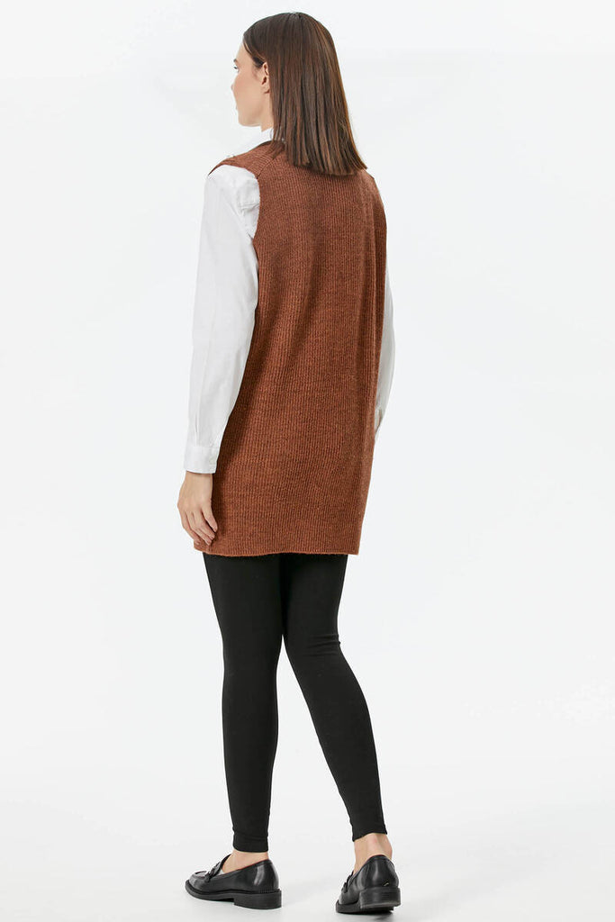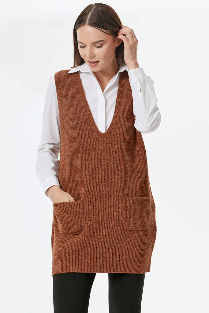 Derin V Yaka Cepli Uzun Triko Süveter - Taba