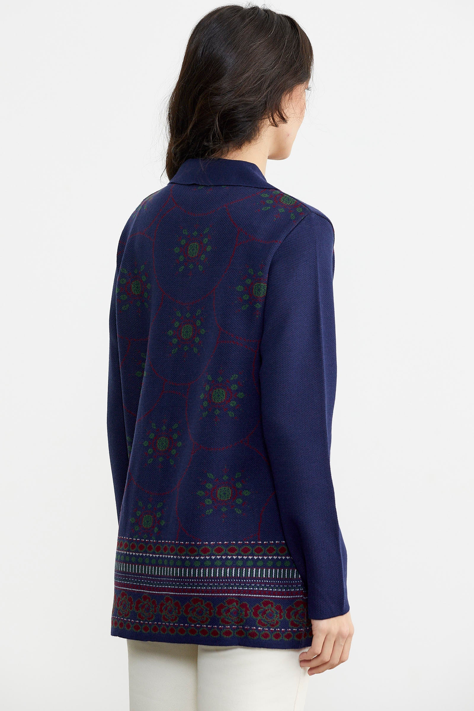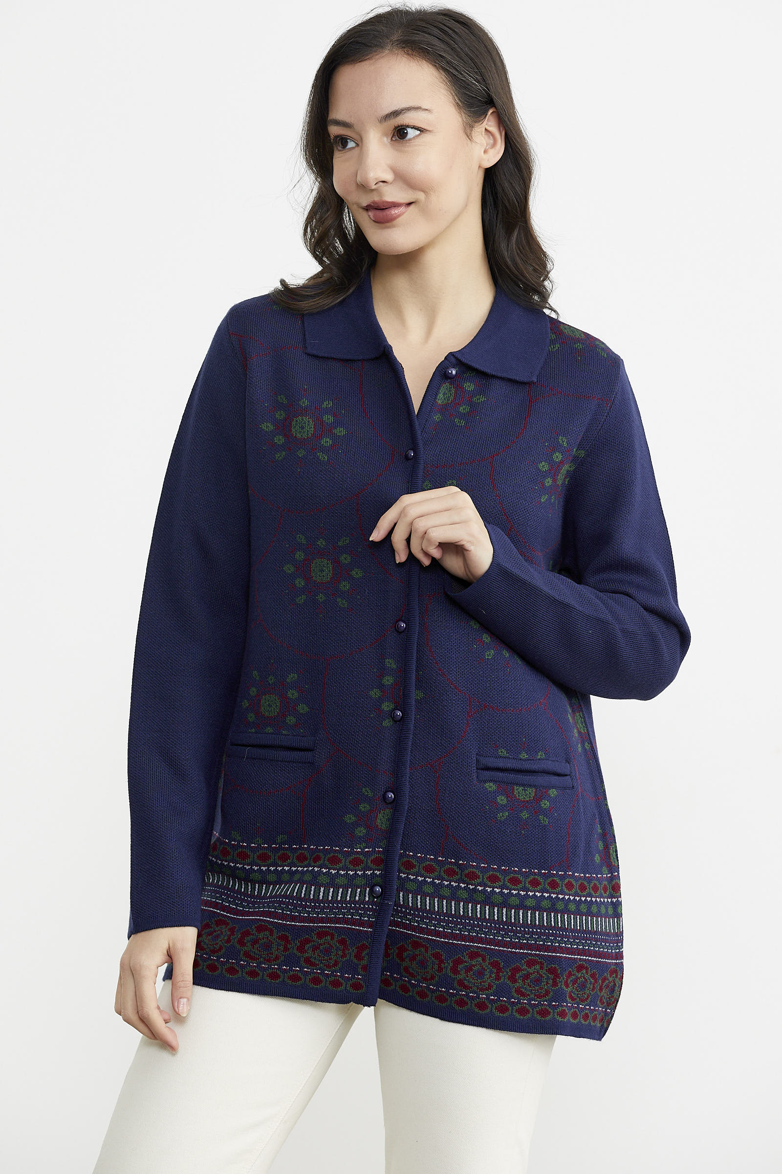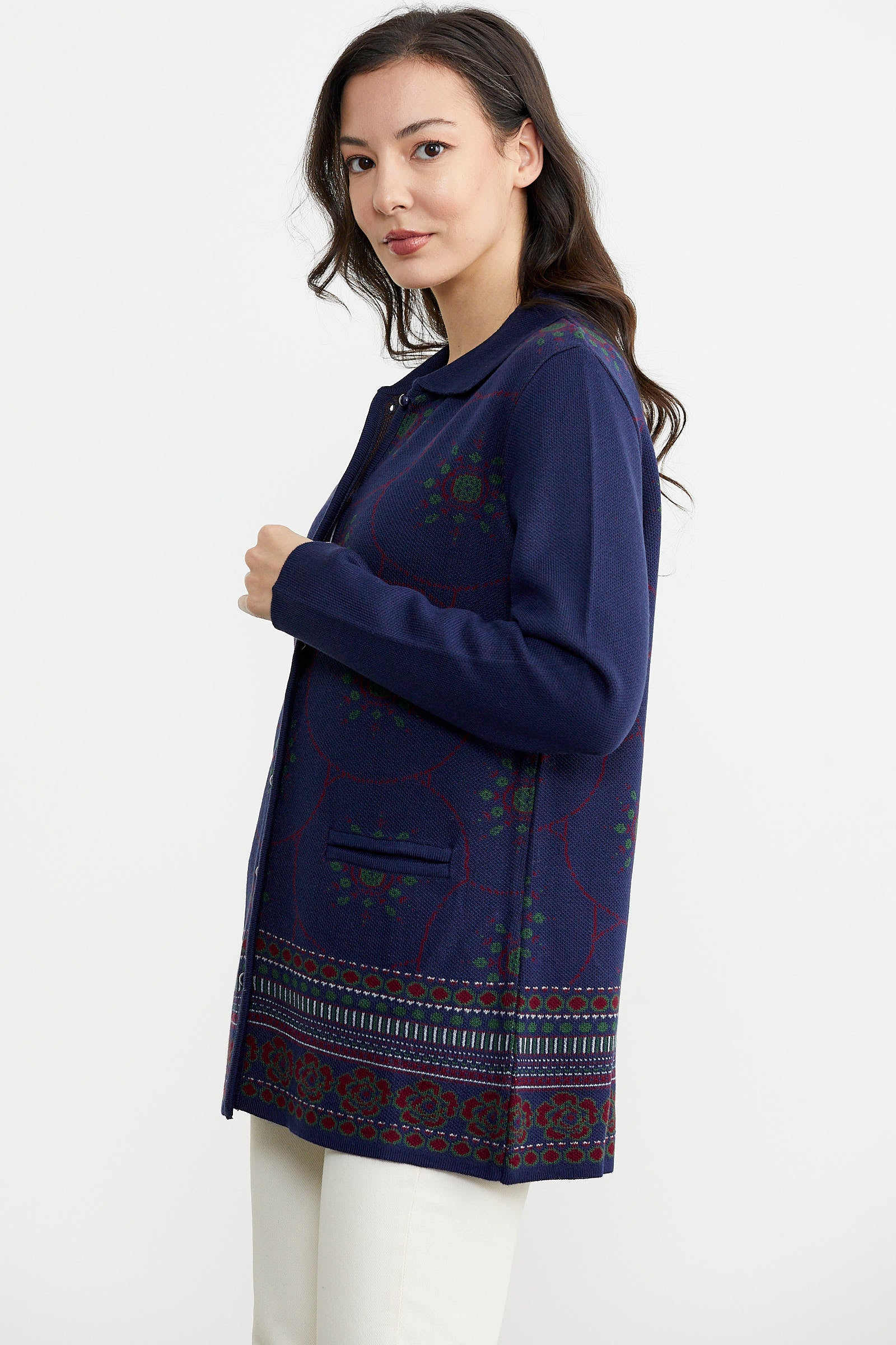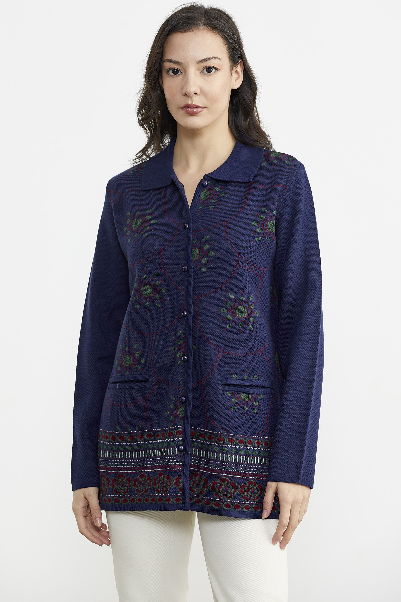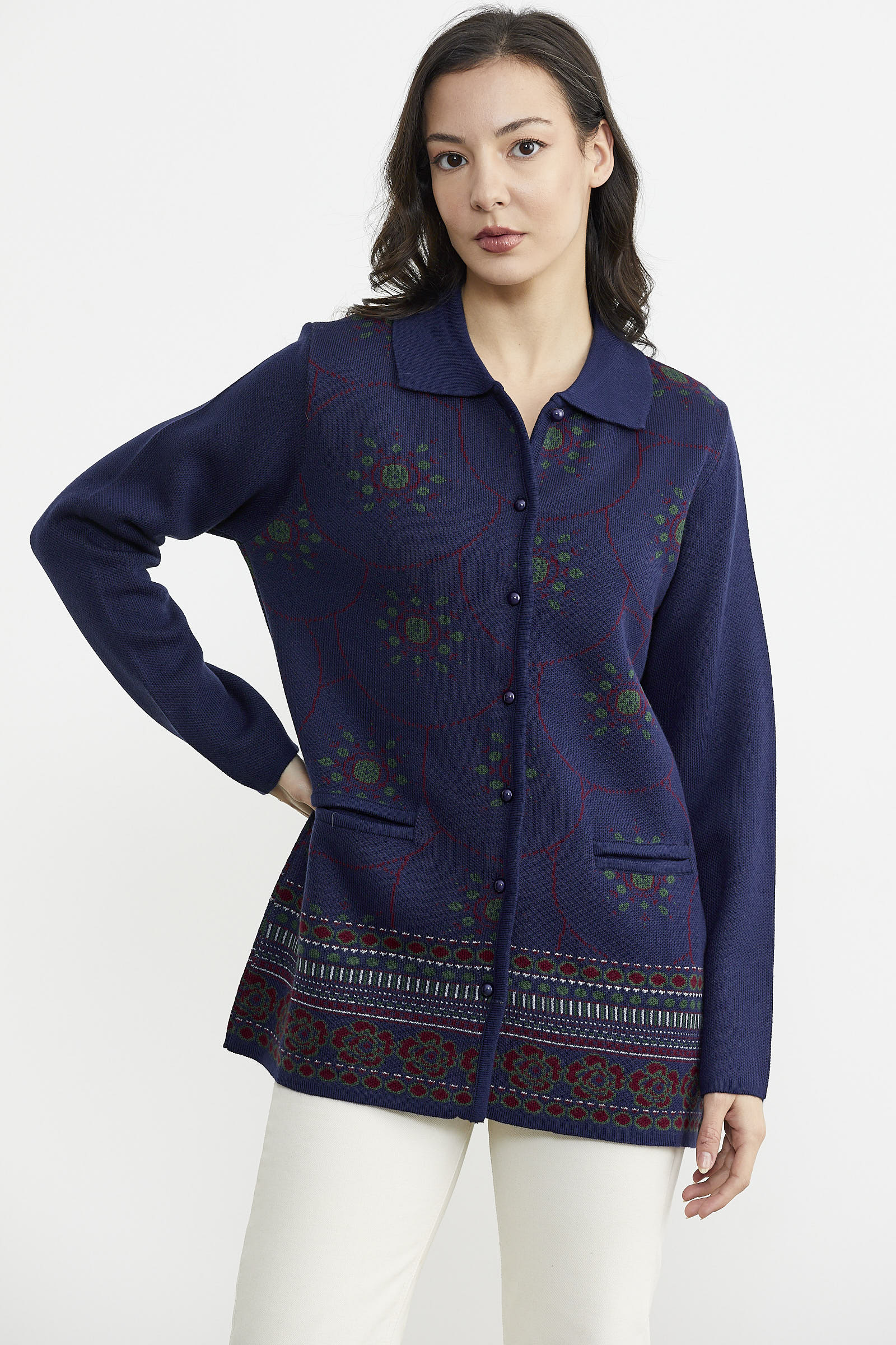 Önden düğmeli, gömlek yaka, uzun kollu, iki ön cebe sahip desenli esnek dokulu triko ceket etnik tasarımı ile dikkatleri çekiyor. Kolaylıkla kombinlerken konforu yakalayabilirsiniz.