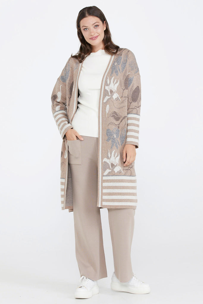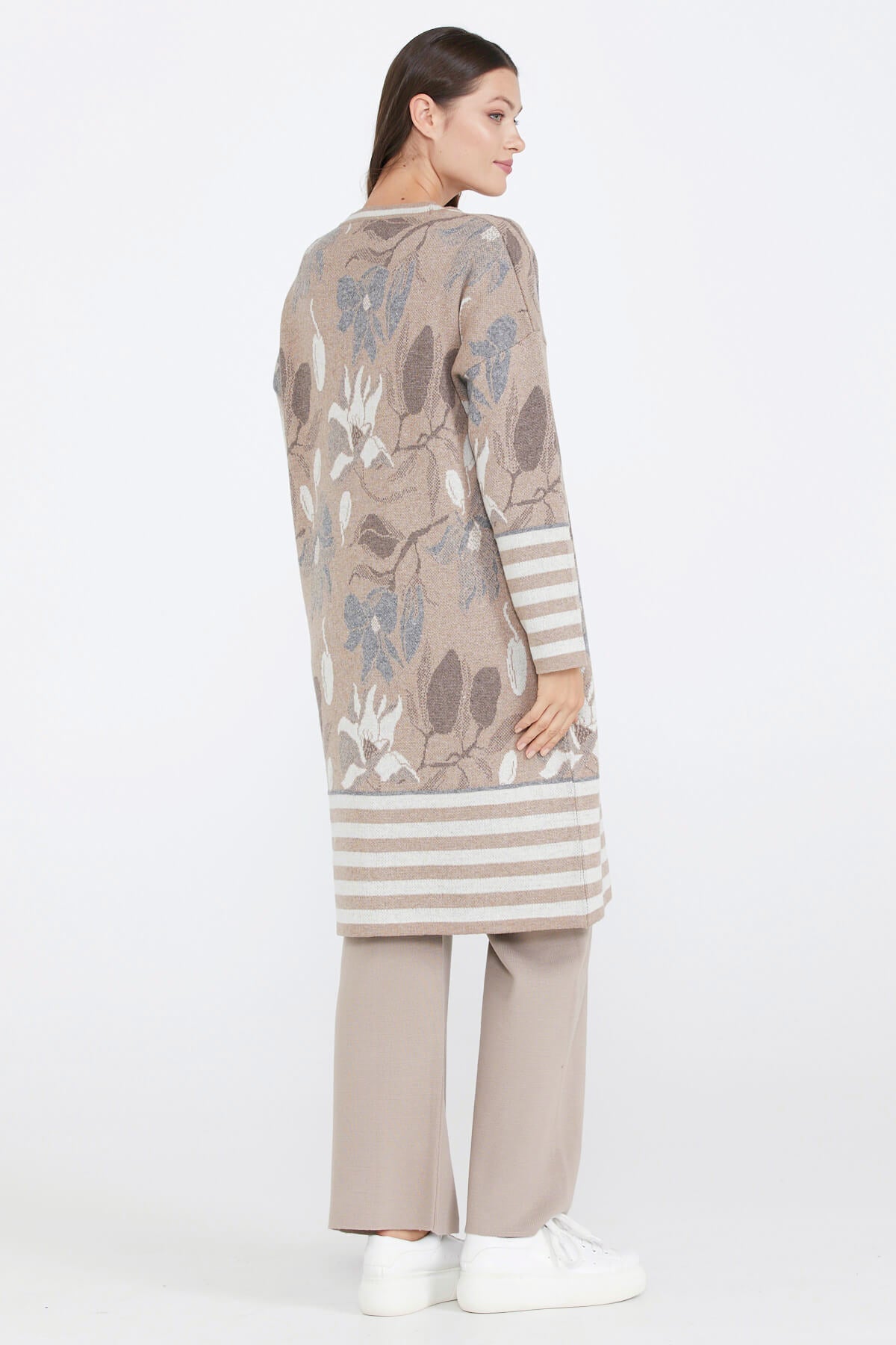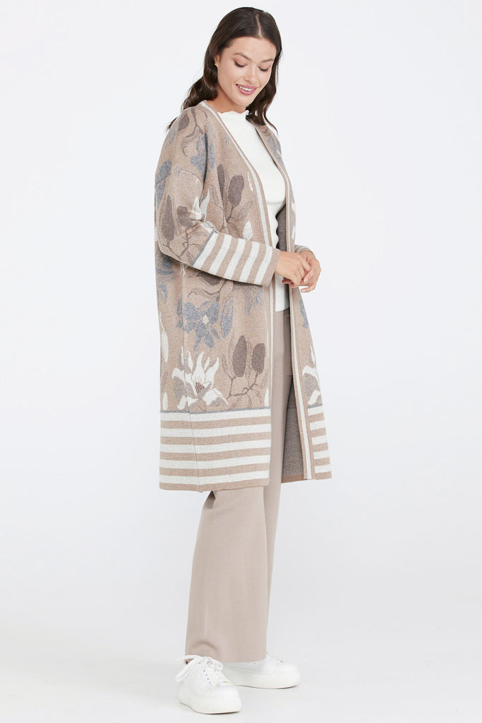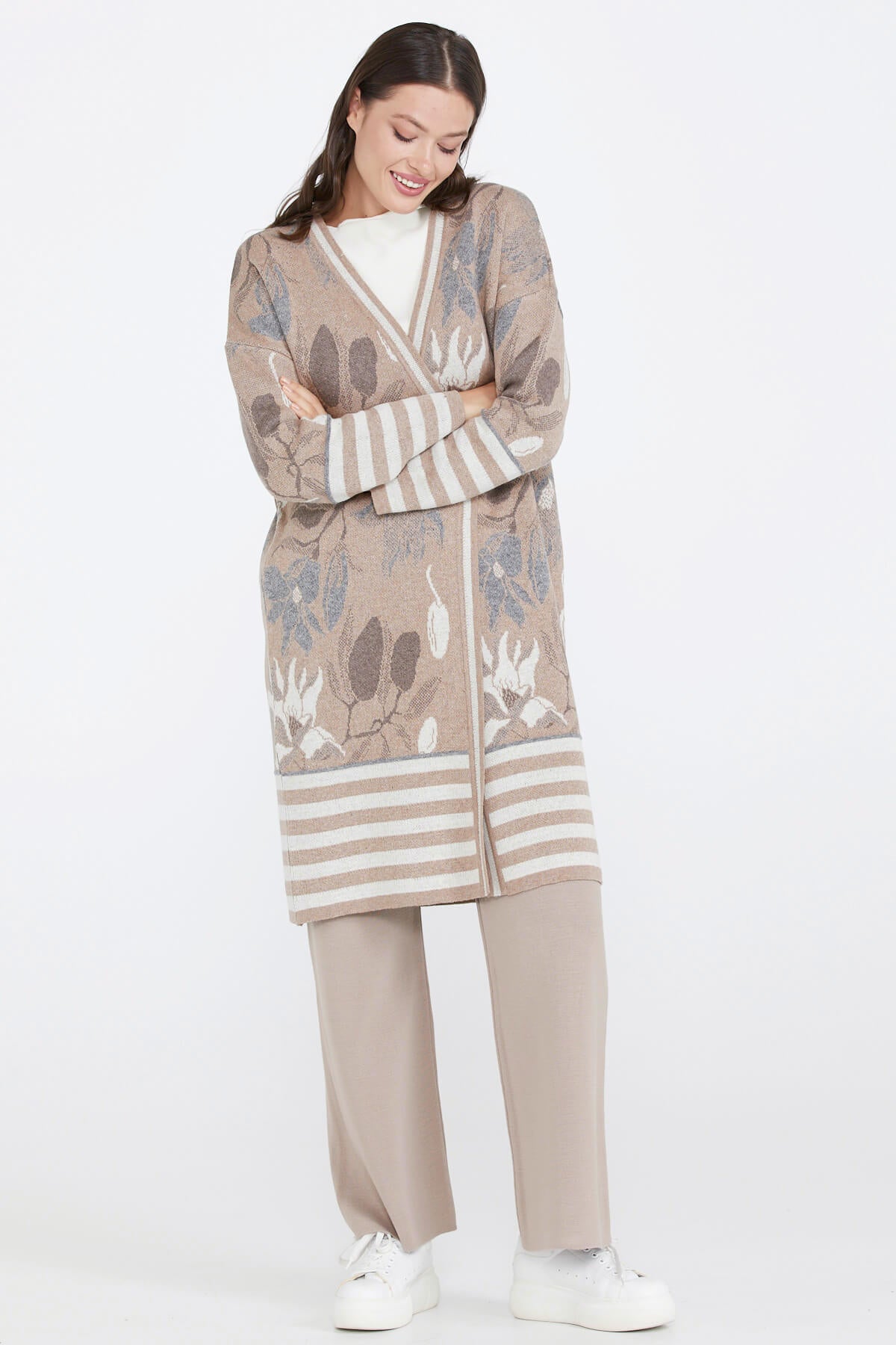 Yün karışımlı iplikten üretilen, v yaka, çiçek desenli triko ceket ile şık bir görünüm yakalayabilirsiniz.