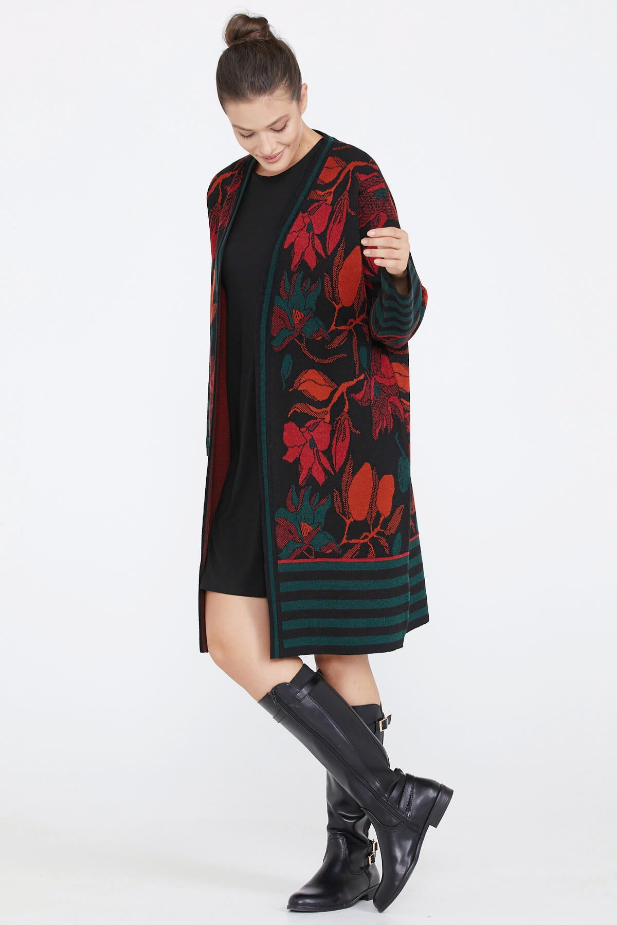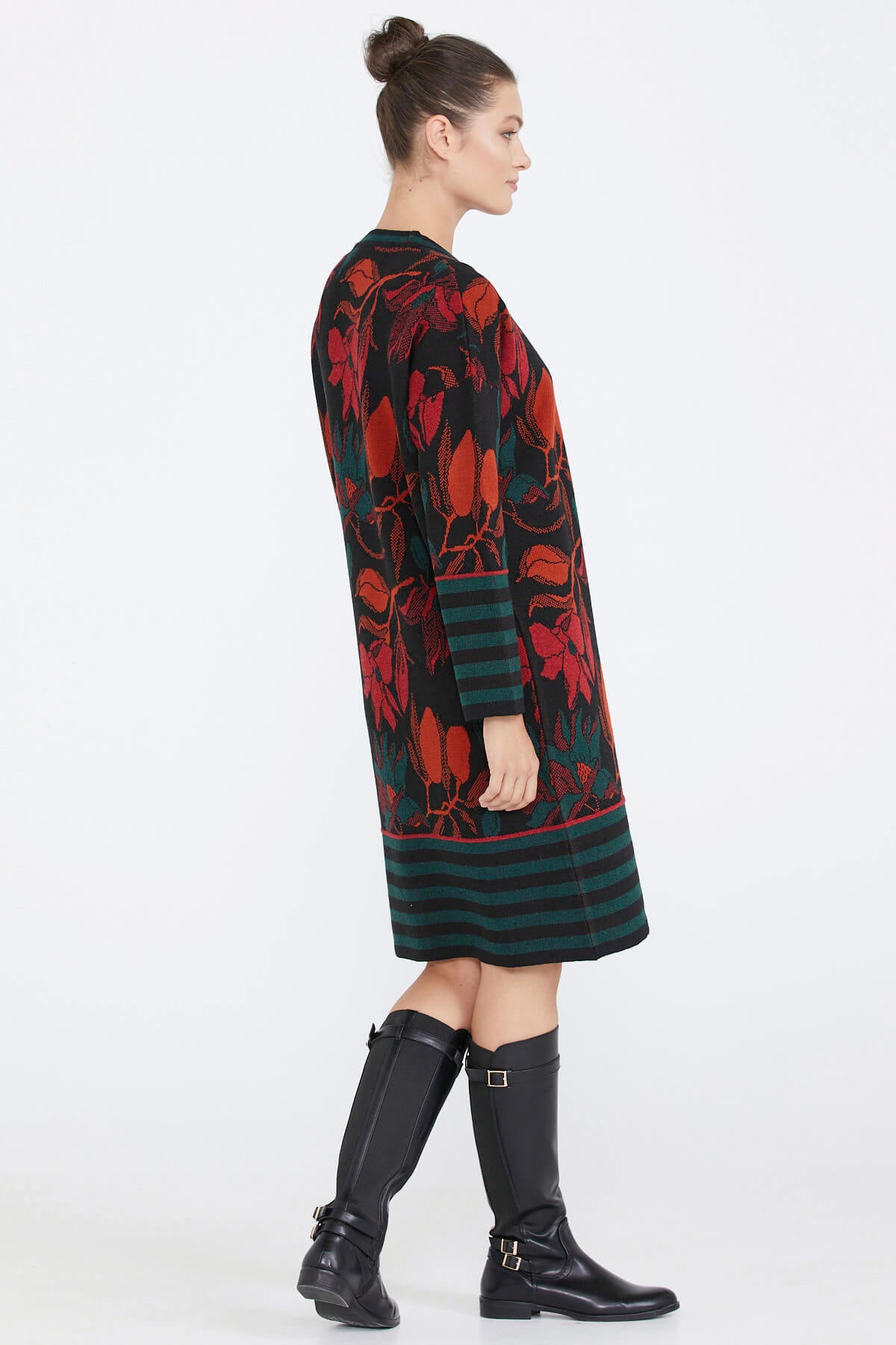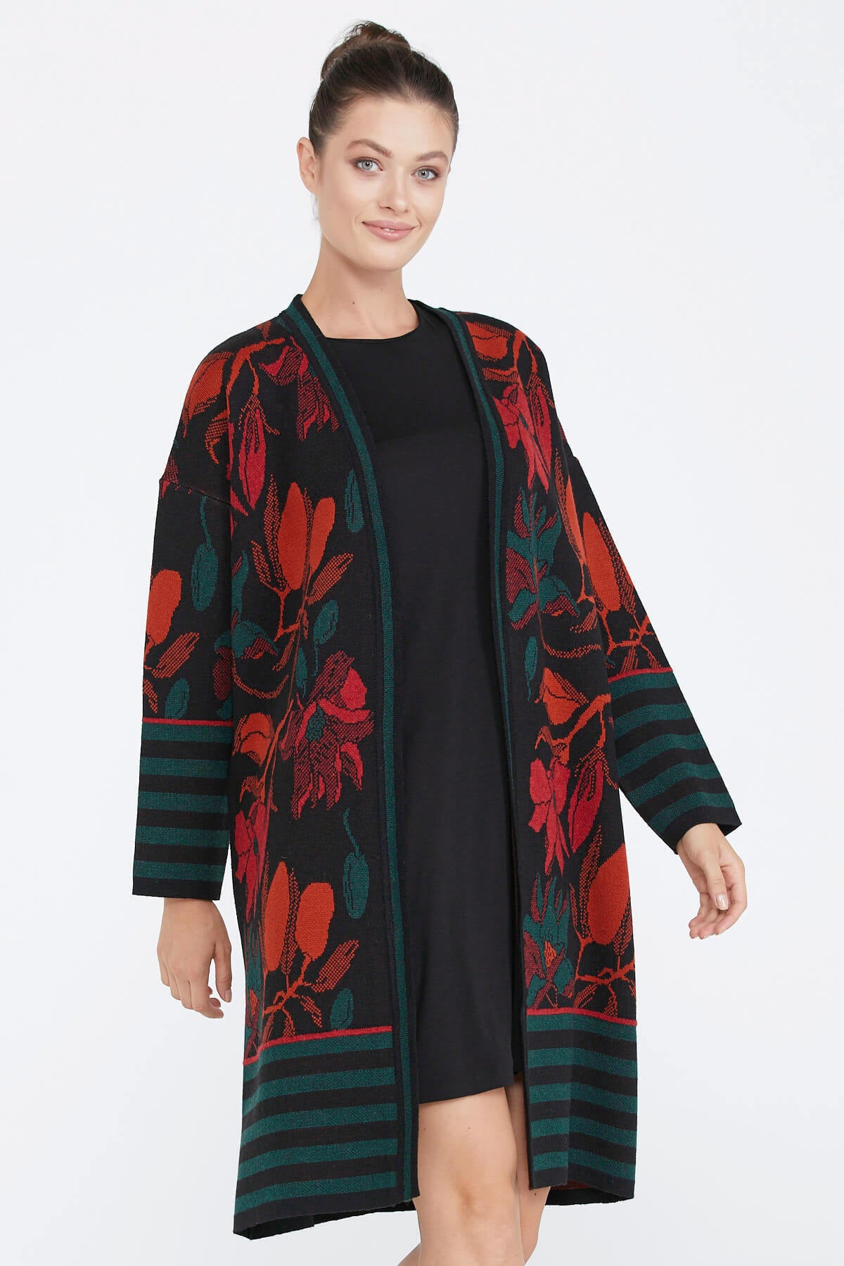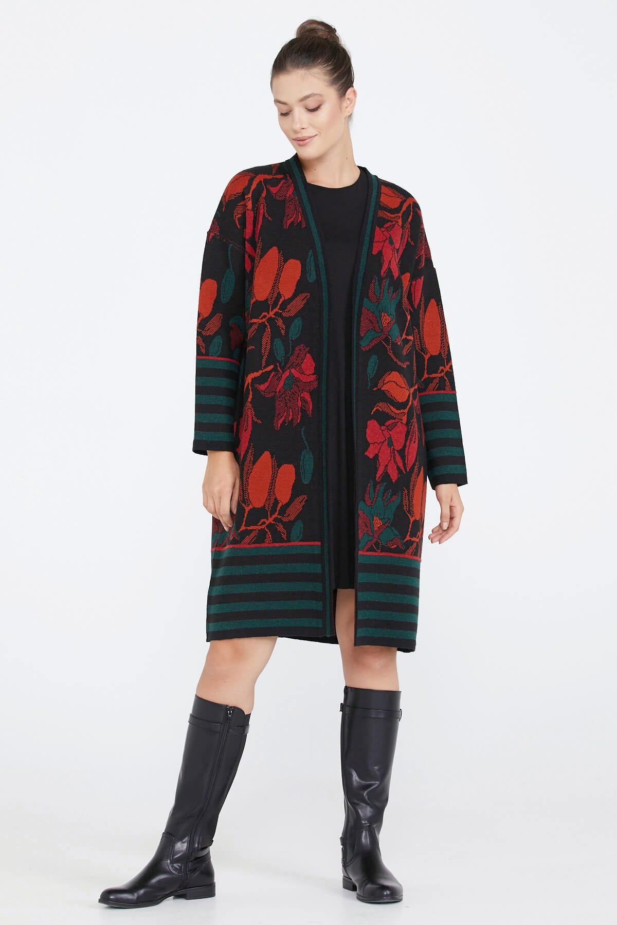 Yün karışımlı iplikten üretilen, v yaka, çiçek desenli triko ceket ile şık bir görünüm yakalayabilirsiniz.