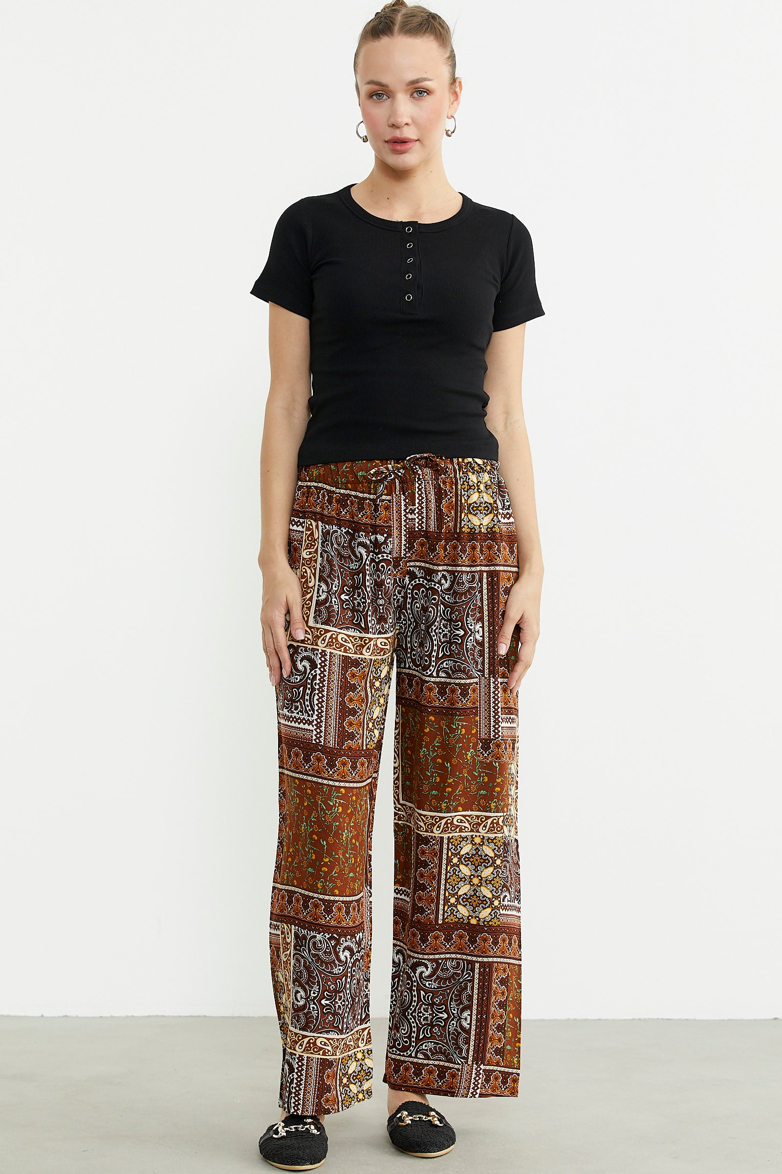 Yüksek bel lastikli pantolon, desenli ve renklidir. İlkbahar/Yaz mevsim koşullarına uygun olarak üretilmiştir.