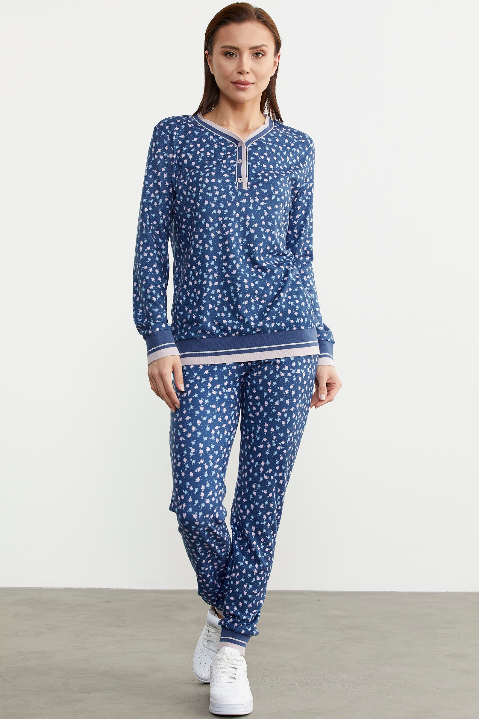 Desenli yumoş pijama, triko biyelerle hareketlendirilmiştir. Uyku konforunuza kalitesiyle eşlik edecektir.