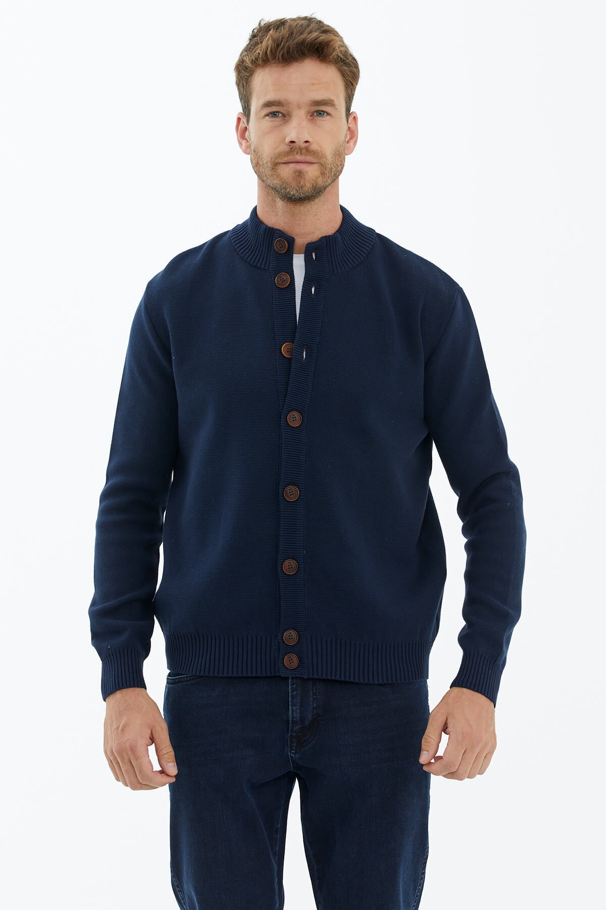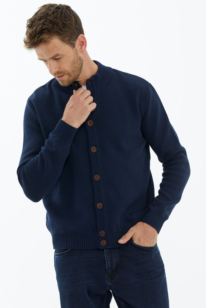 Dik Yaka Düğmeli Triko Hırka - Lacivert