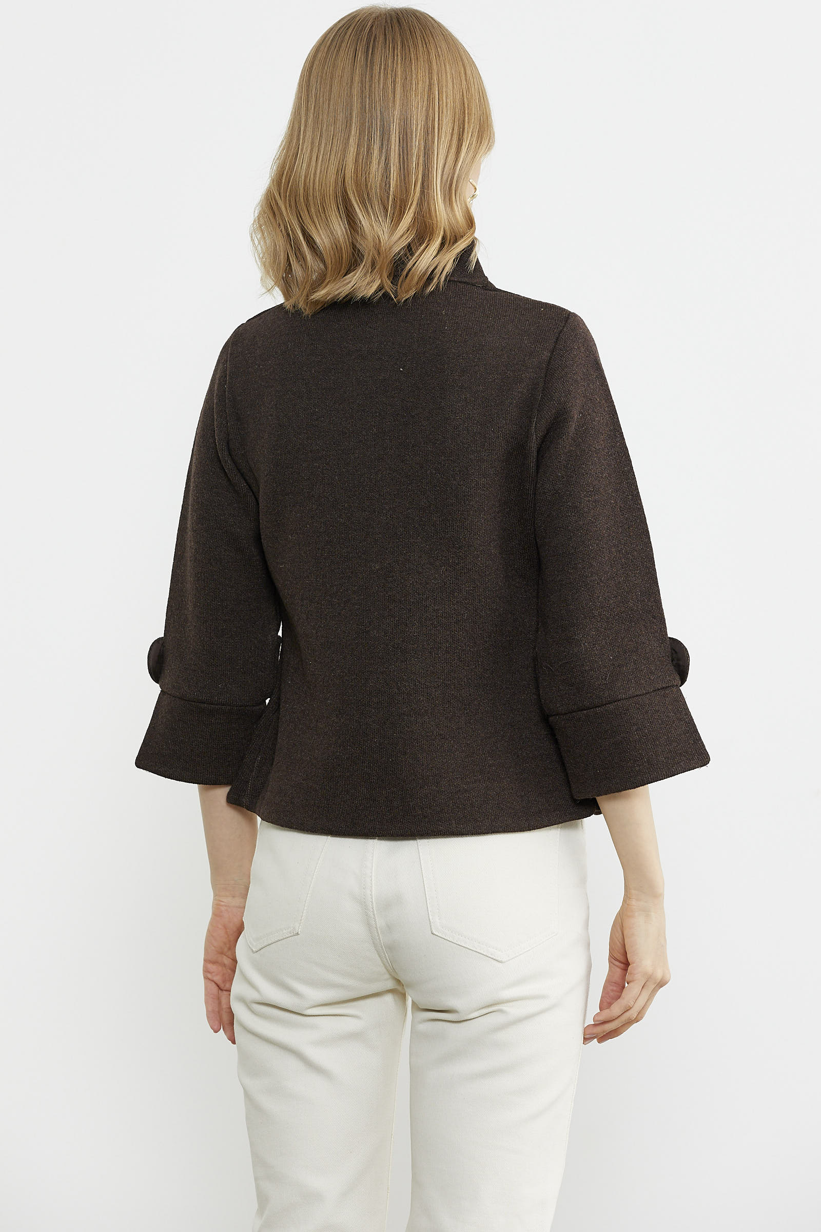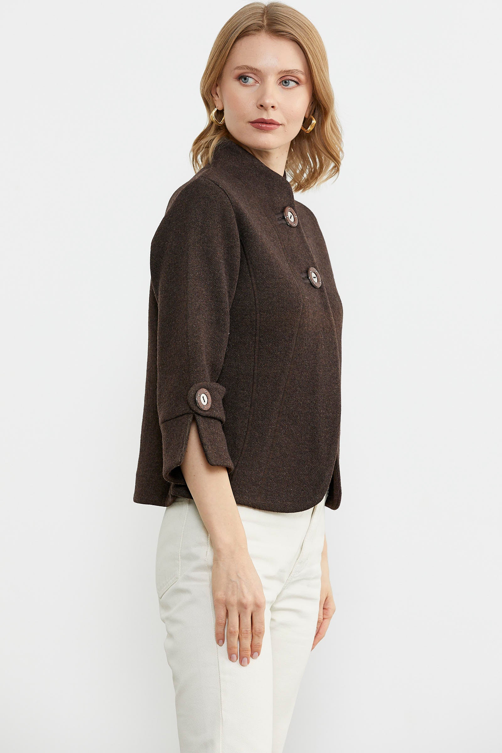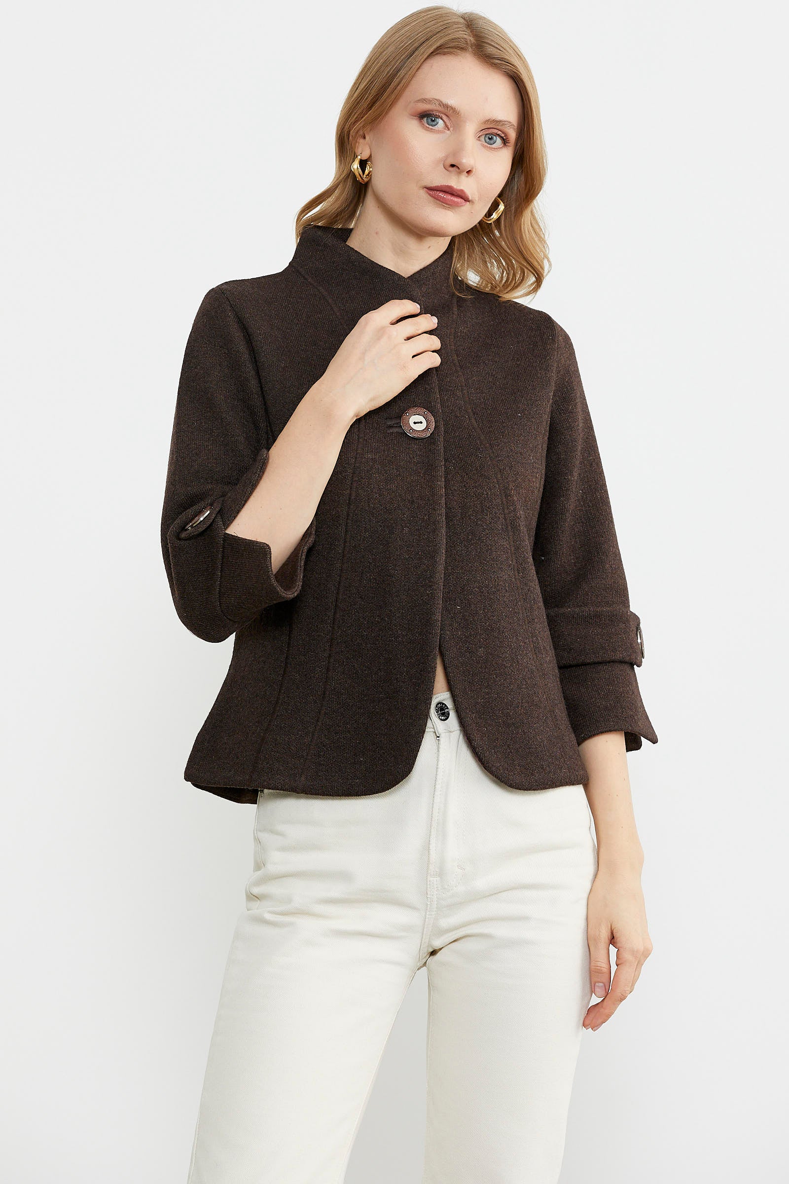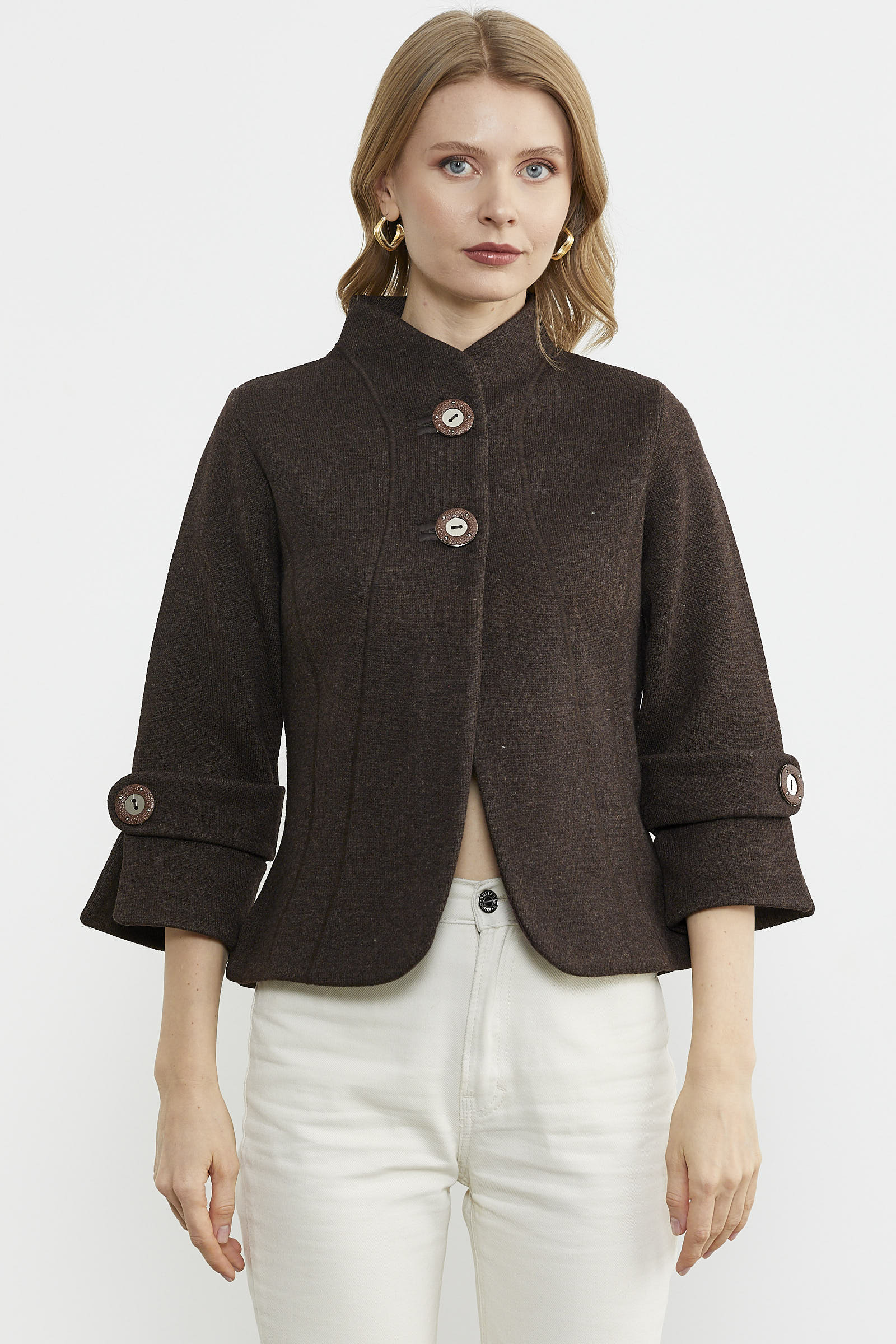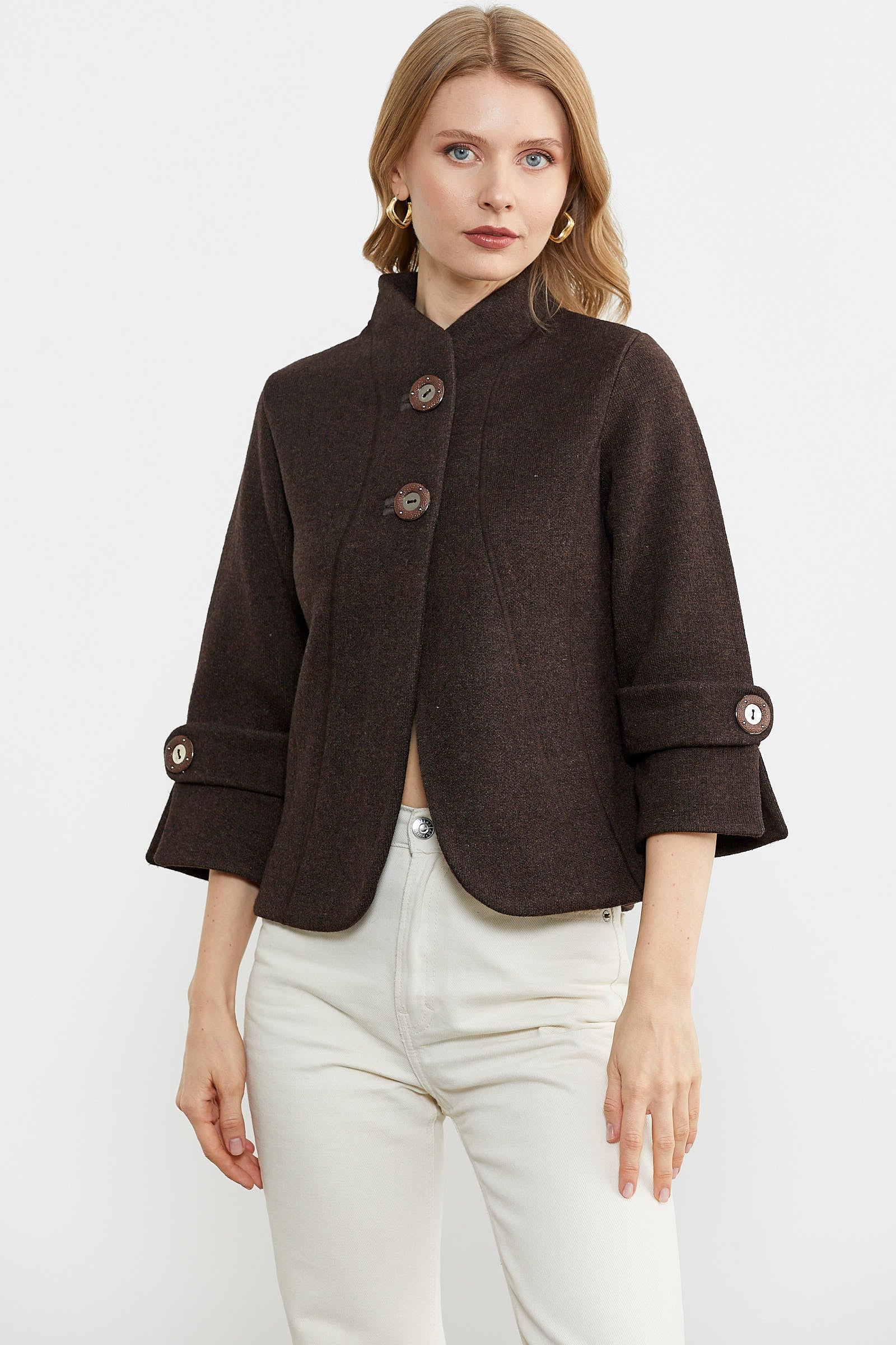 Dik Yaka Kalın Yünlü Triko Ceket - Kahve - Vizon