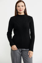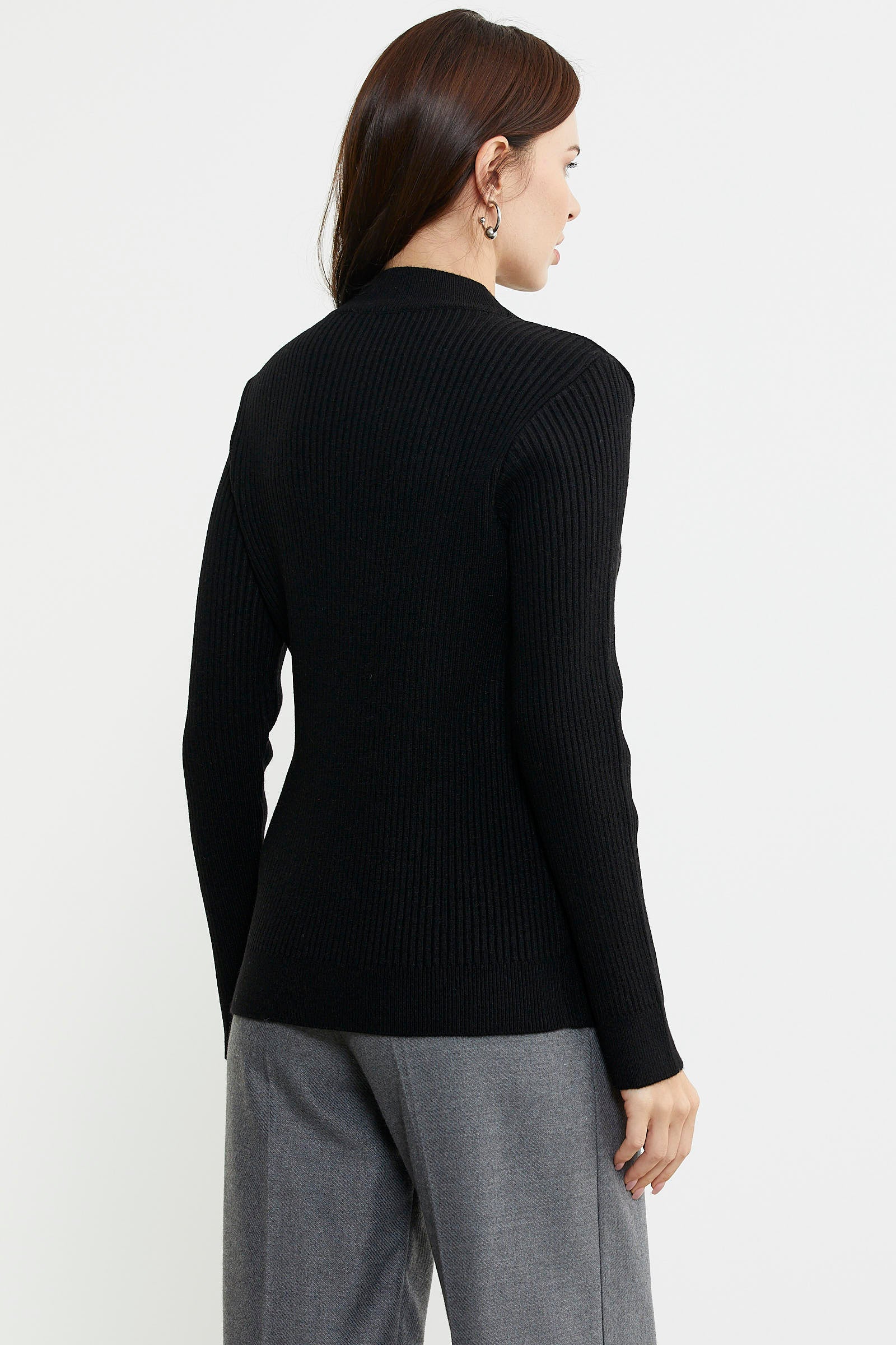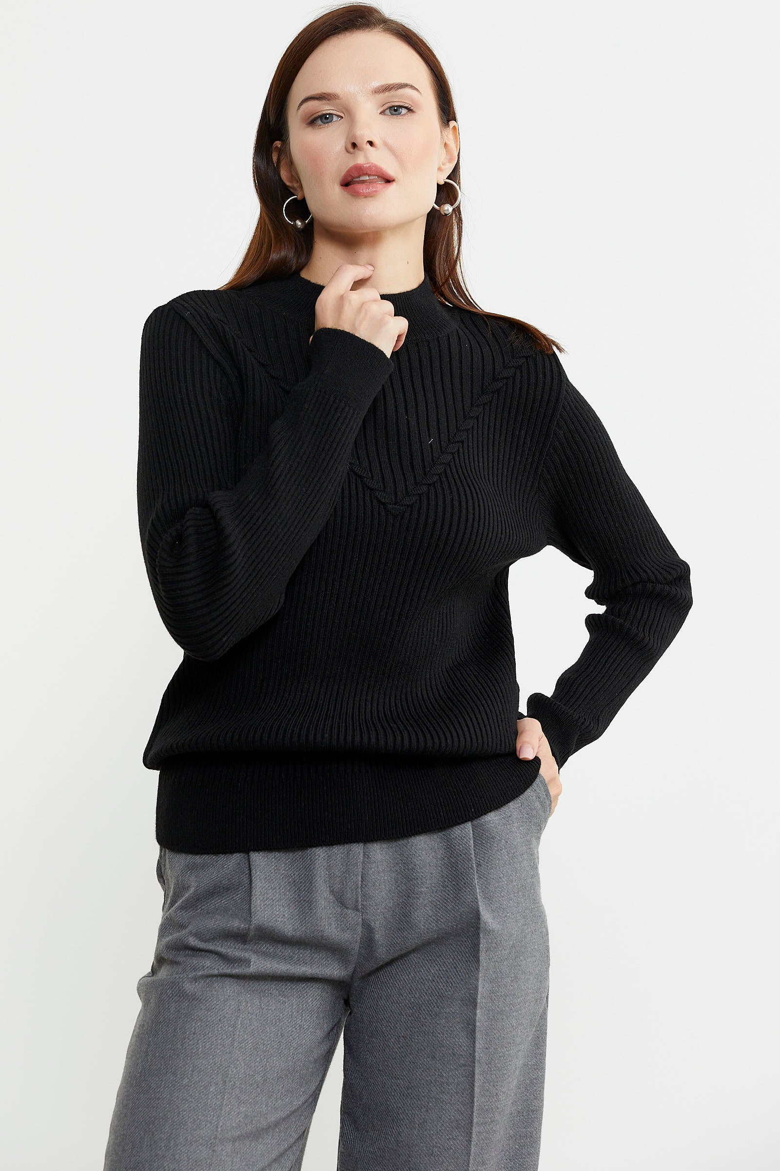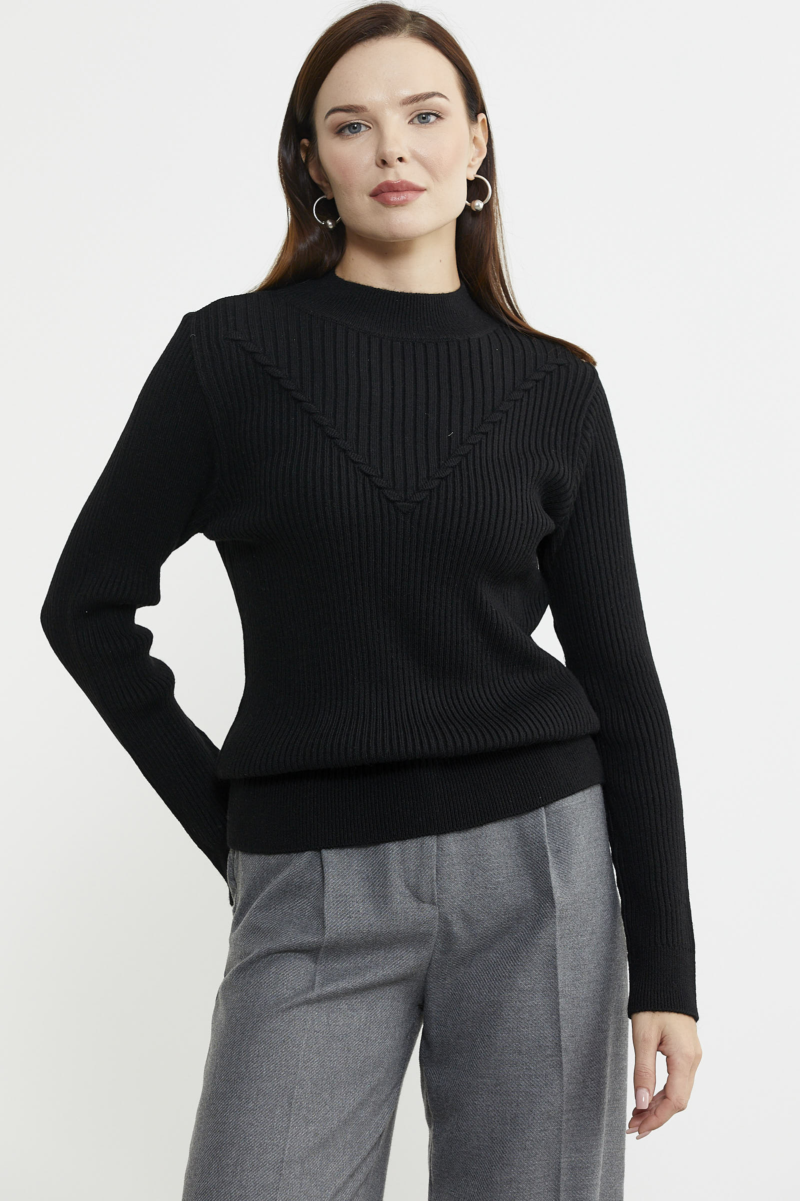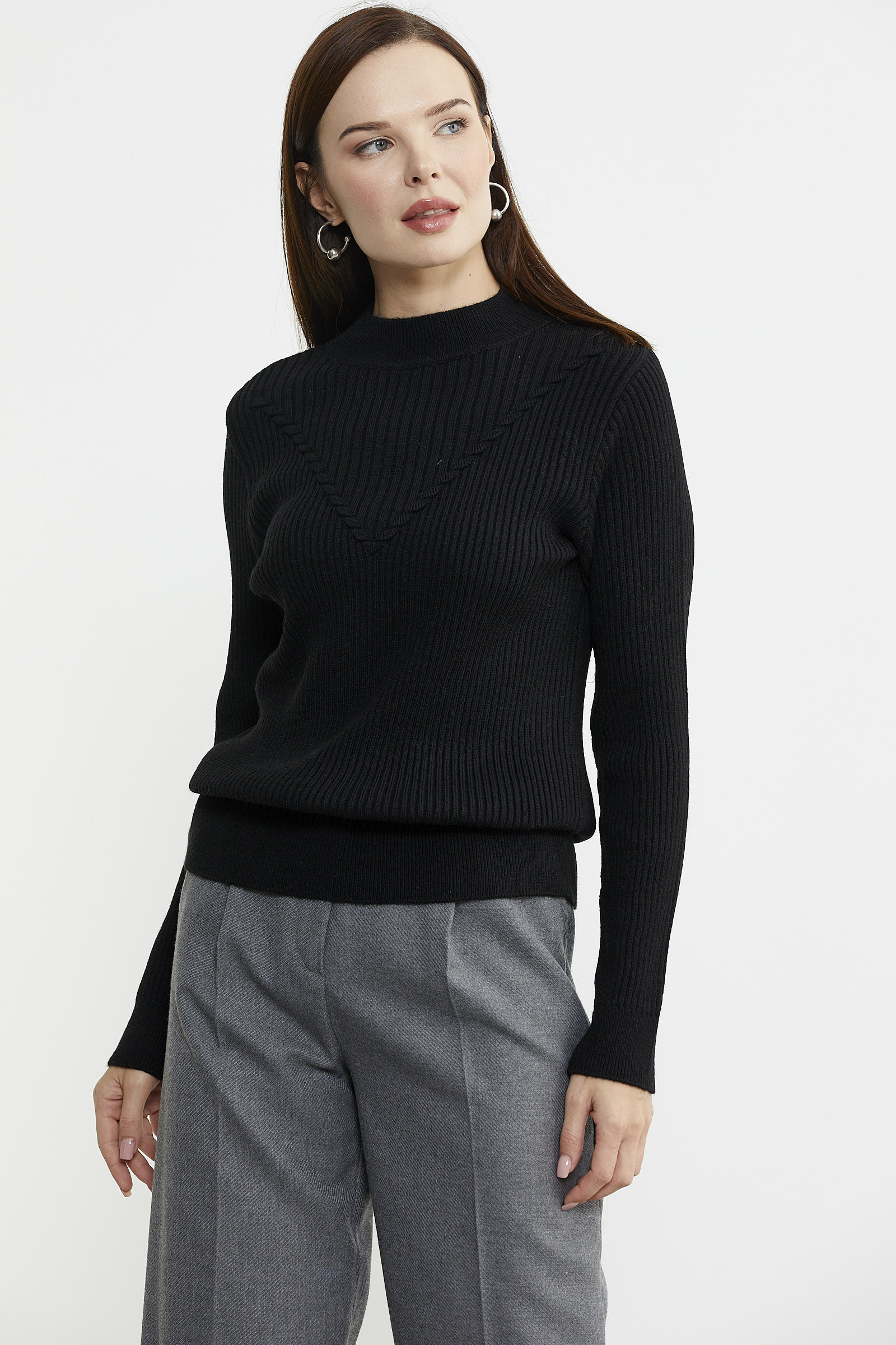 İnce derbili, dik yaka triko kazak. Ön bedende motif detayı, kol ve etek ucunda lastik örme kullanılmıştır.