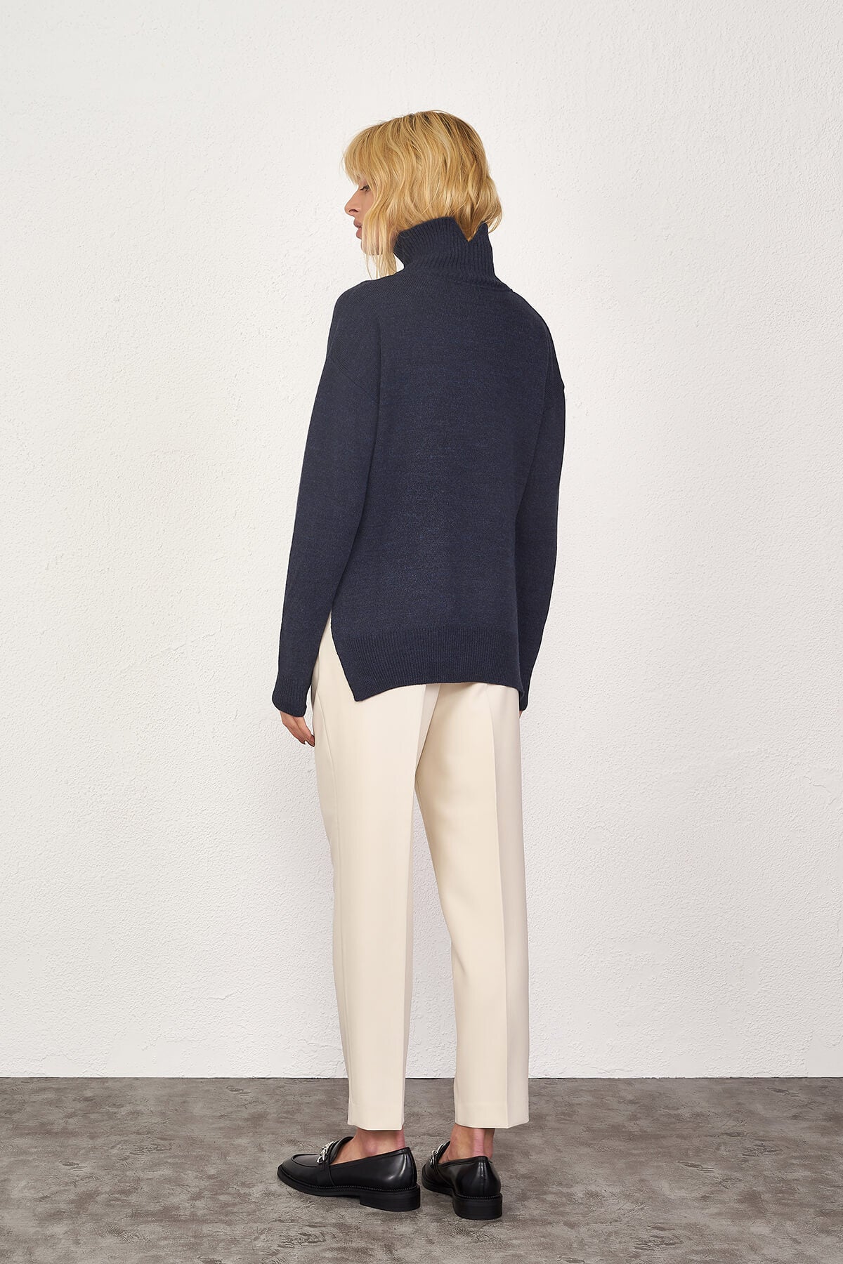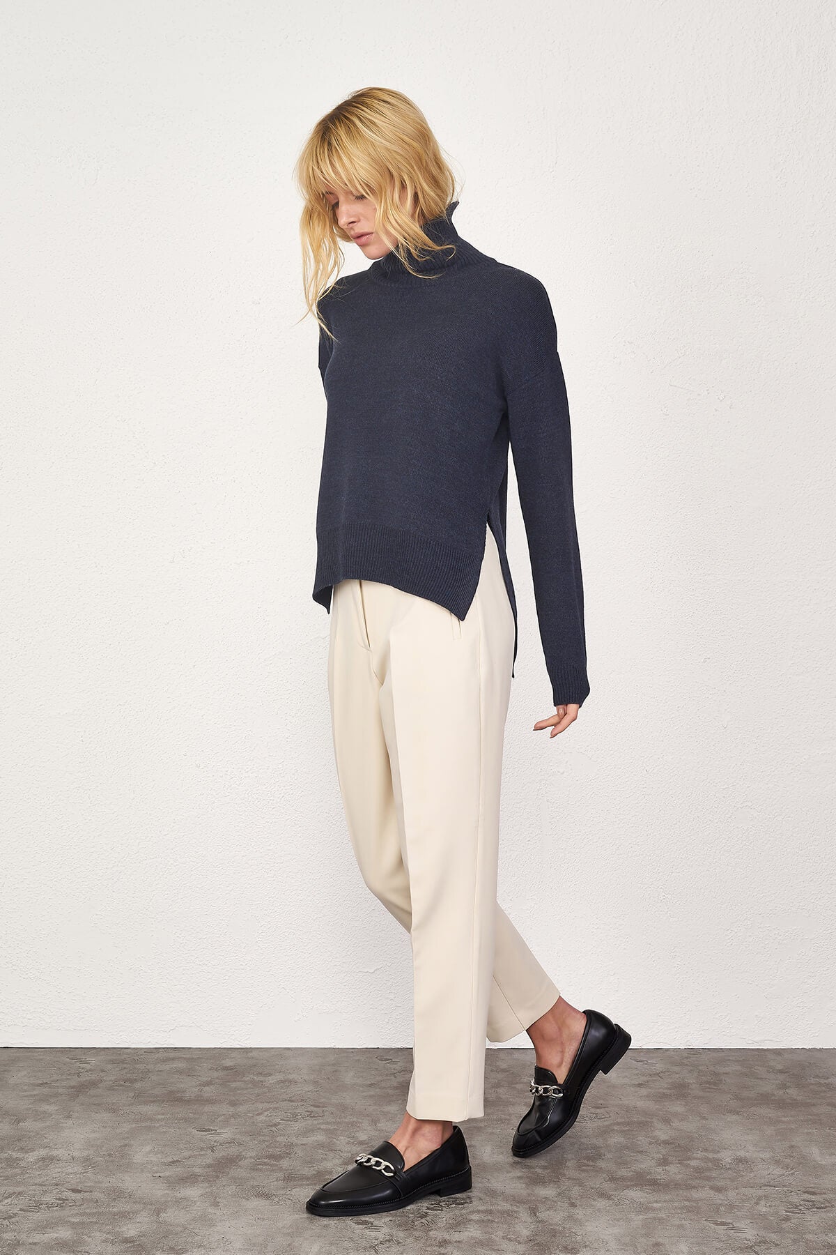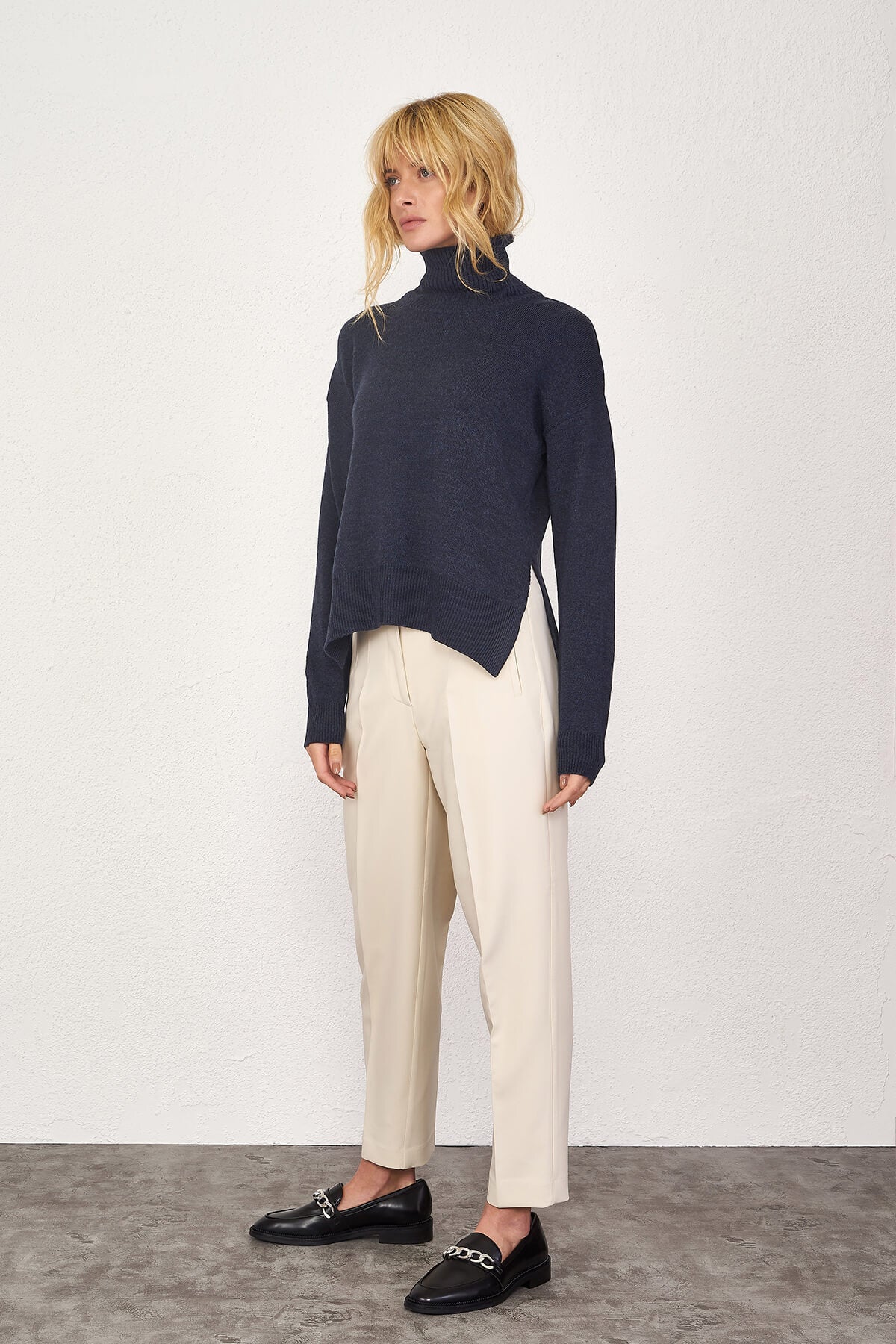 Basic, dik yakalı, yanları yırtmaçlı, düşük omuzlu, yaka, etek ucu ve manşetleri lastik örgülü, önü kısa arkası uzun triko kazak.