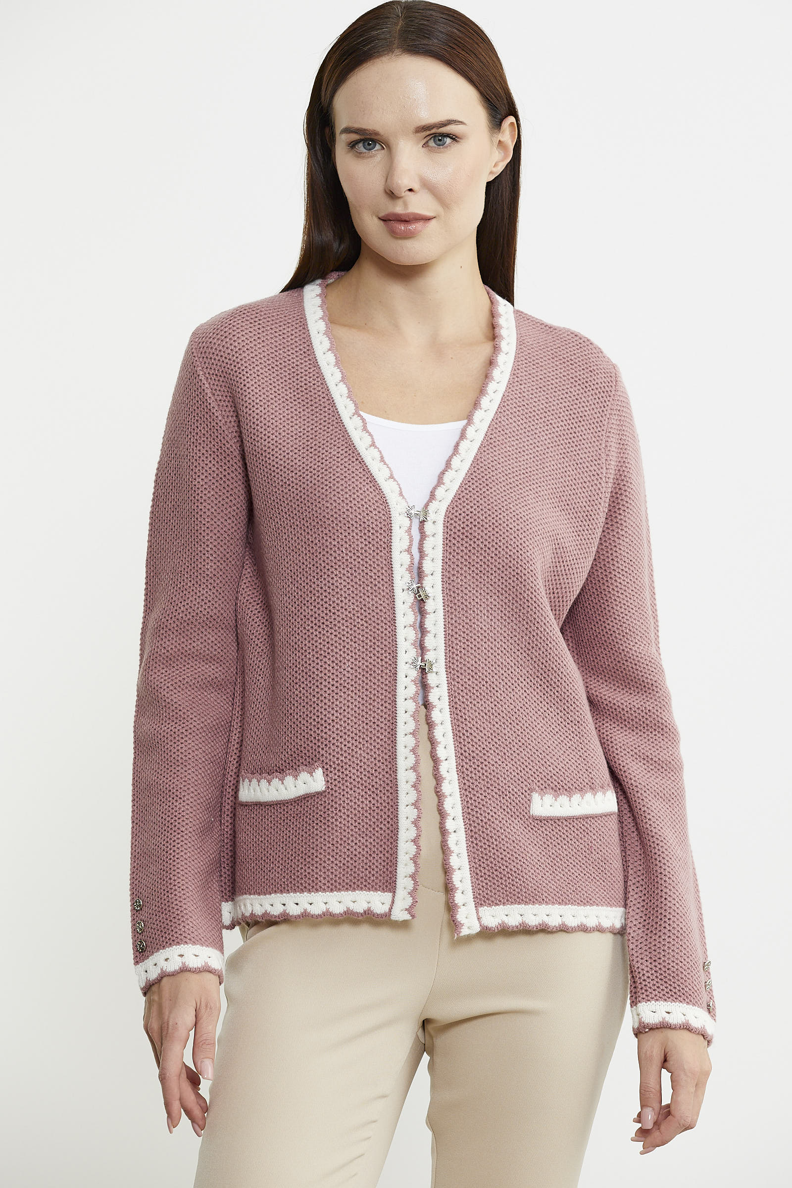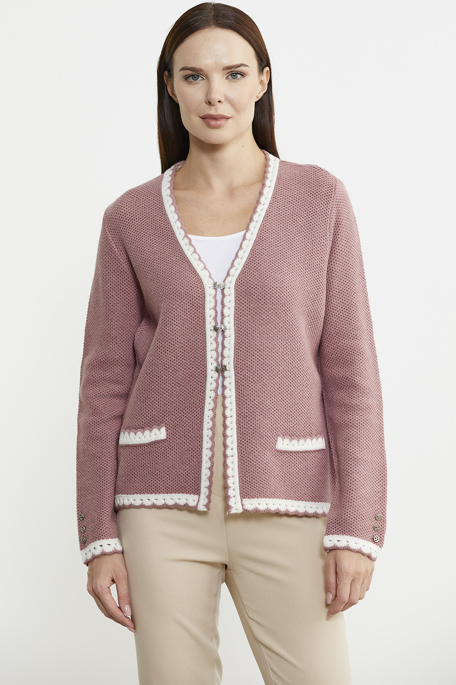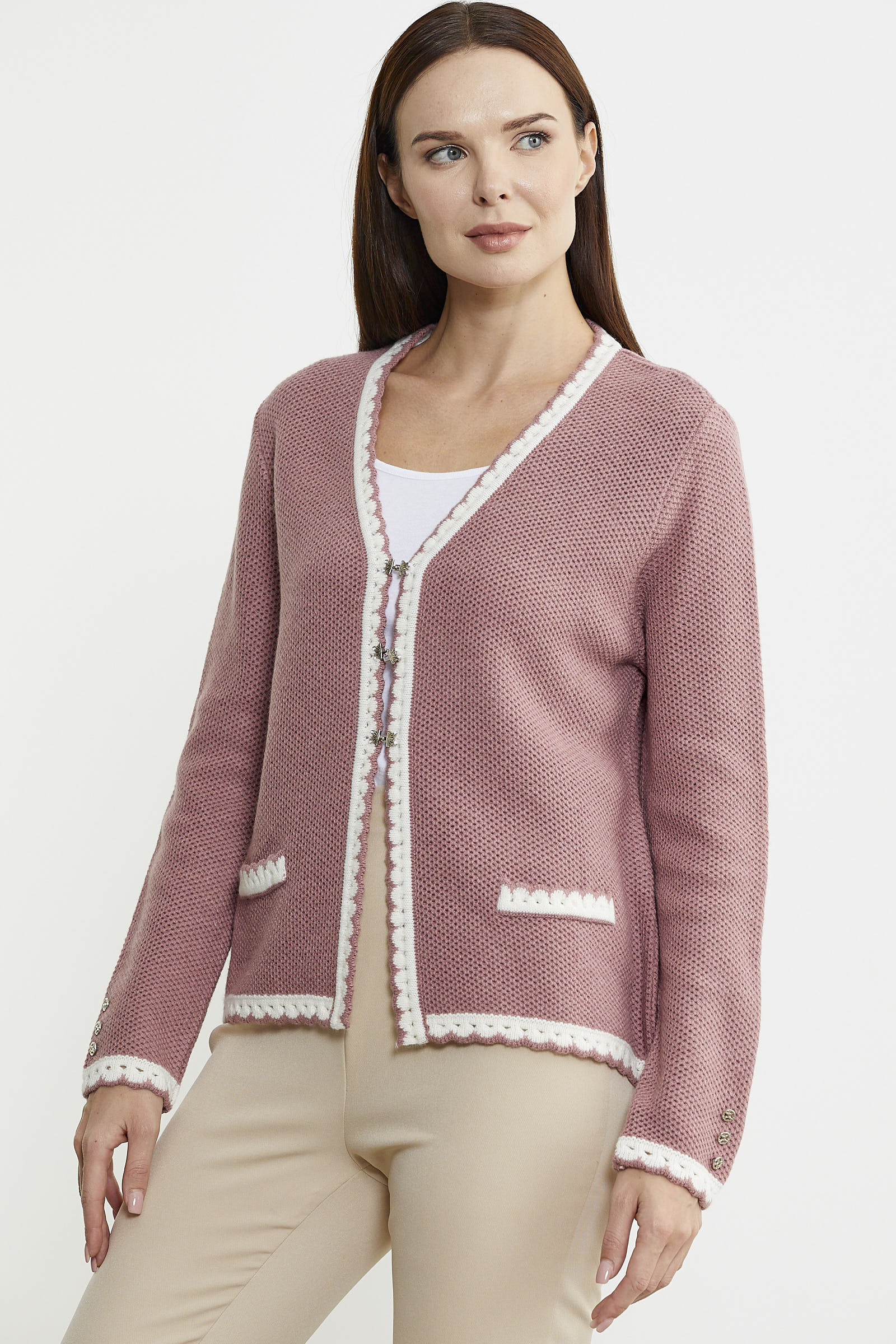 Agraf kapamalı triko hırkaya minimal motifli detaylar eşlik ediyor.Rahat kalıptır. Günlük kullanım için ideal.