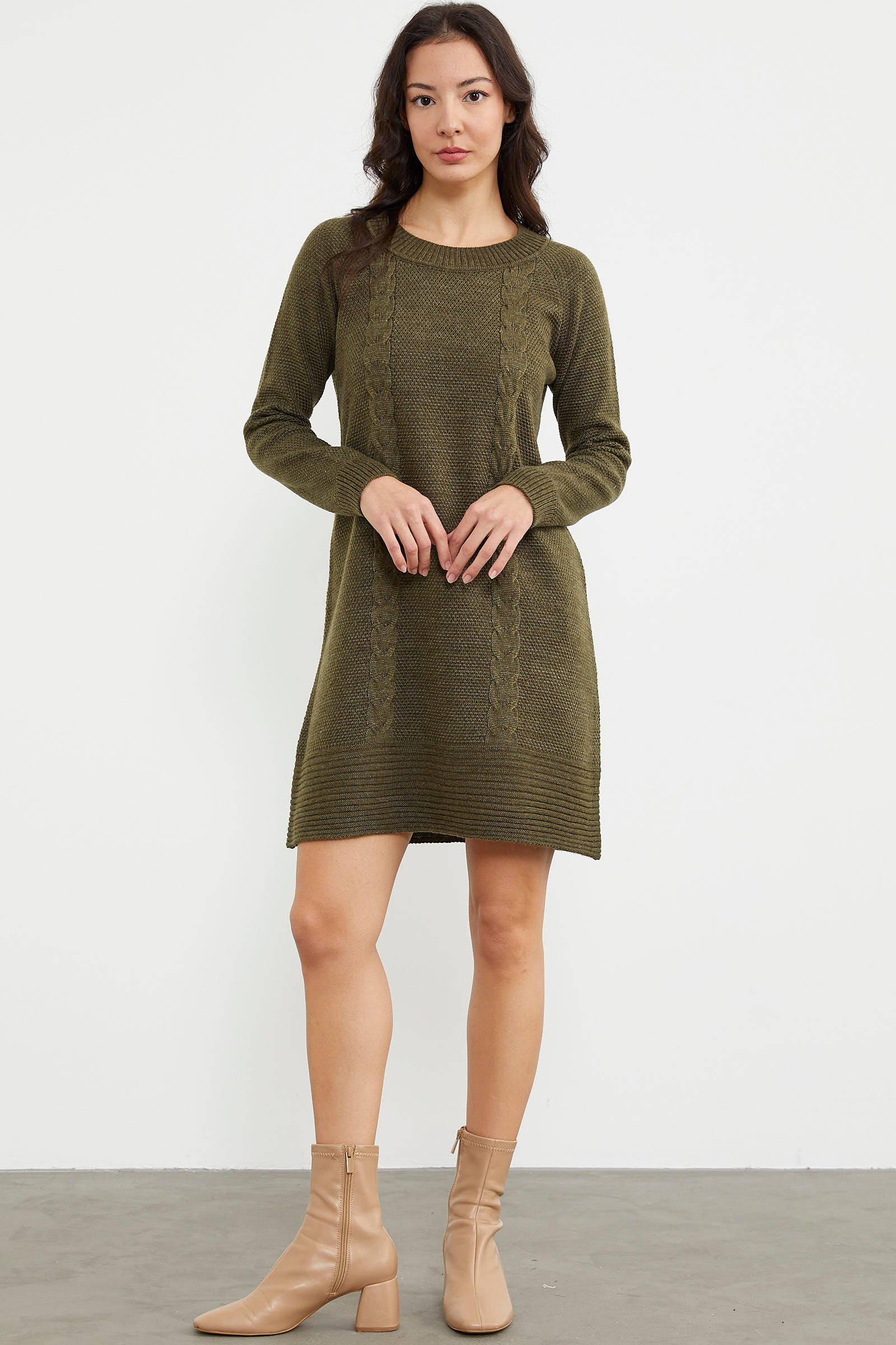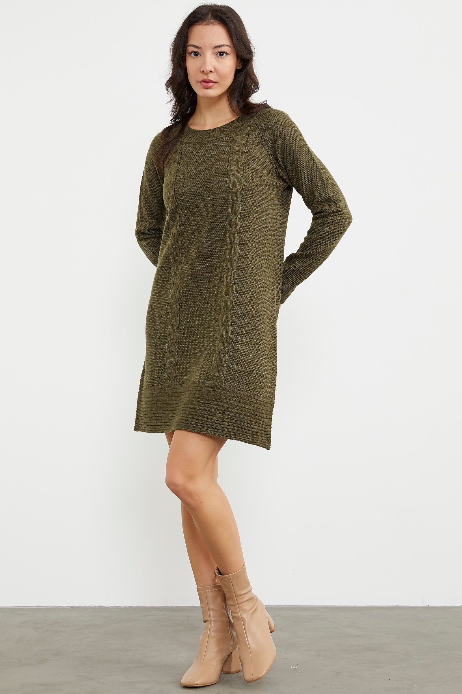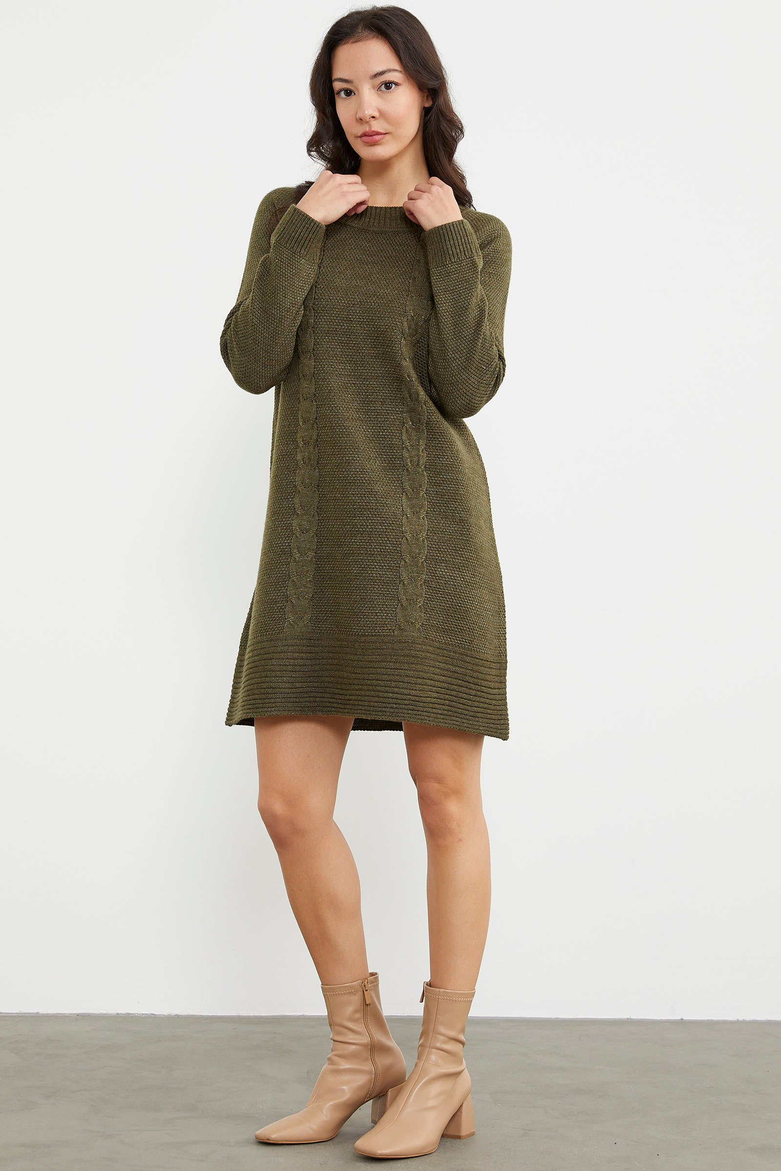 Yün dokusu ile rahat ve sıcak hissettirecek saç örgülü sıfır yaka uzun kollu diz üstü elbise kolay ve şık bir görünüm oluşturmanızı sağlar. Farklı renkleri ile stilinize uyum sağlayanı seçebilirsiniz.