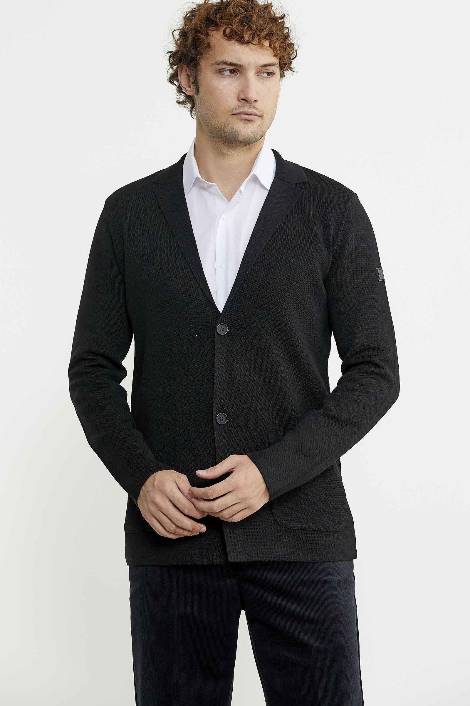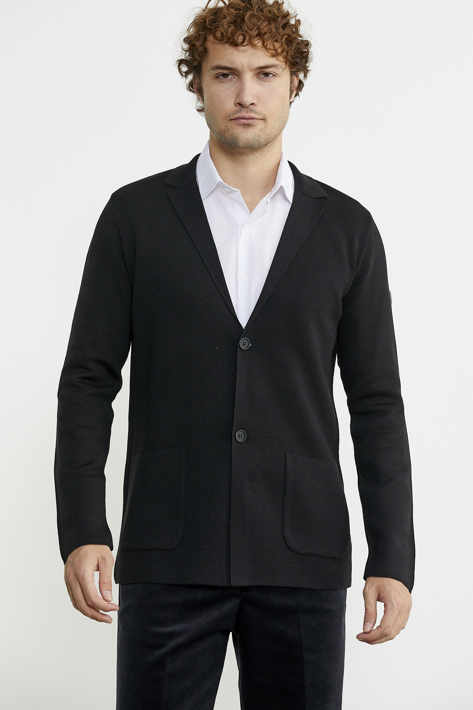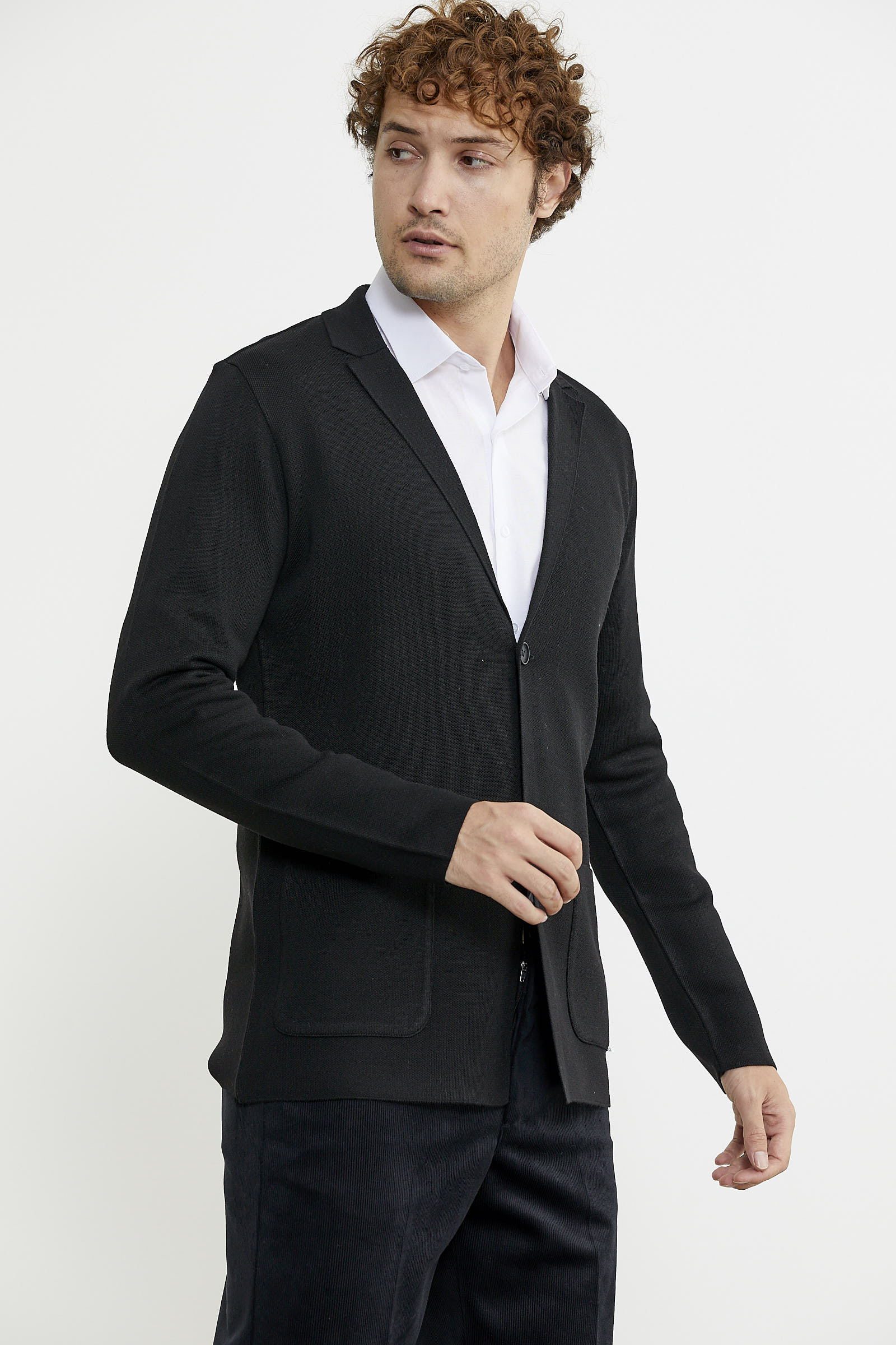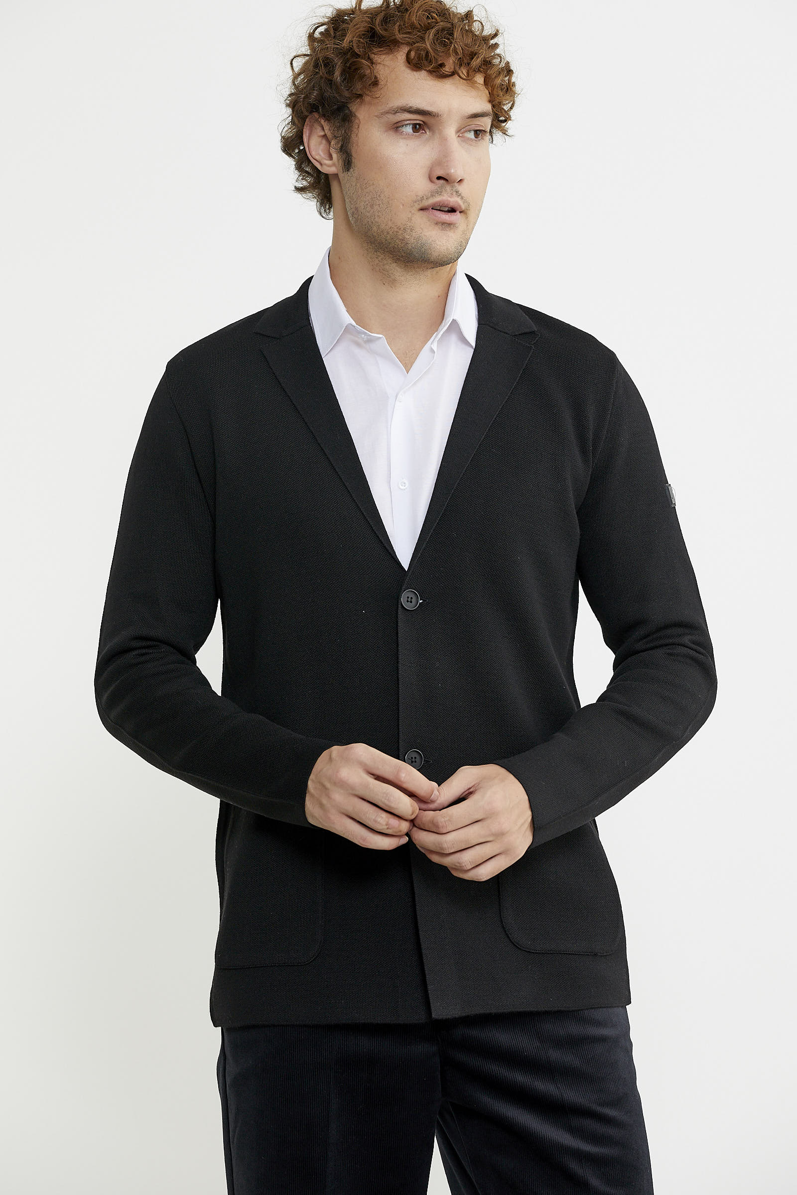 Minimal çizginin yumuşak dokuyla birleştiği şık triko ceket. Cep ve arma detayıyla öne çıkan ürün rahat kesimdir. Astarsızdır.