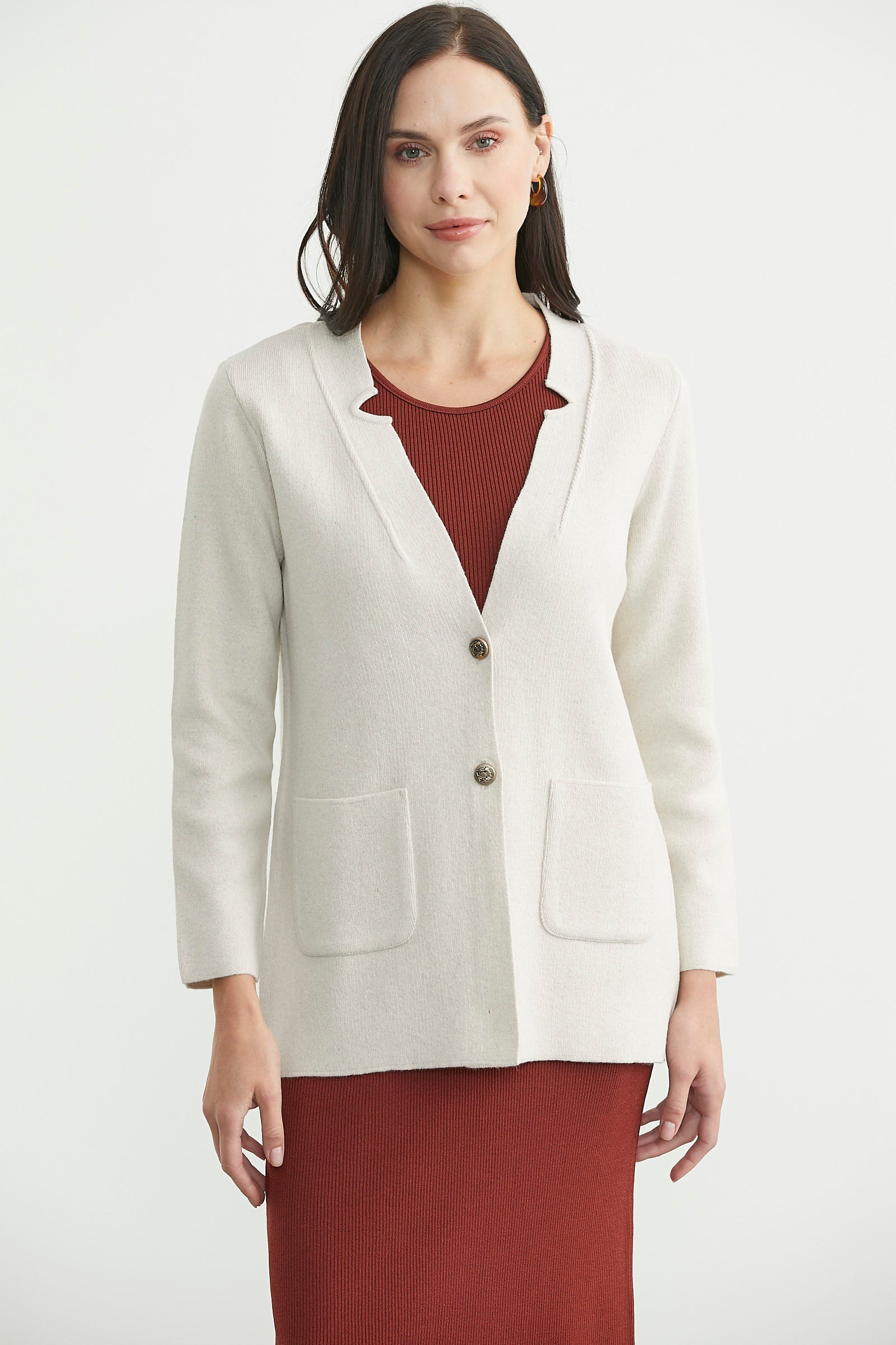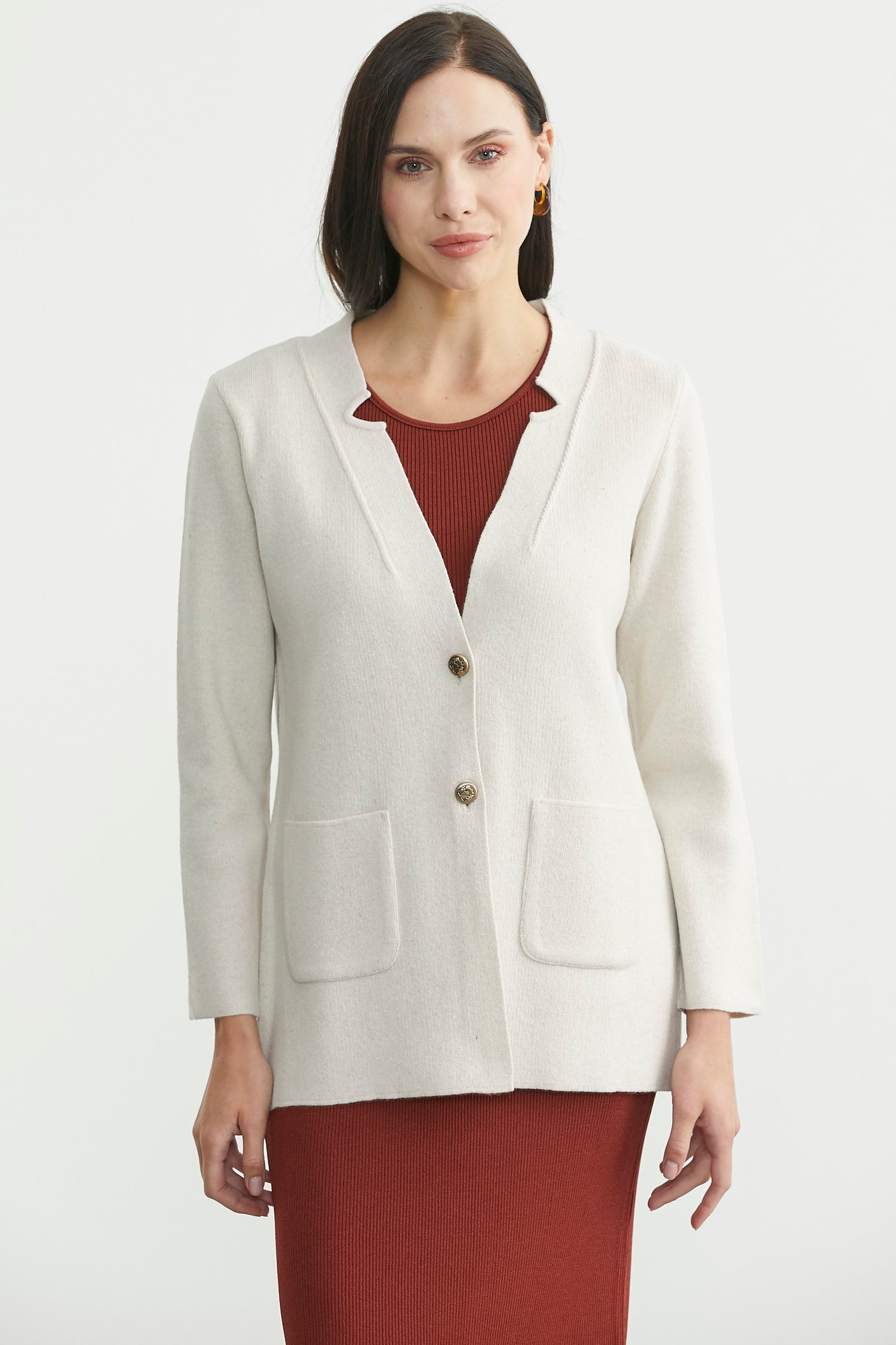 Yüksek oranda yün içeren triko hırka, kalın dokuludur. Cepli, düğmeli ve uzun boydur.