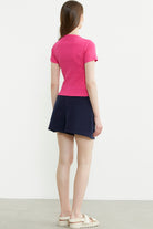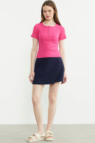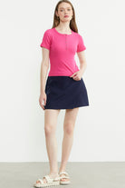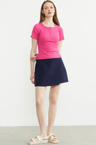 Düğmeli Kısa Kol Basic Tişört - Fuşya
