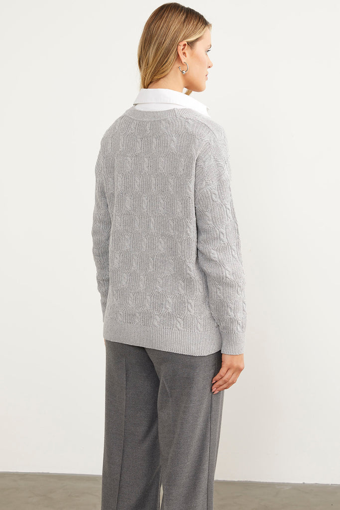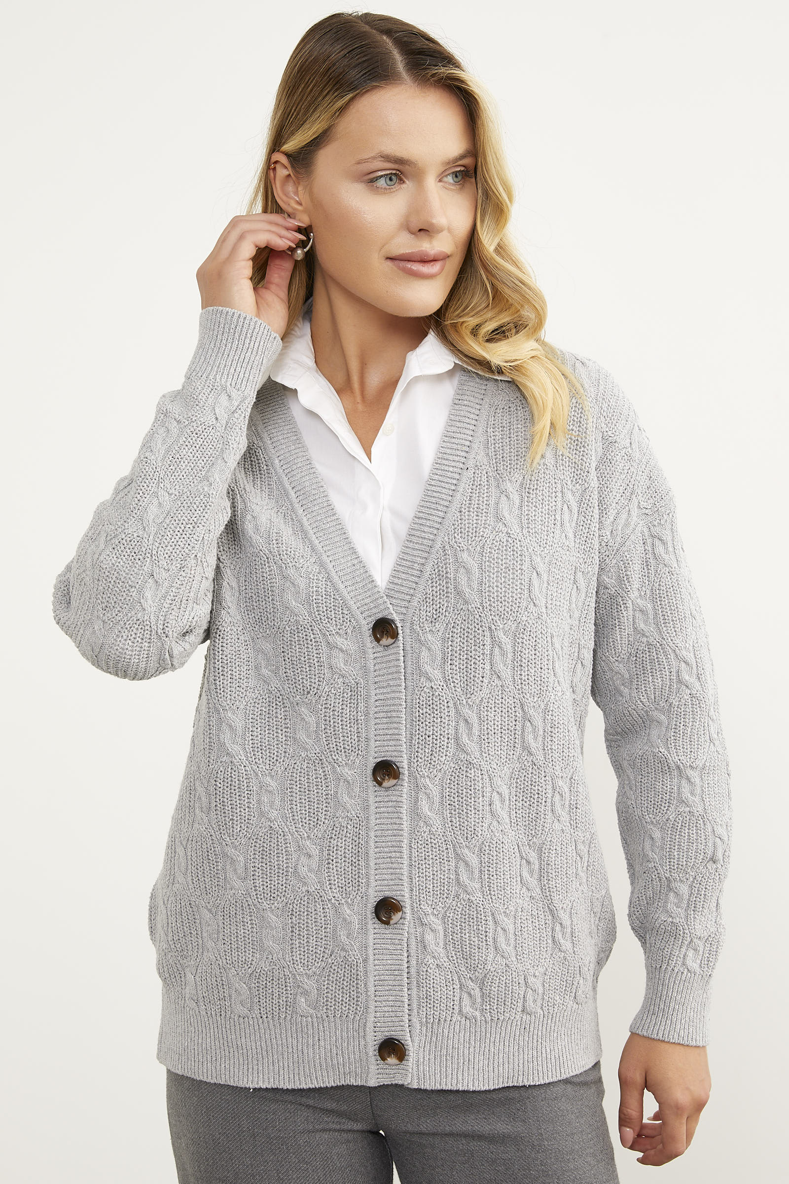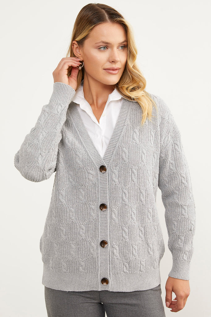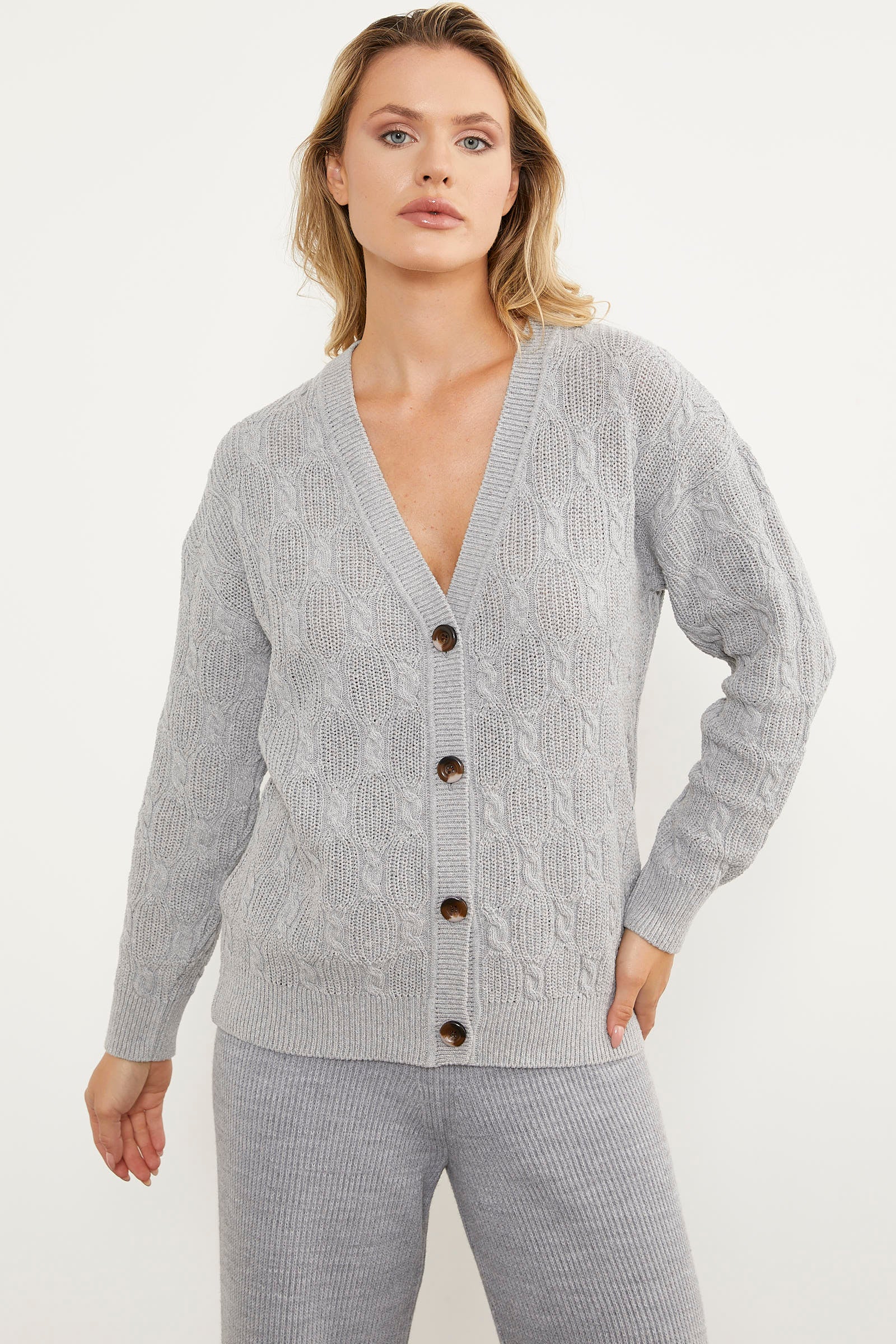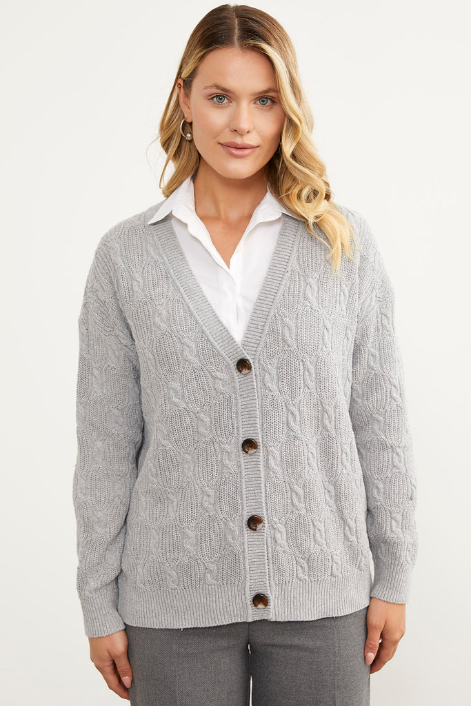 Düğmeli Saç Örgü Triko Hırka - Açık Gri