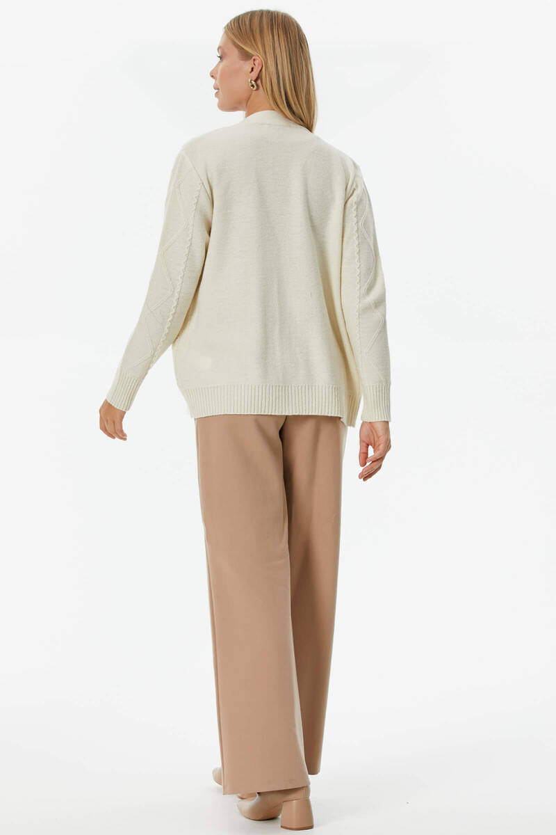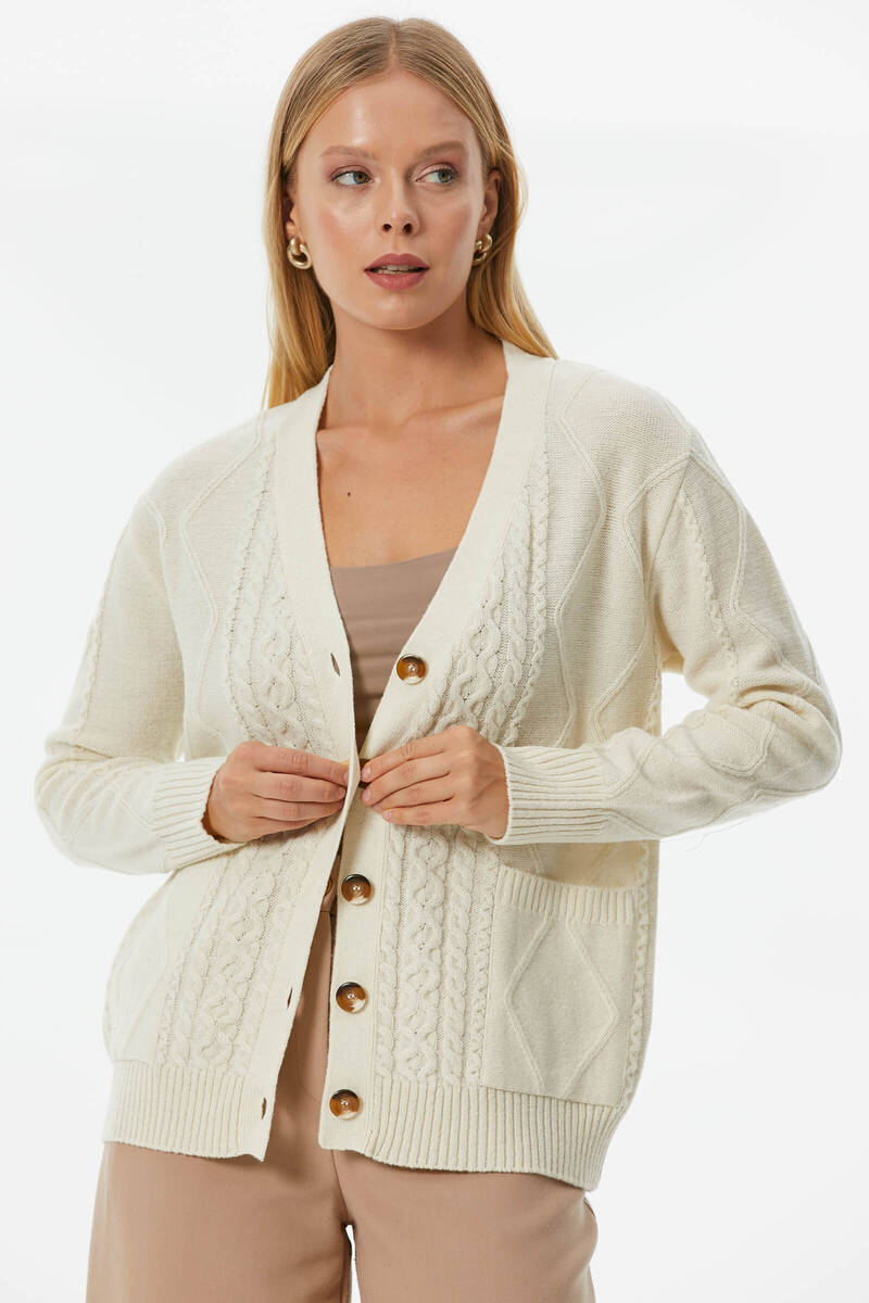 Düğmeli Saç Örgülü Triko Hırka - Kemik