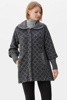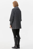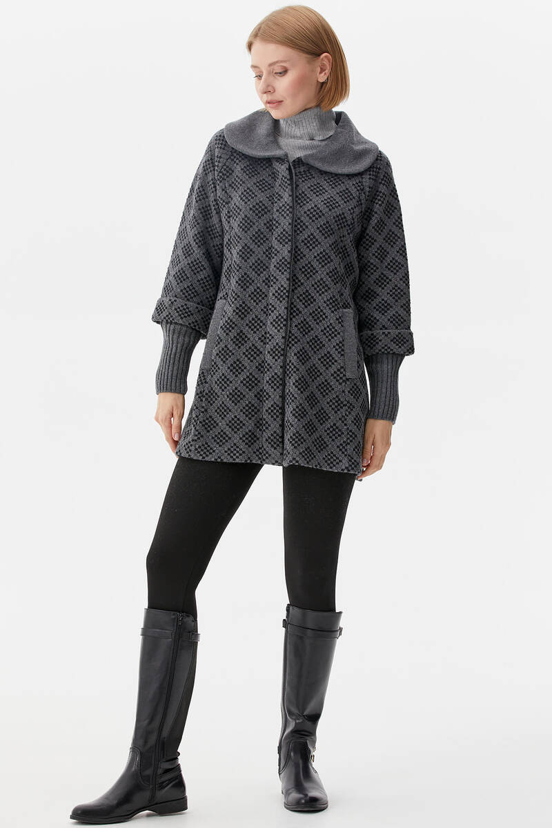 Yün karışımlı iplikten üretilen, bebe yaka, uzun kollu, düğme kapamasıyla kullanım kolaylığı sağlayan desenli triko ceket.