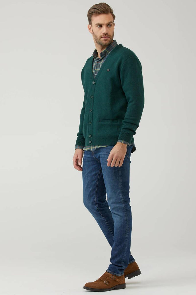 Yün karışımlı iplikten üretilen v yaka, uzun kollu, düğme kapaması ile pratik kullanım sağlayan triko hırka.