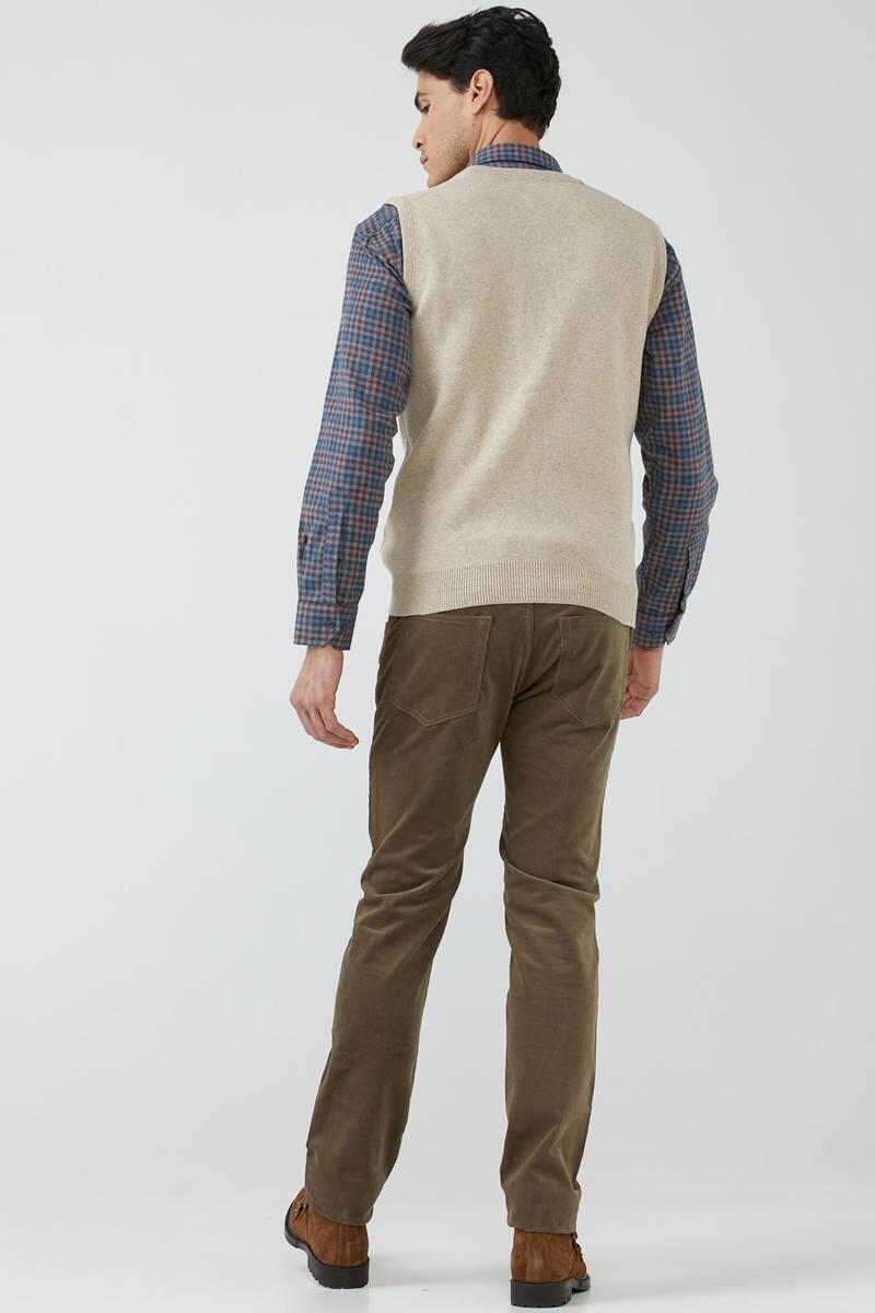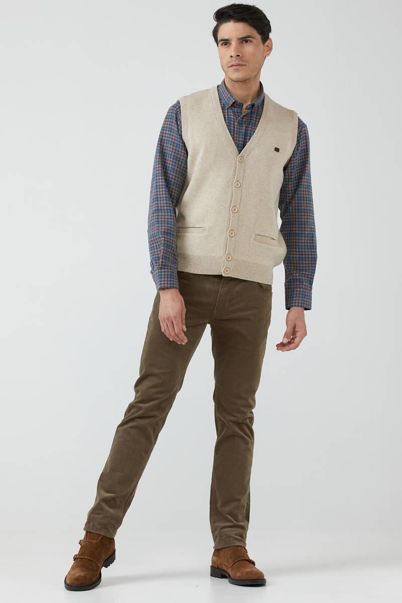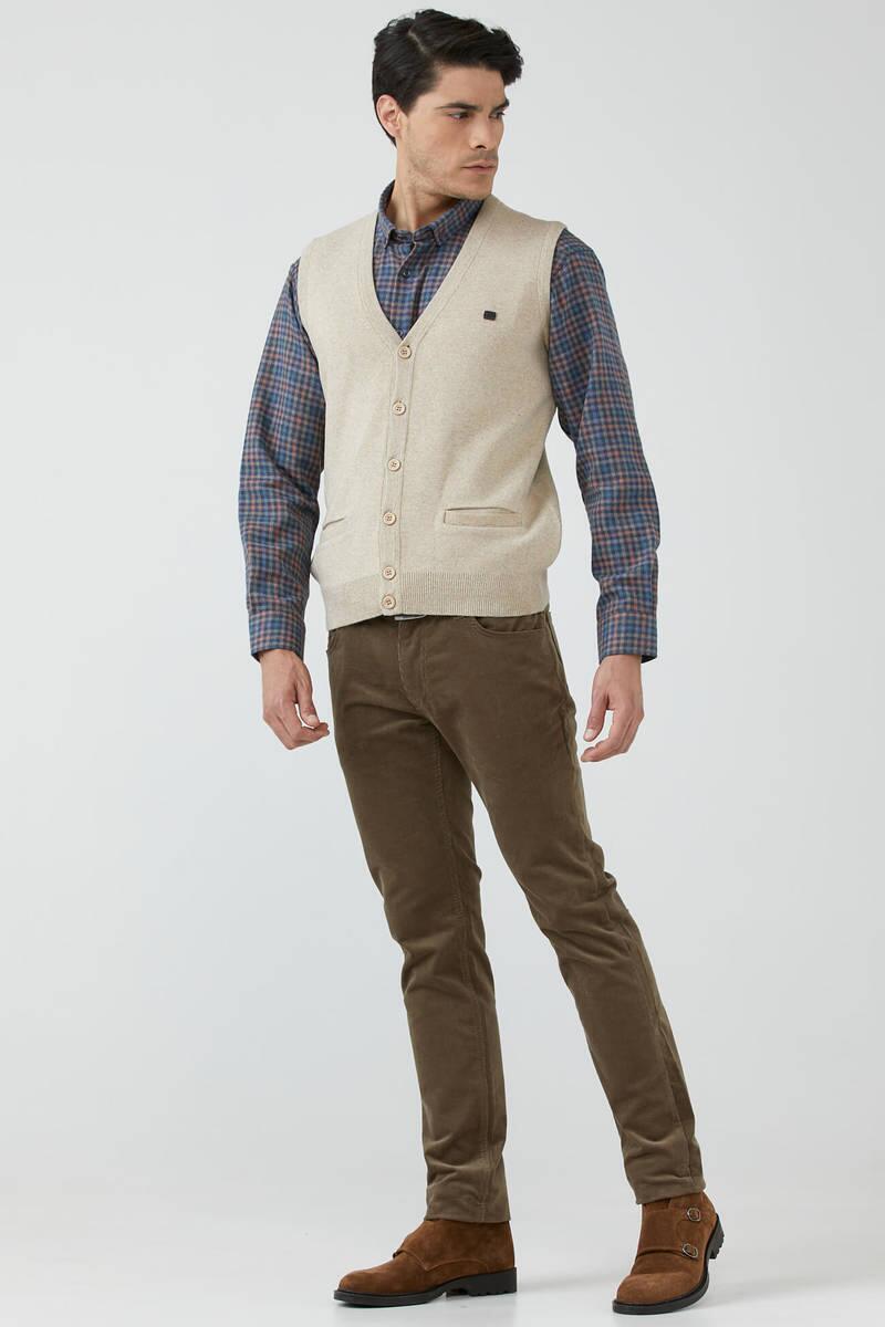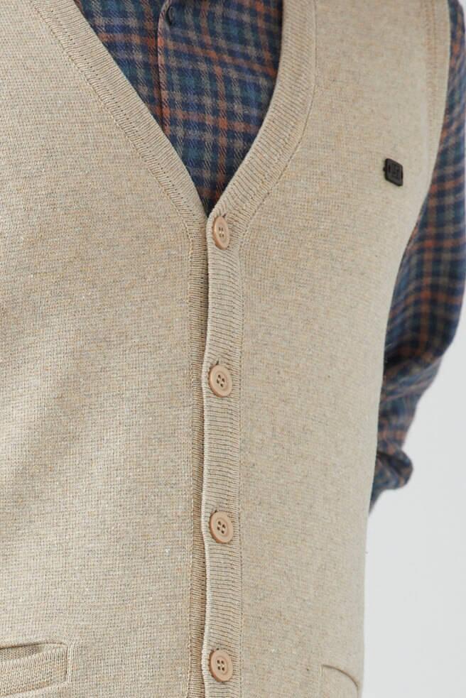 Yün karışımlı iplikten üretilen, v yaka, sıfır kollu, düğme kapaması ile pratik kullanım sağlayan basic triko yelek.
