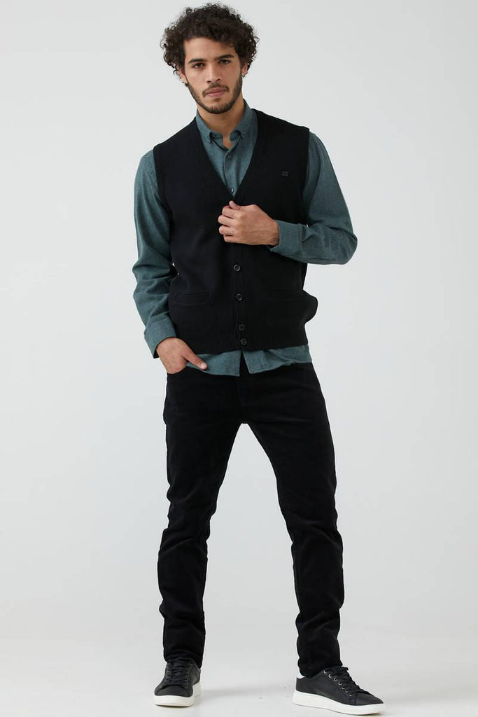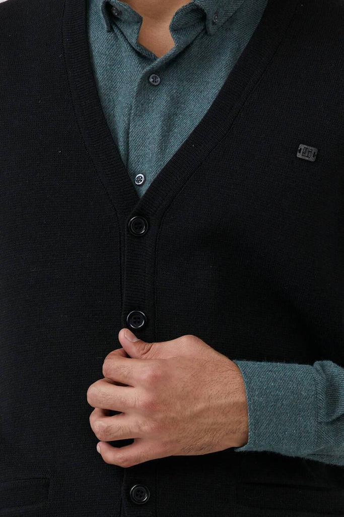Yün karışımlı iplikten üretilen, v yaka, sıfır kollu, düğme kapaması ile pratik kullanım sağlayan basic triko yelek.