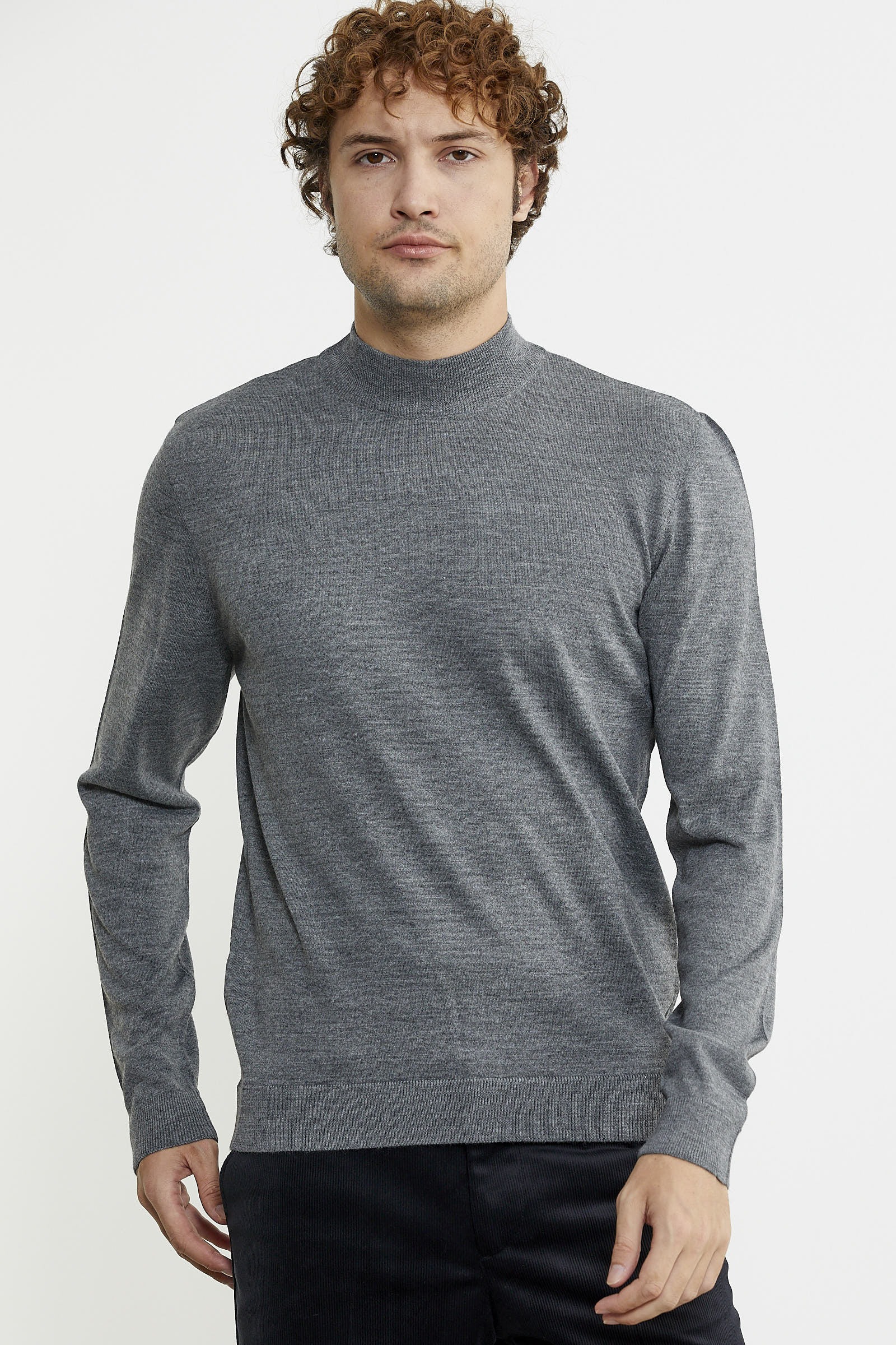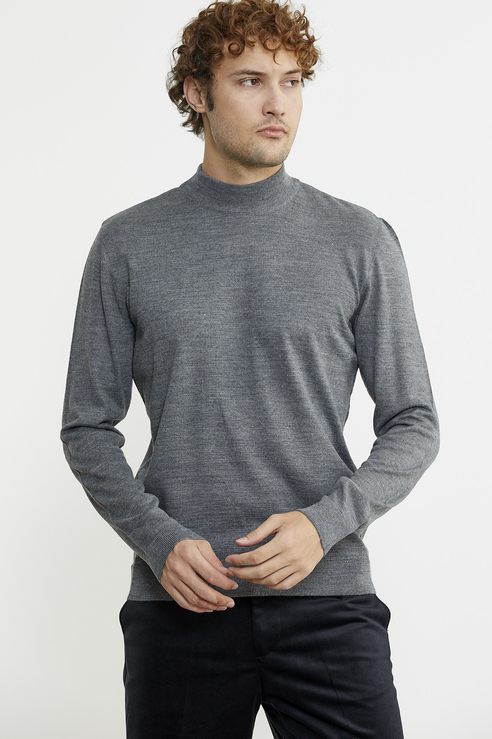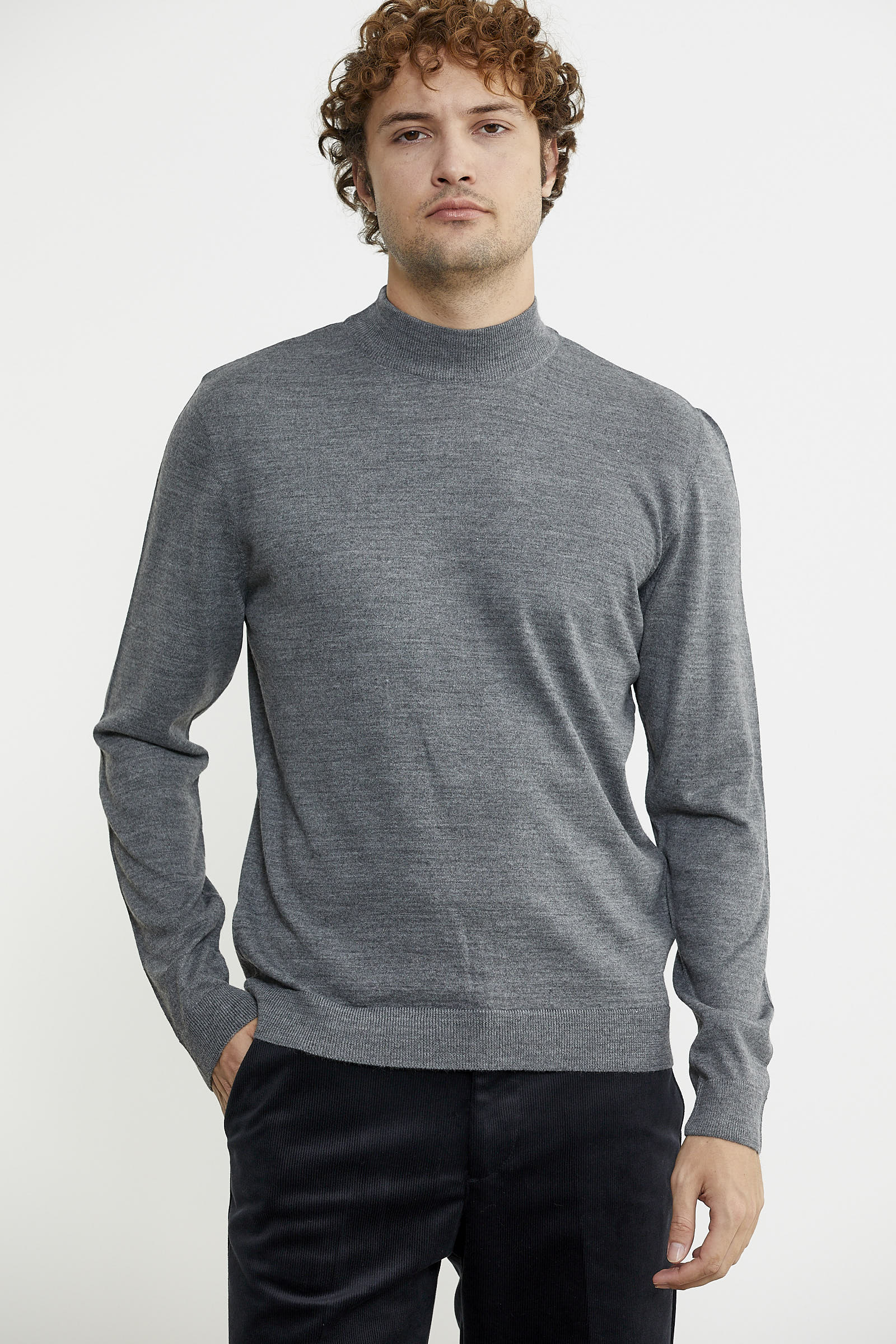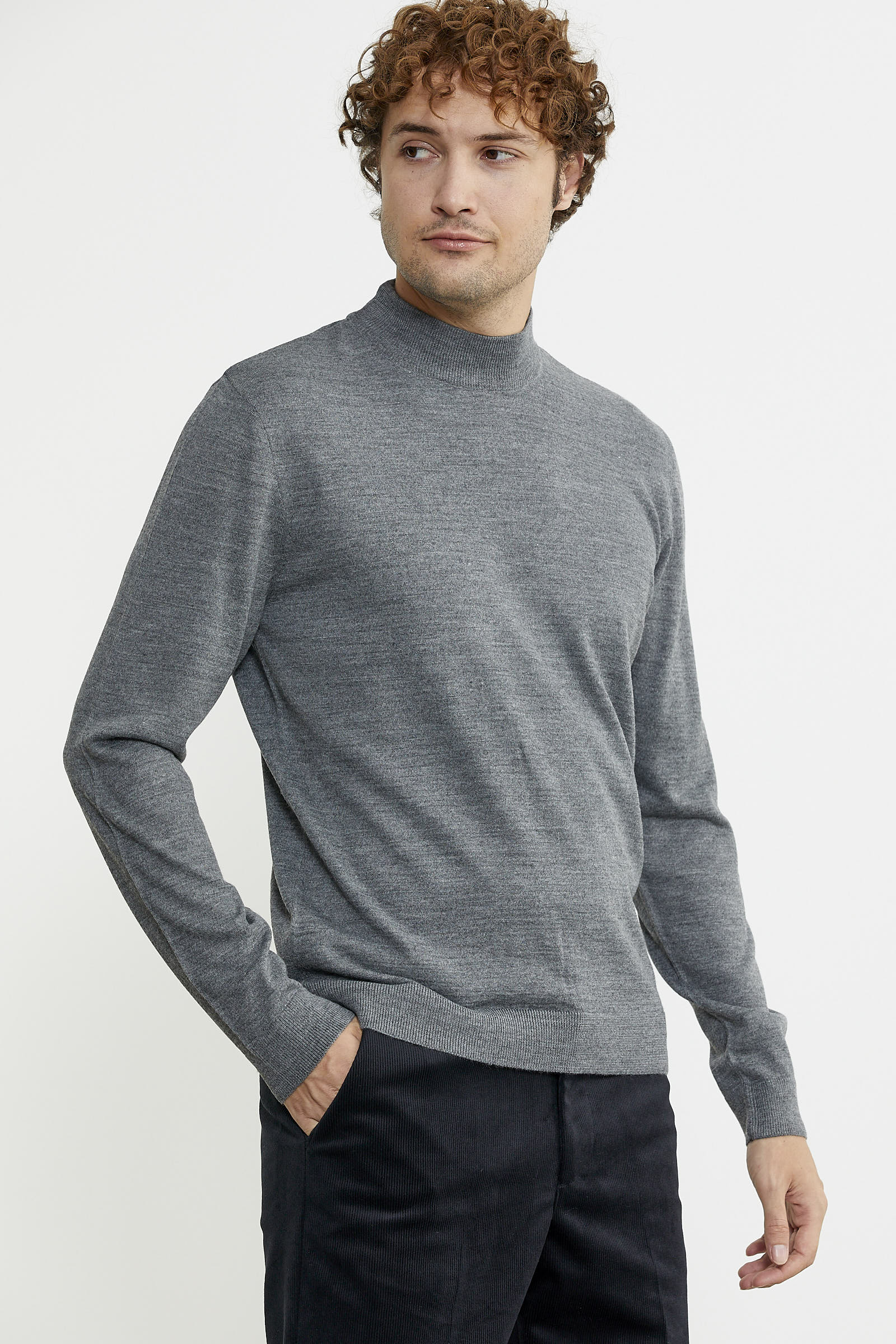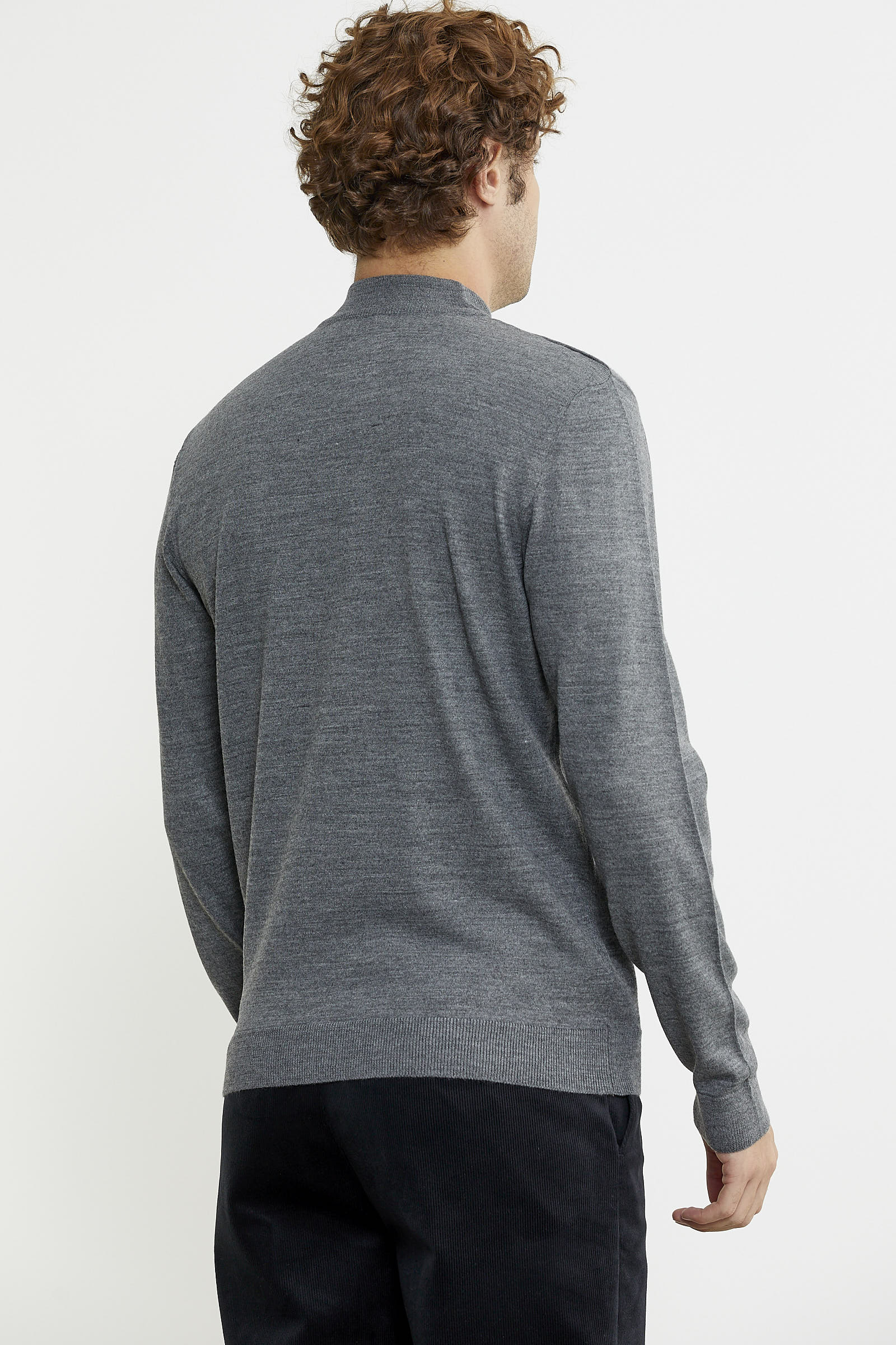 Yarım balıkçı yaka, uzun kollu, yakası, manşetleri ve etek ucu ince lastik örgülü basic triko kazak.