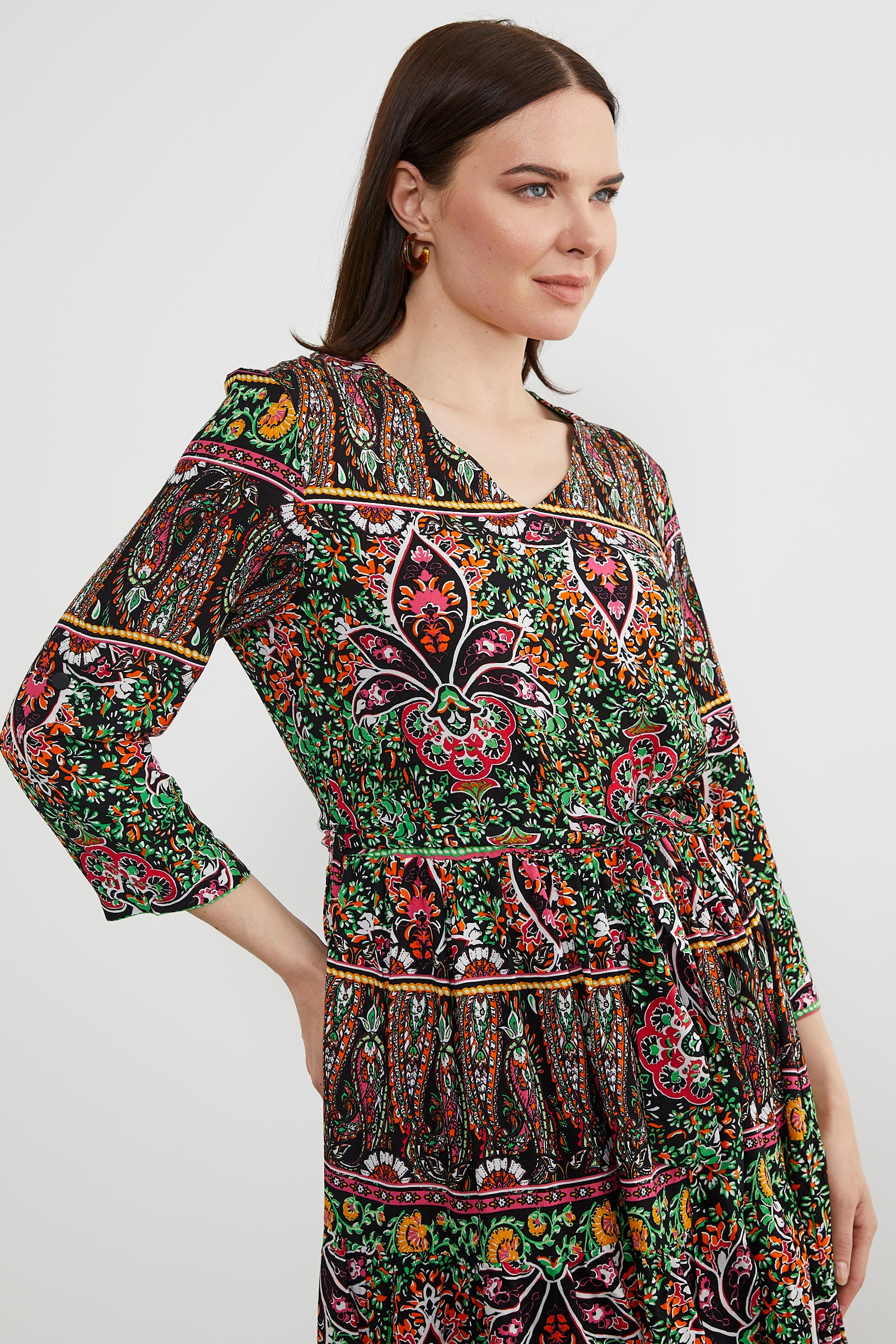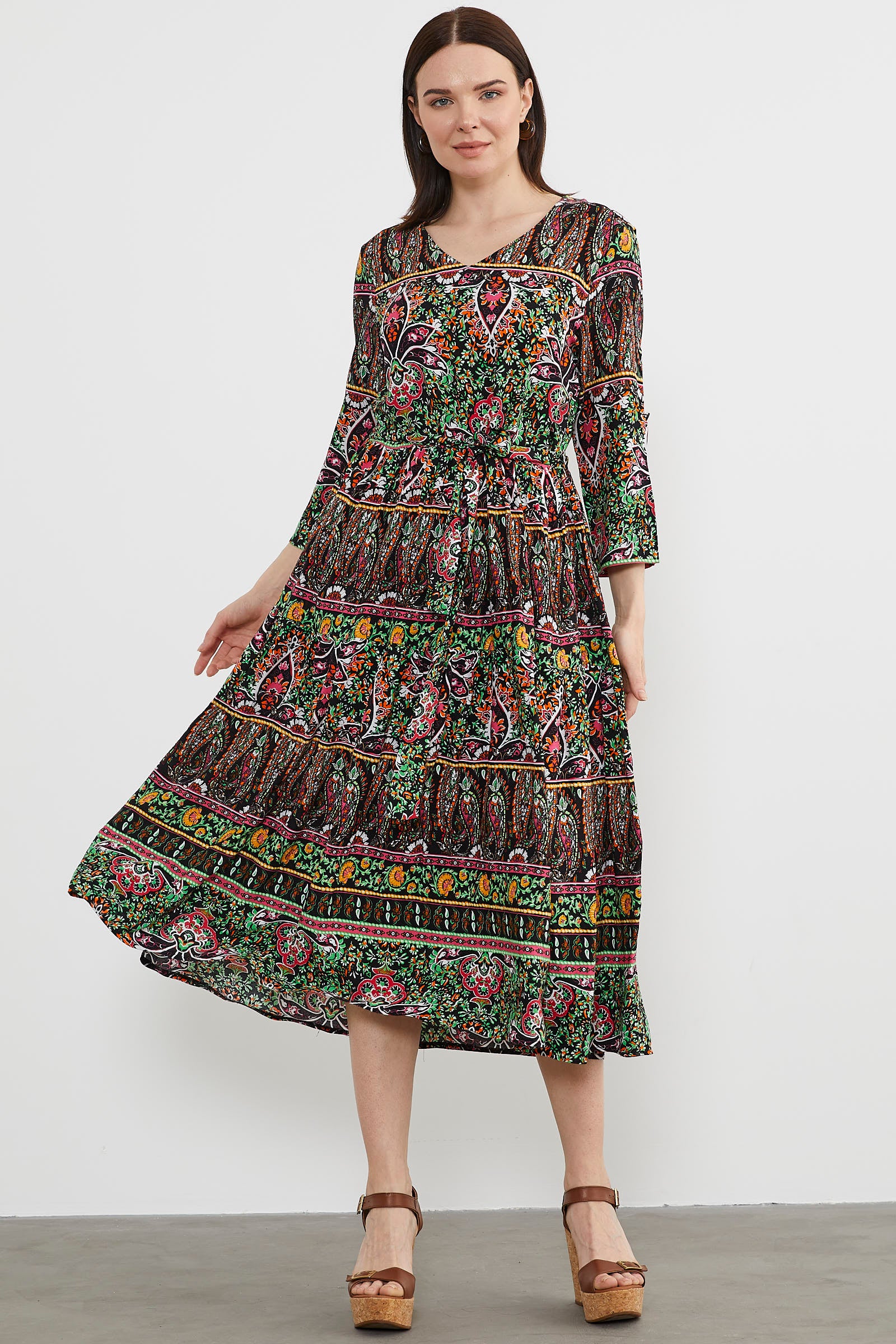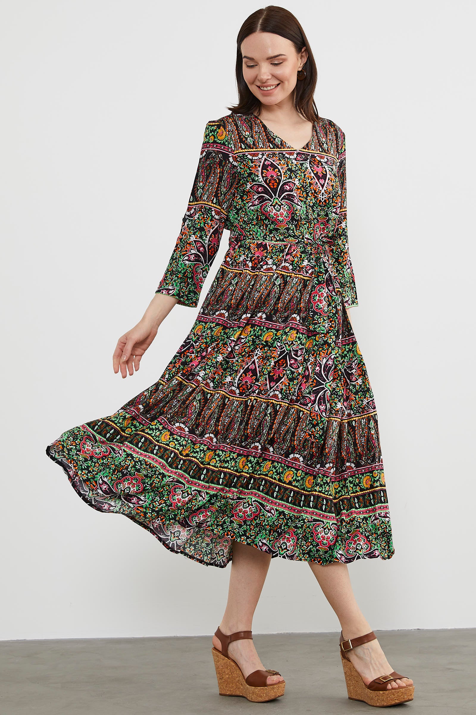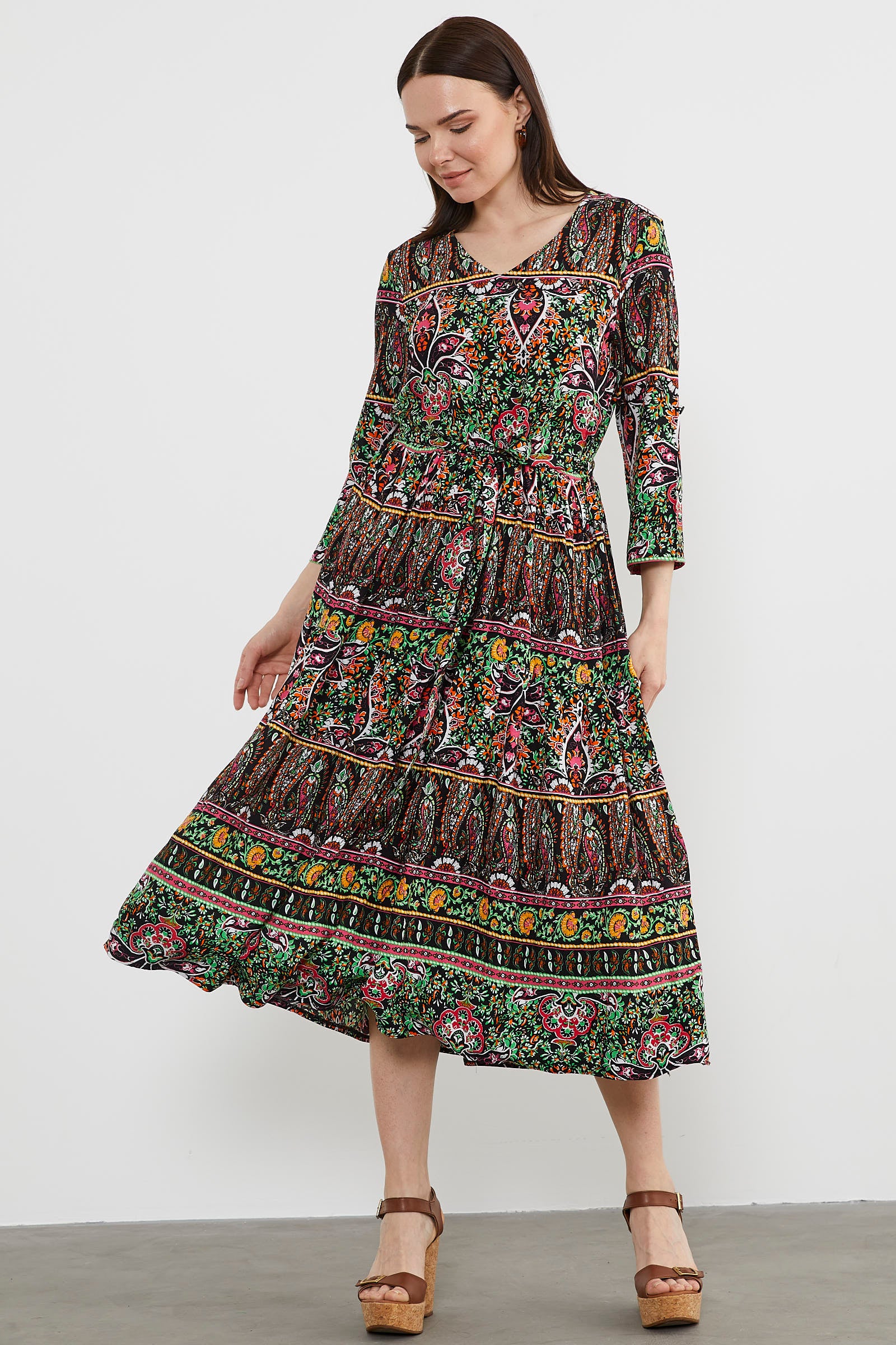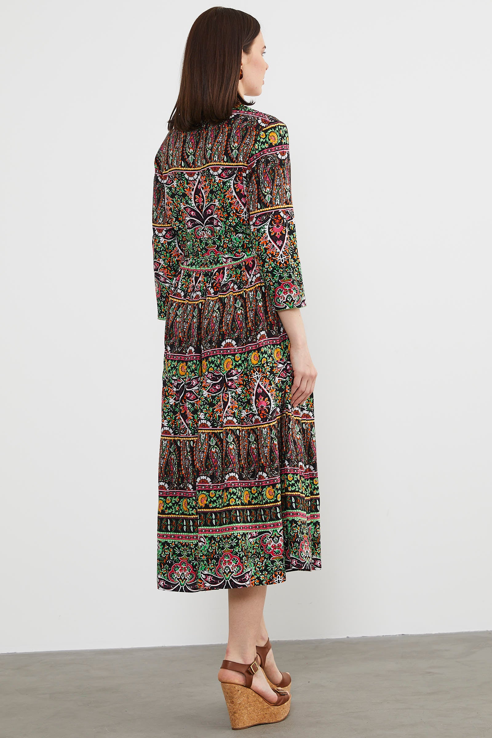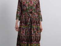 Etnik Desen Uzun Renkli Elbise - Siyah