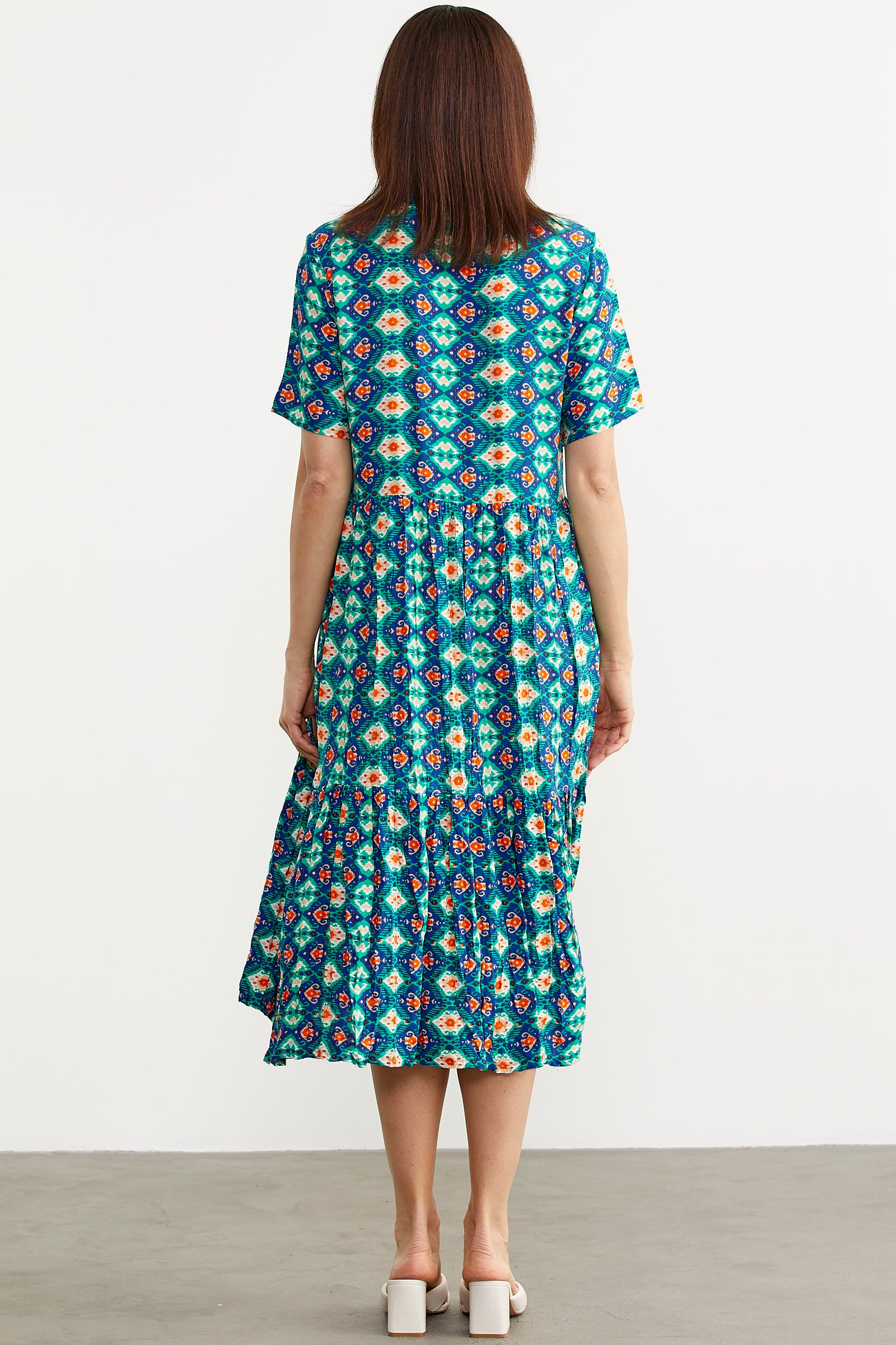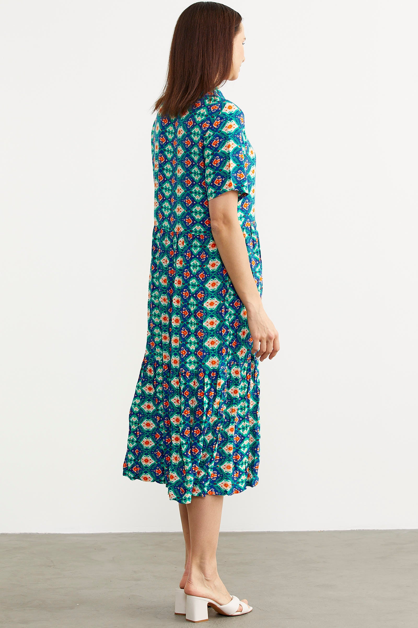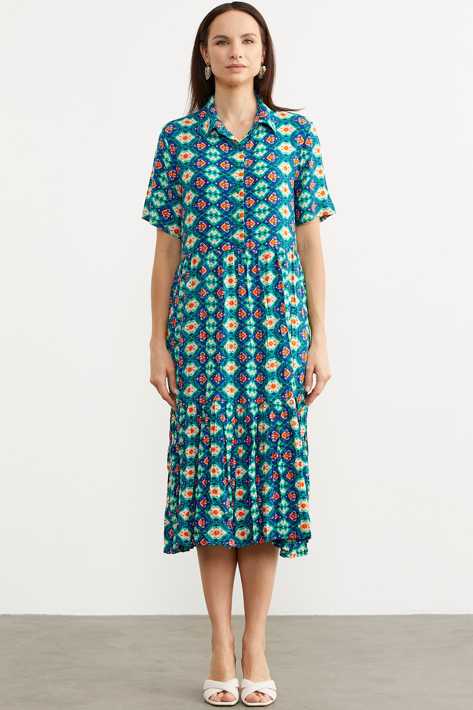 Etnik Desenli Rahat Kalıp Gömlek Elbise - Yeşil