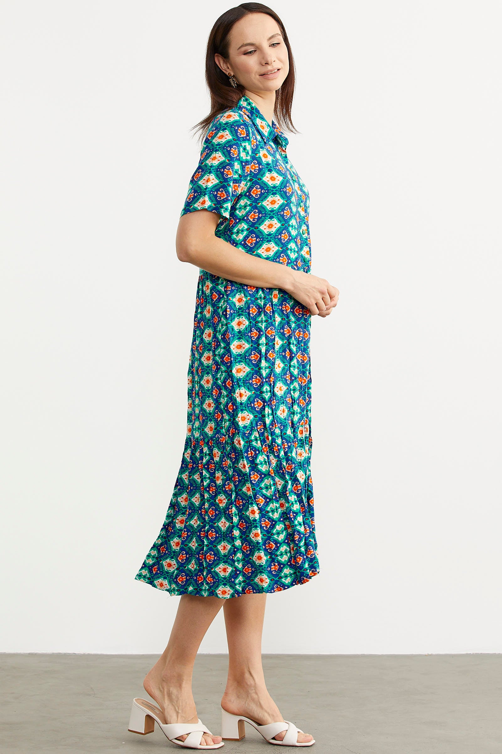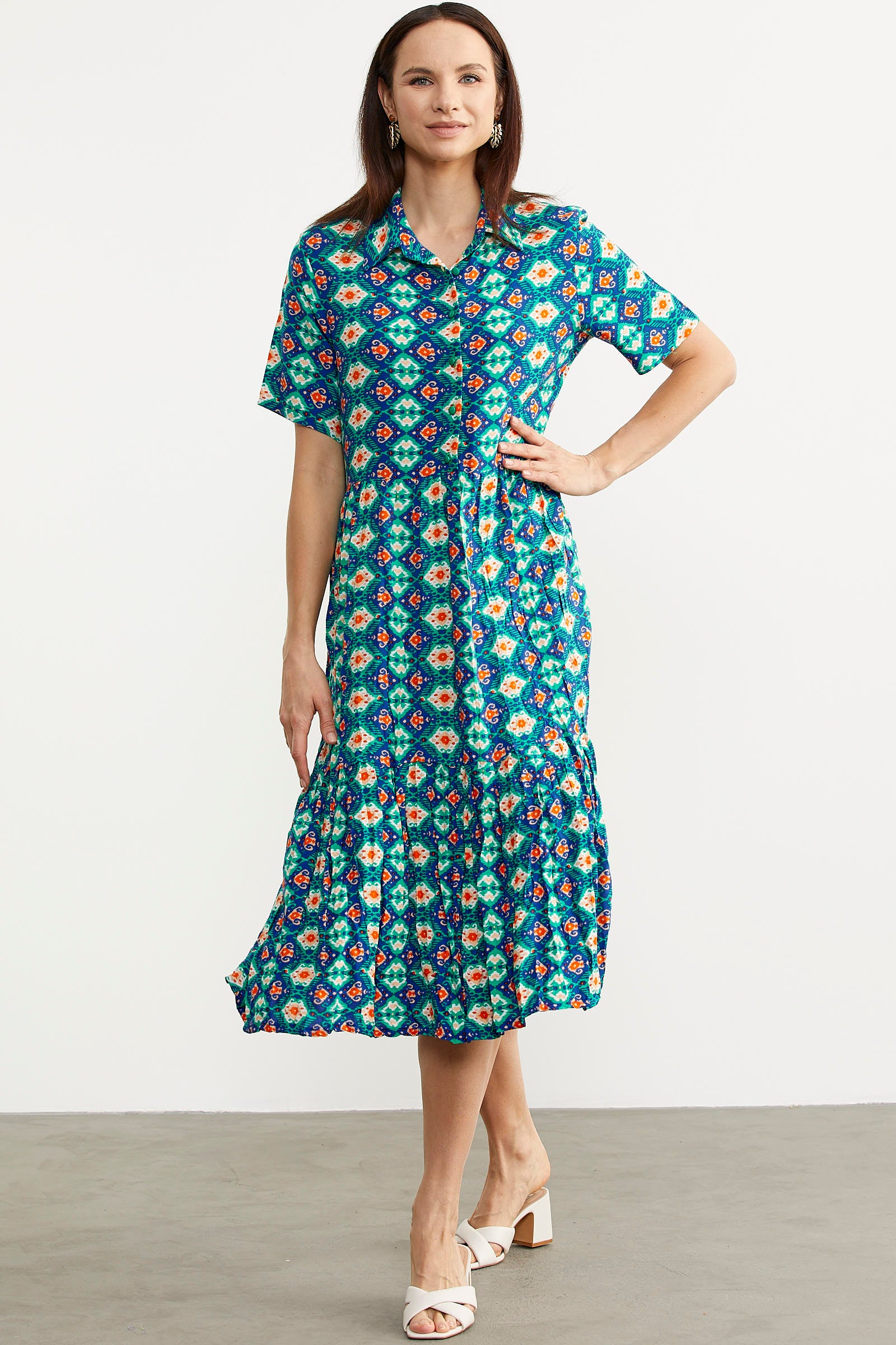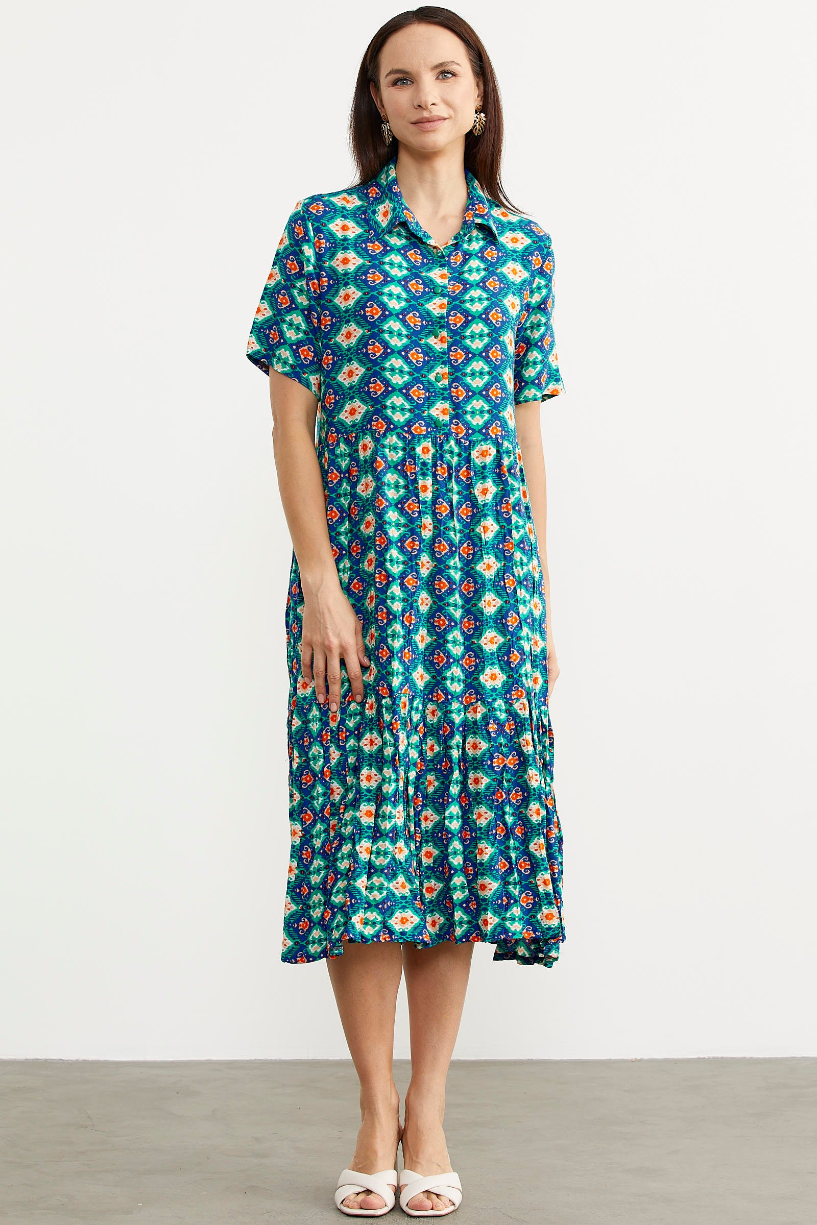 Etnik Desenli Rahat Kalıp Gömlek Elbise - Yeşil