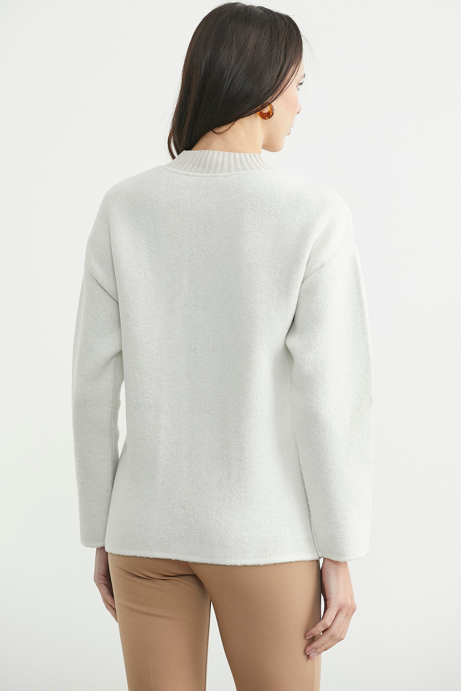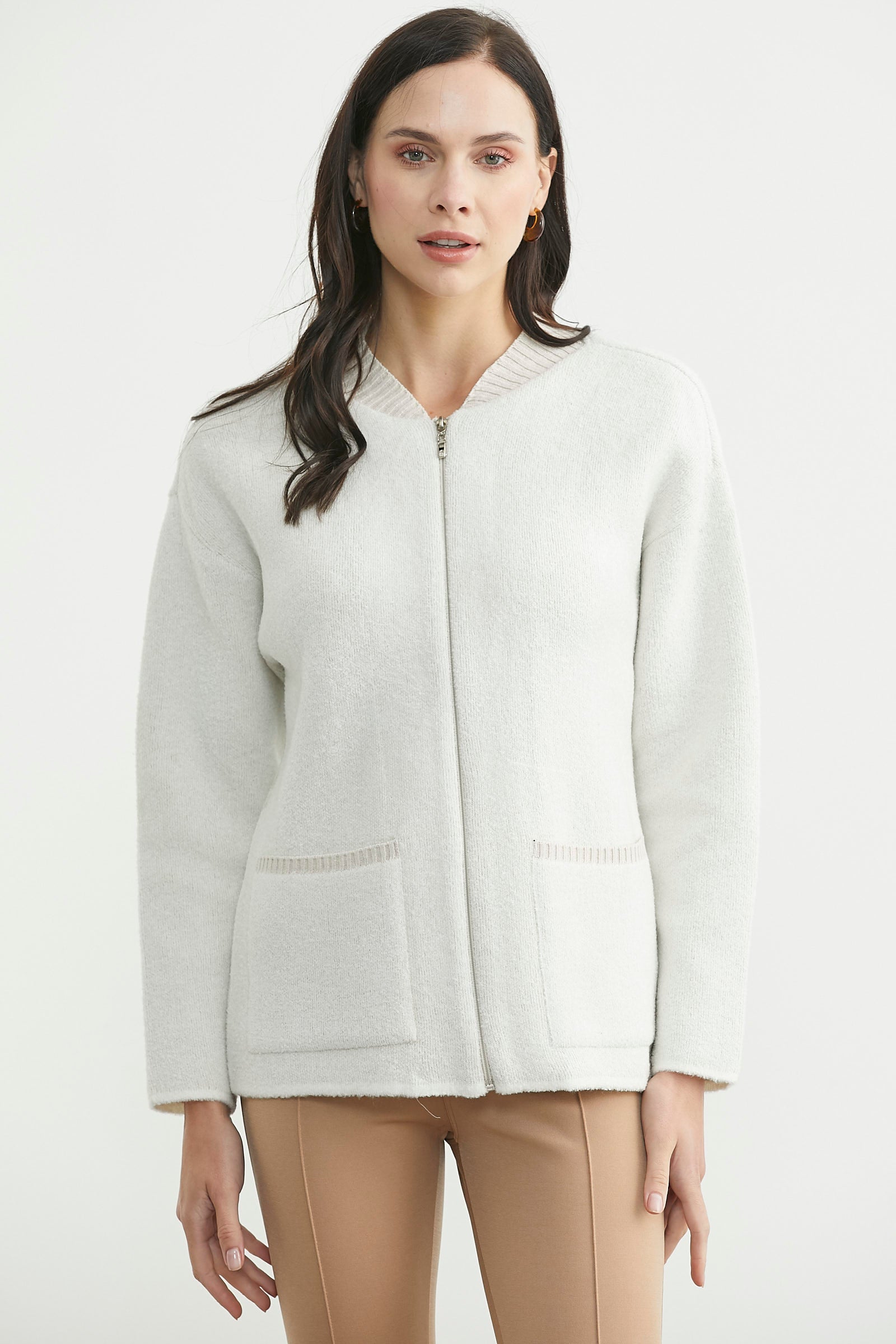 Fermuarlı Cep Detaylı Yünlü Triko Ceket - Kemik