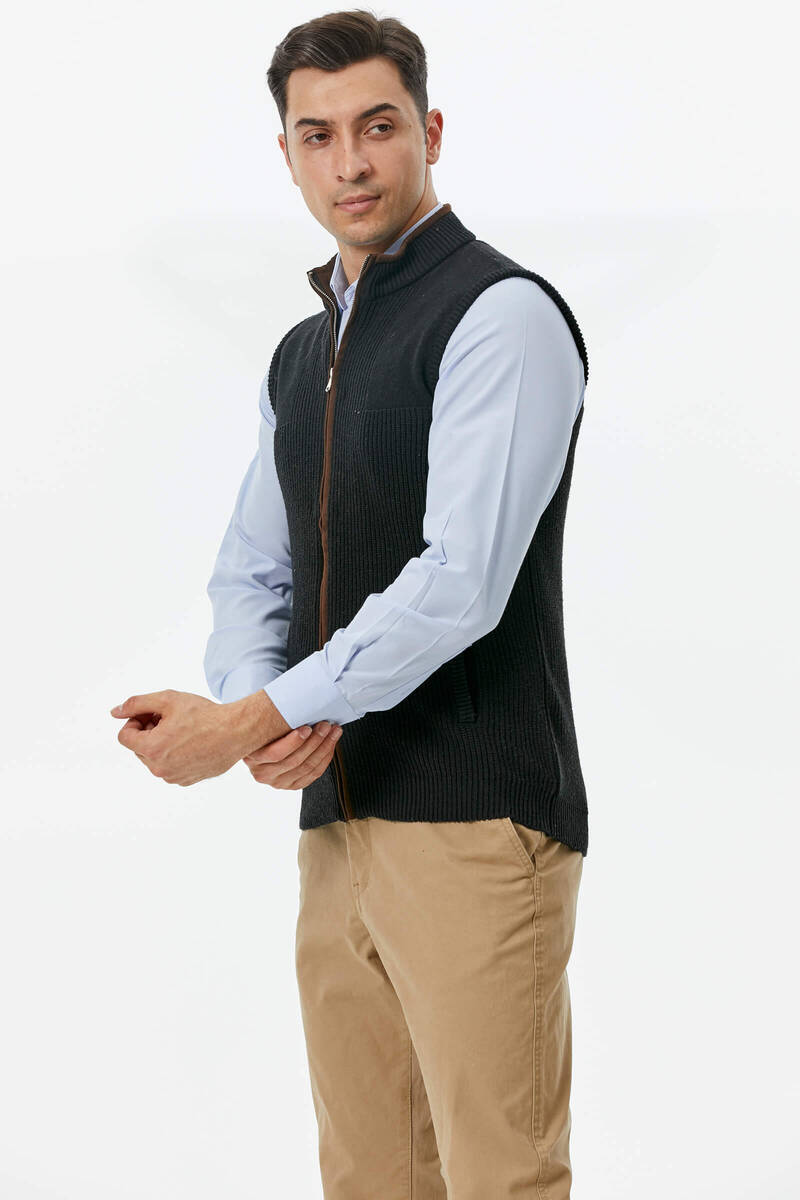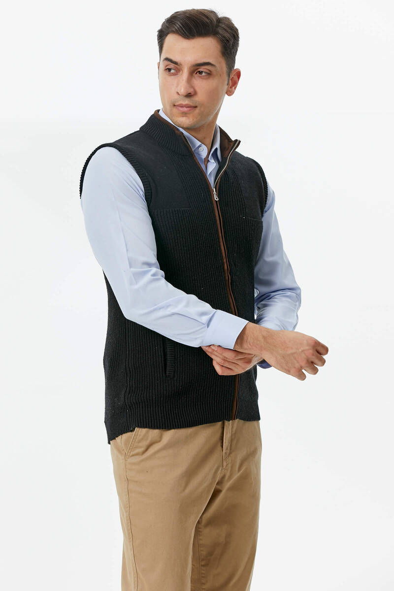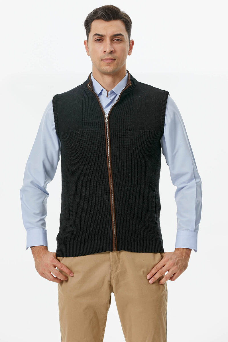 Fermuarlı Dik Yakalı Triko Yelek - Siyah