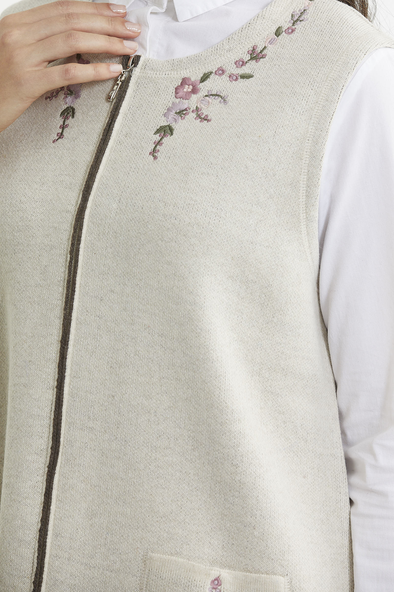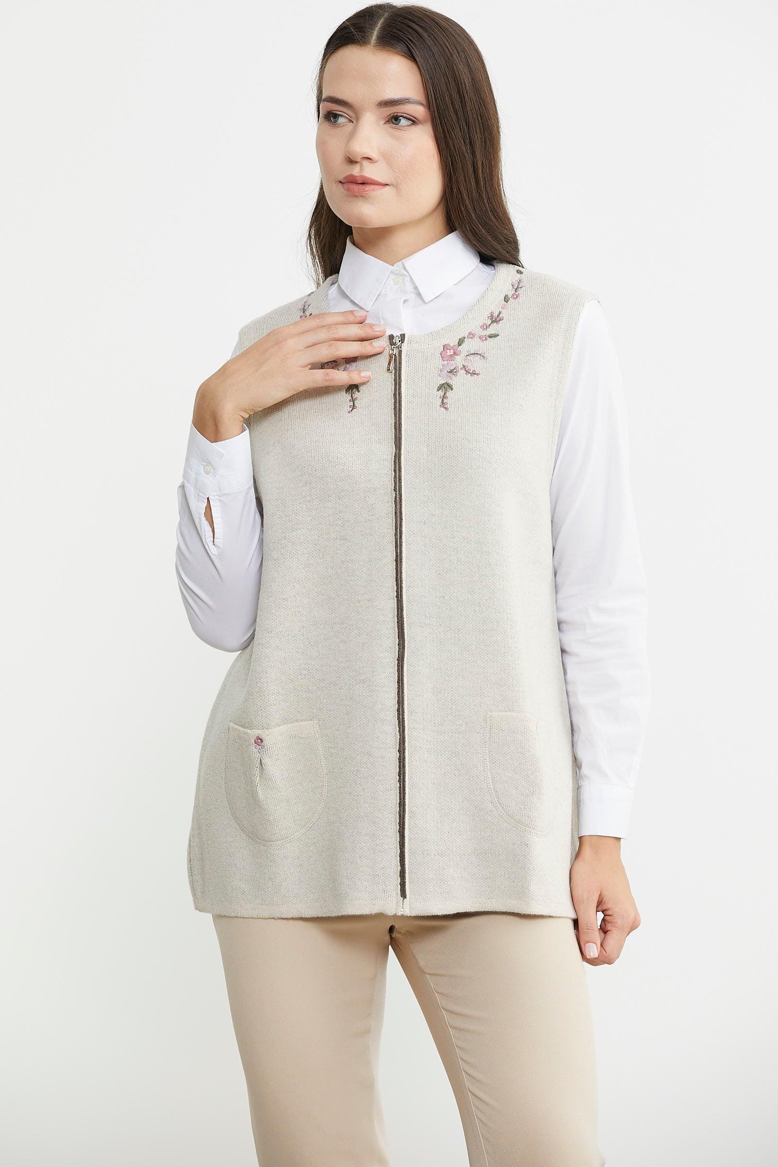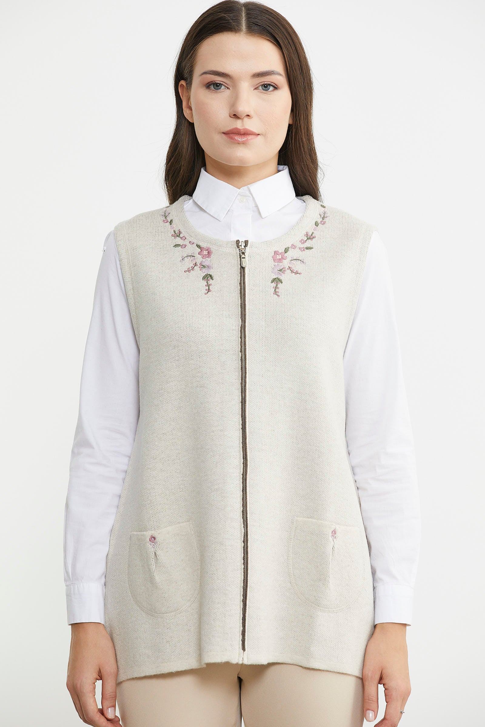 Fermuarlı Nakış Detaylı Yünlü Triko Yelek - Taş