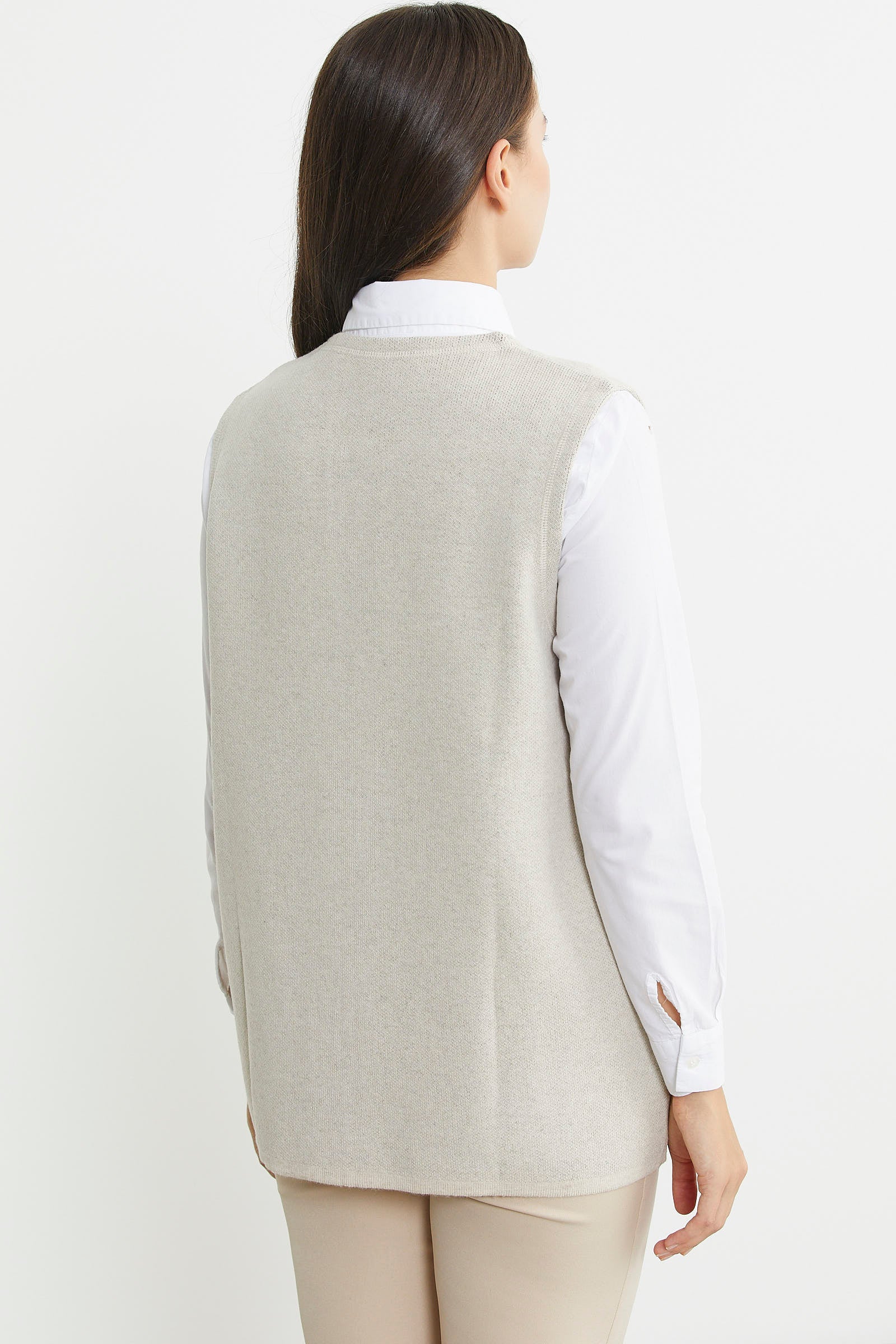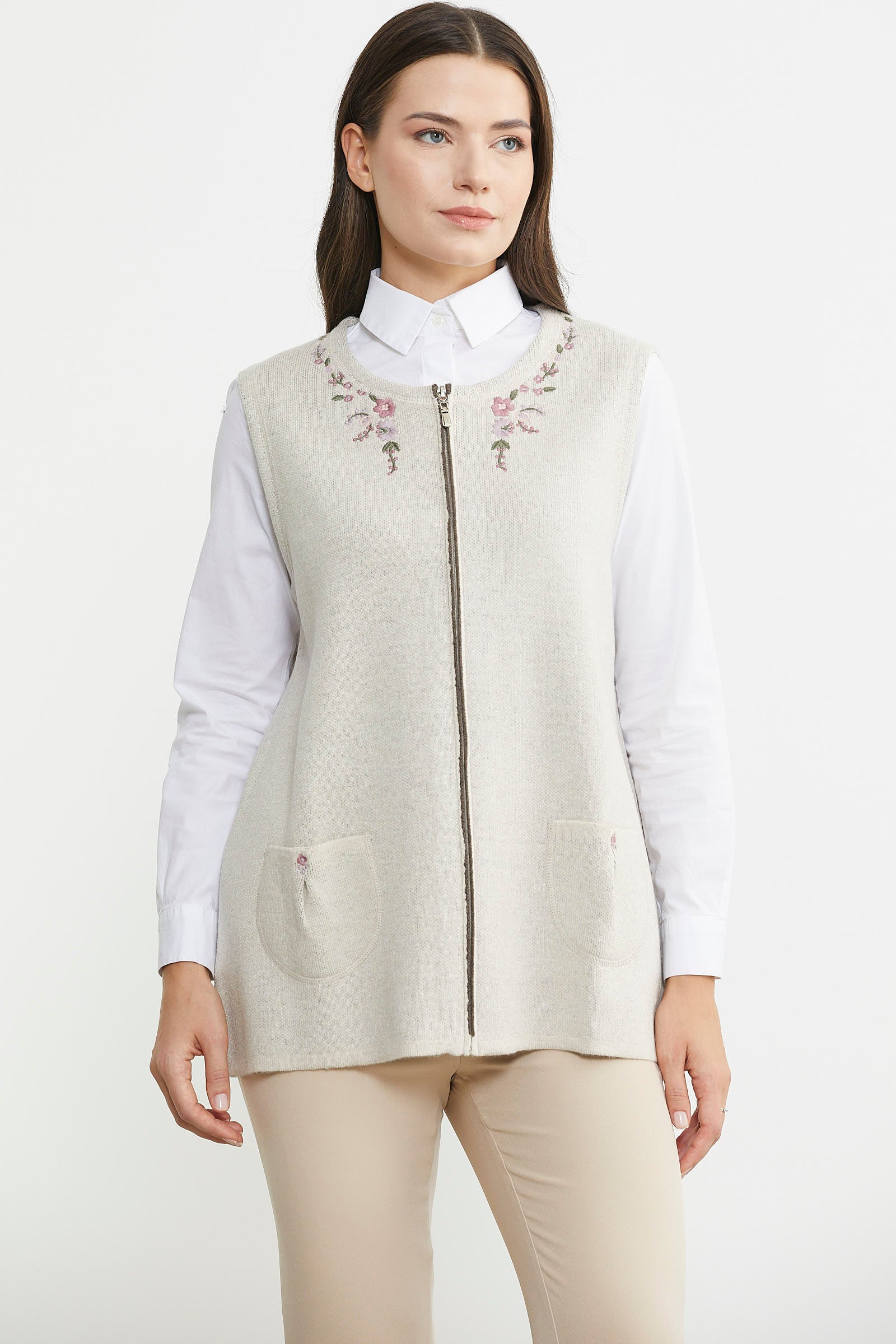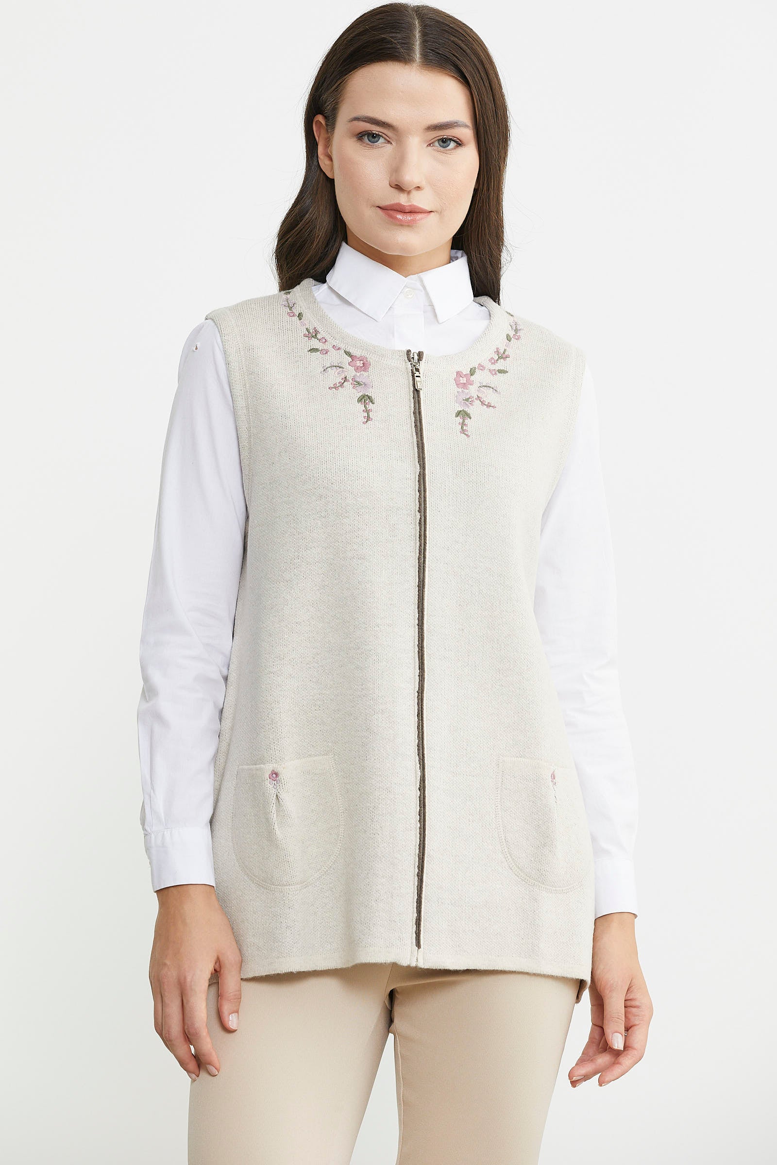 Fermuarlı Nakış Detaylı Yünlü Triko Yelek - Taş