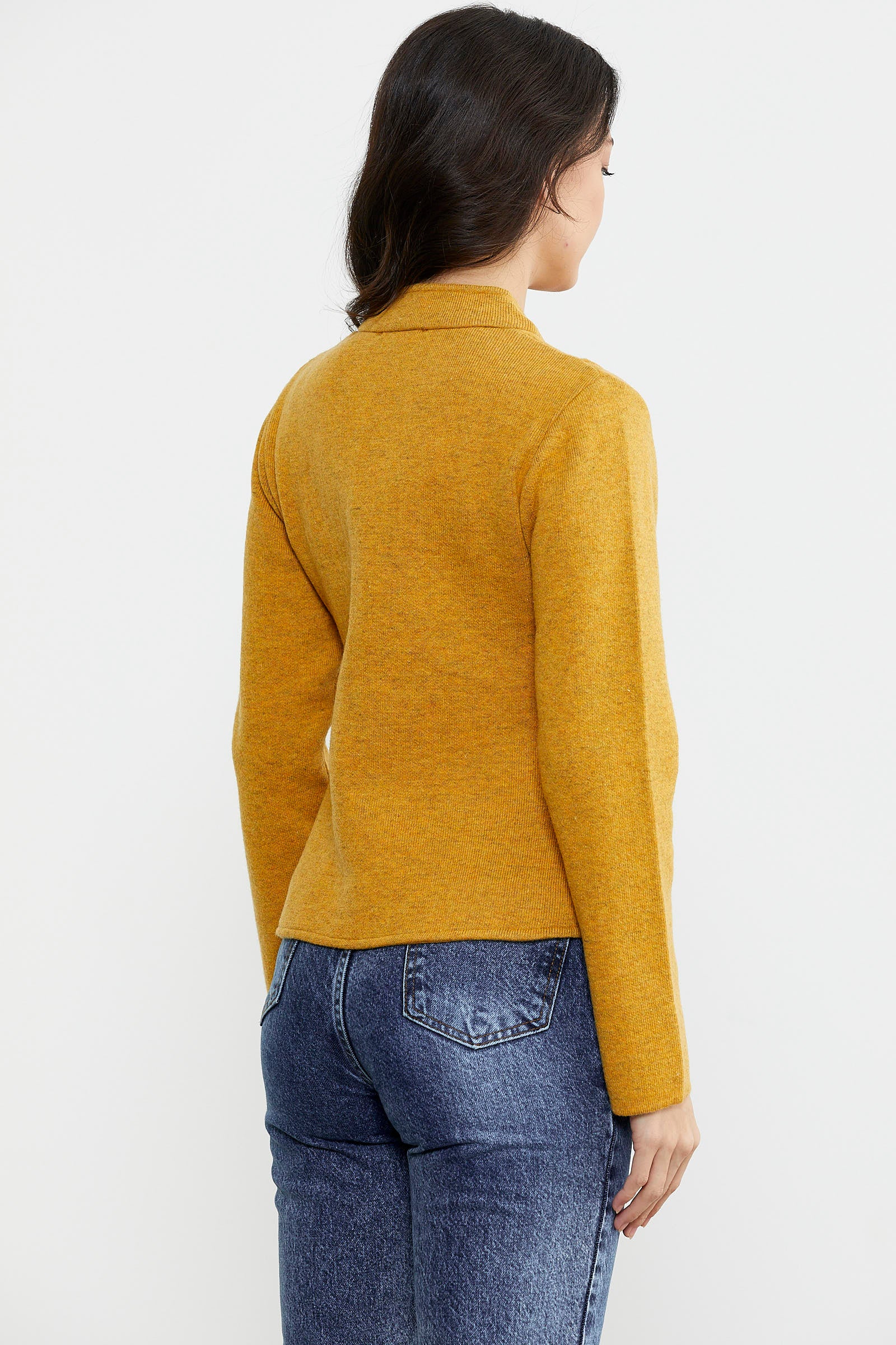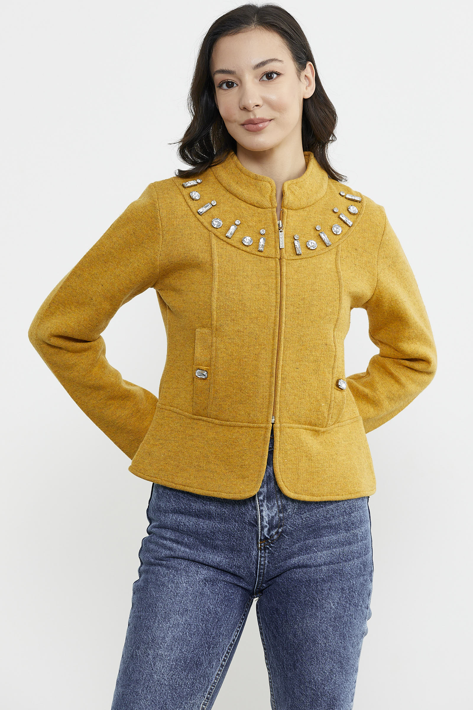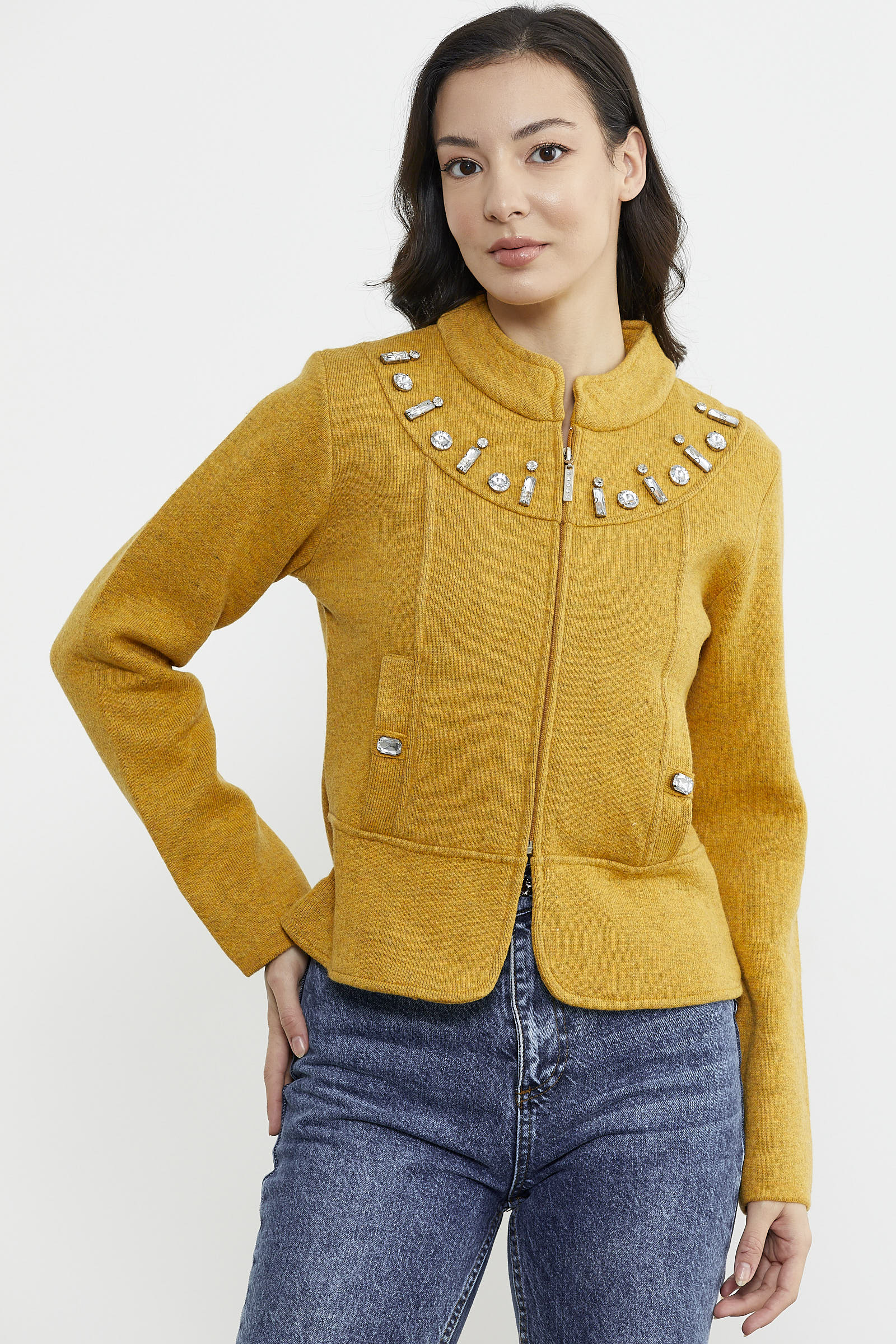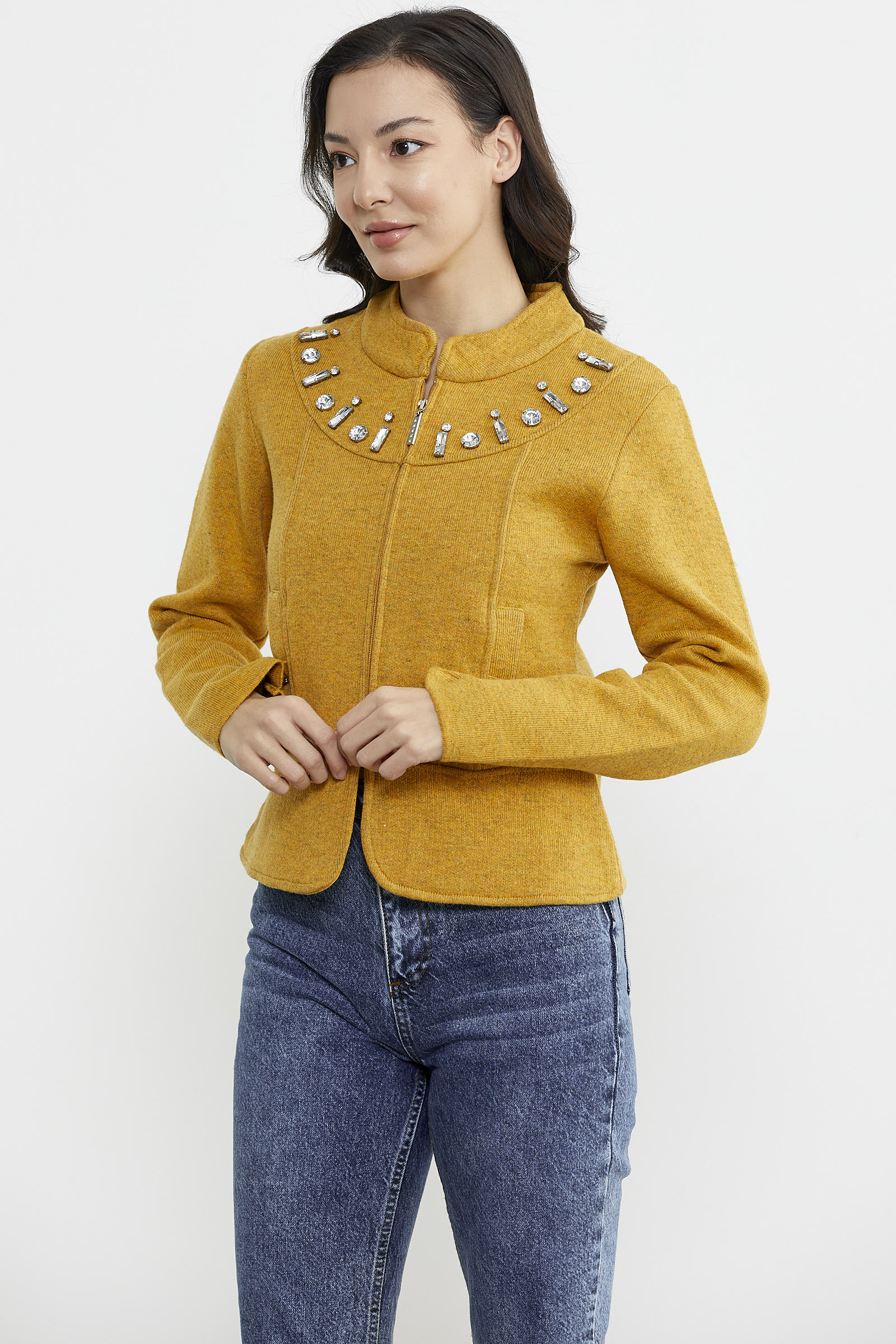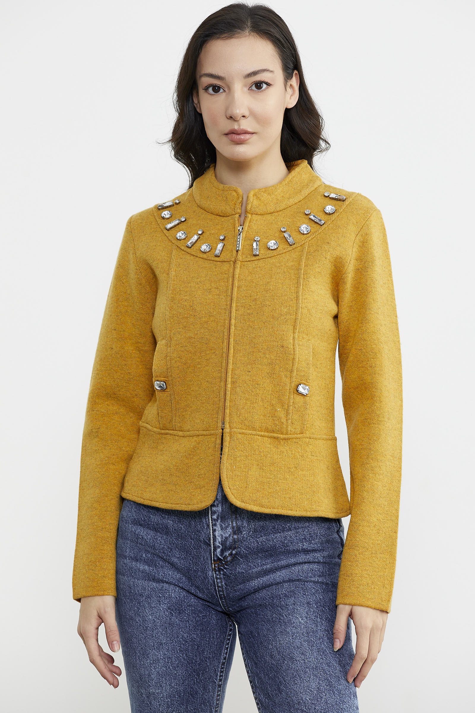 Fermuarlı Taş Detaylı Yünlü Triko Ceket - Güneş
