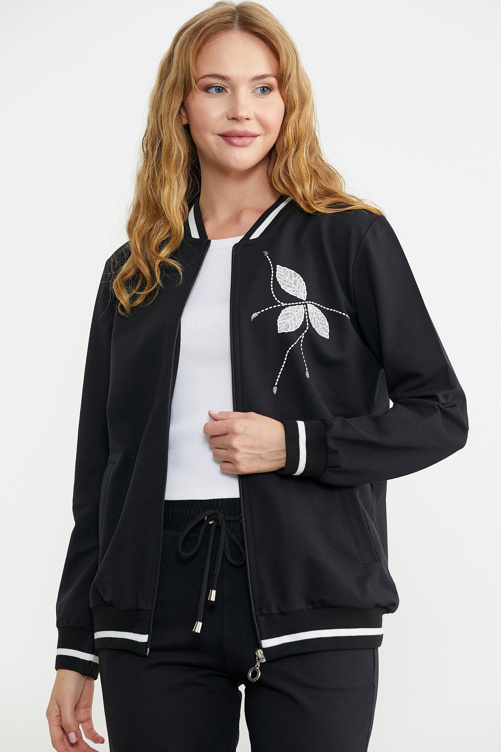 Örme ribana detayına sahip fermuar kapamalı eşofman takım sportif bir görünüm sağlamaktadır.