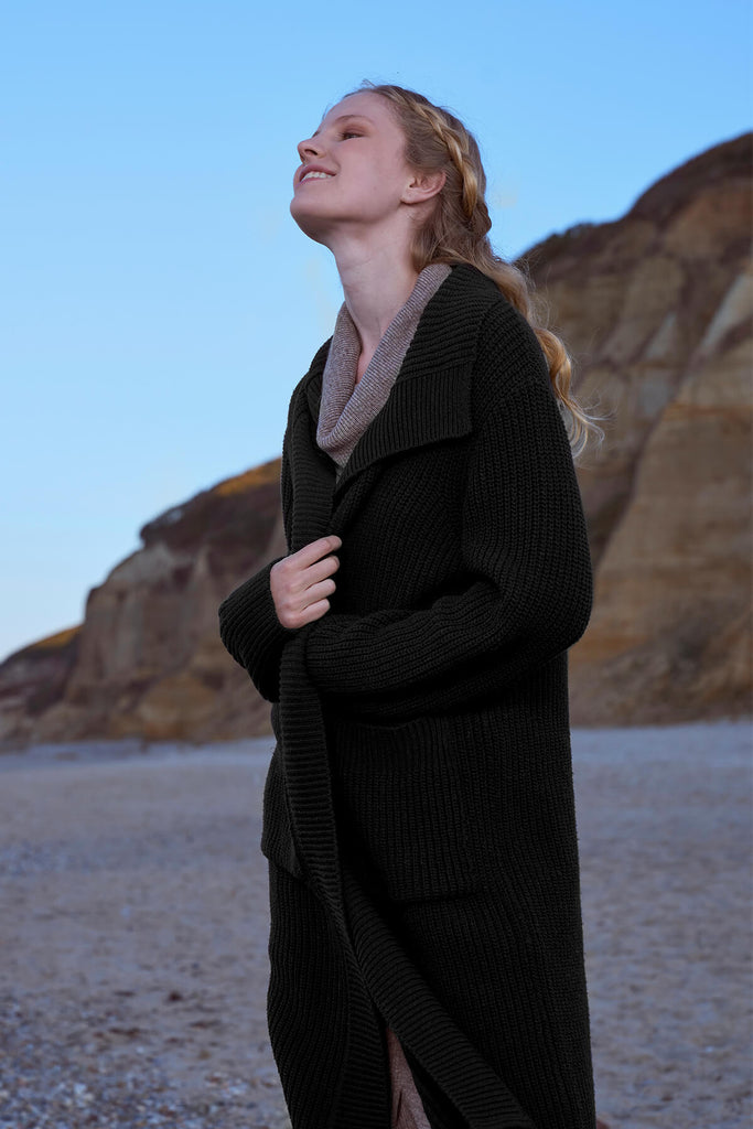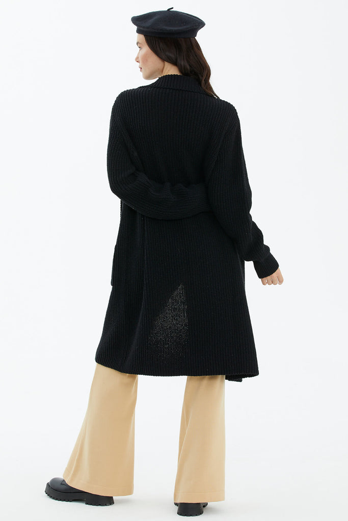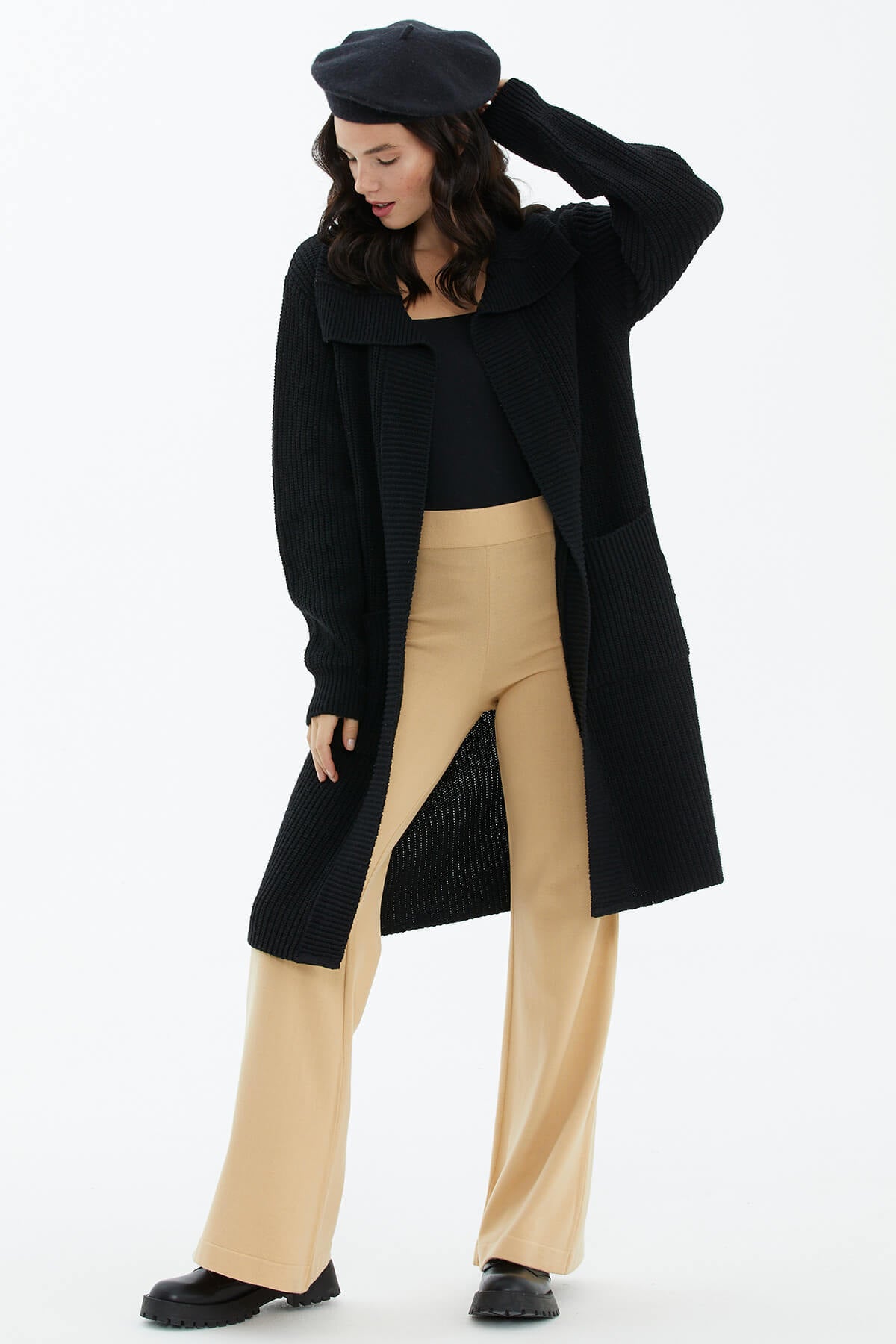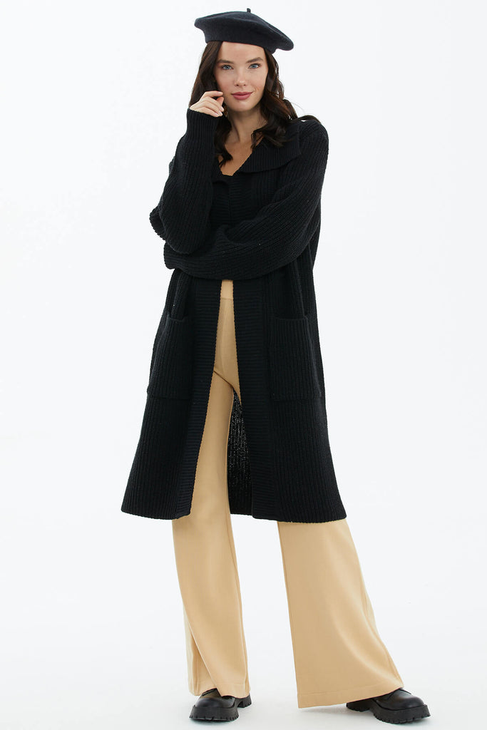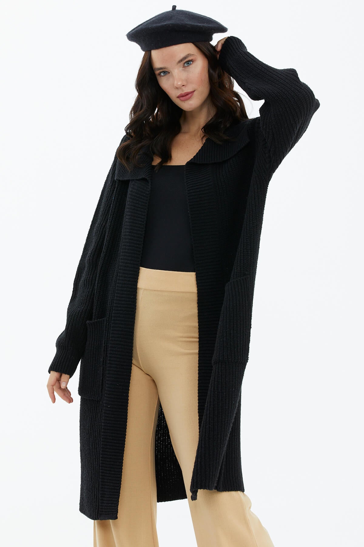 Geniş Yaka Salaş Triko Uzun Hırka - Siyah
