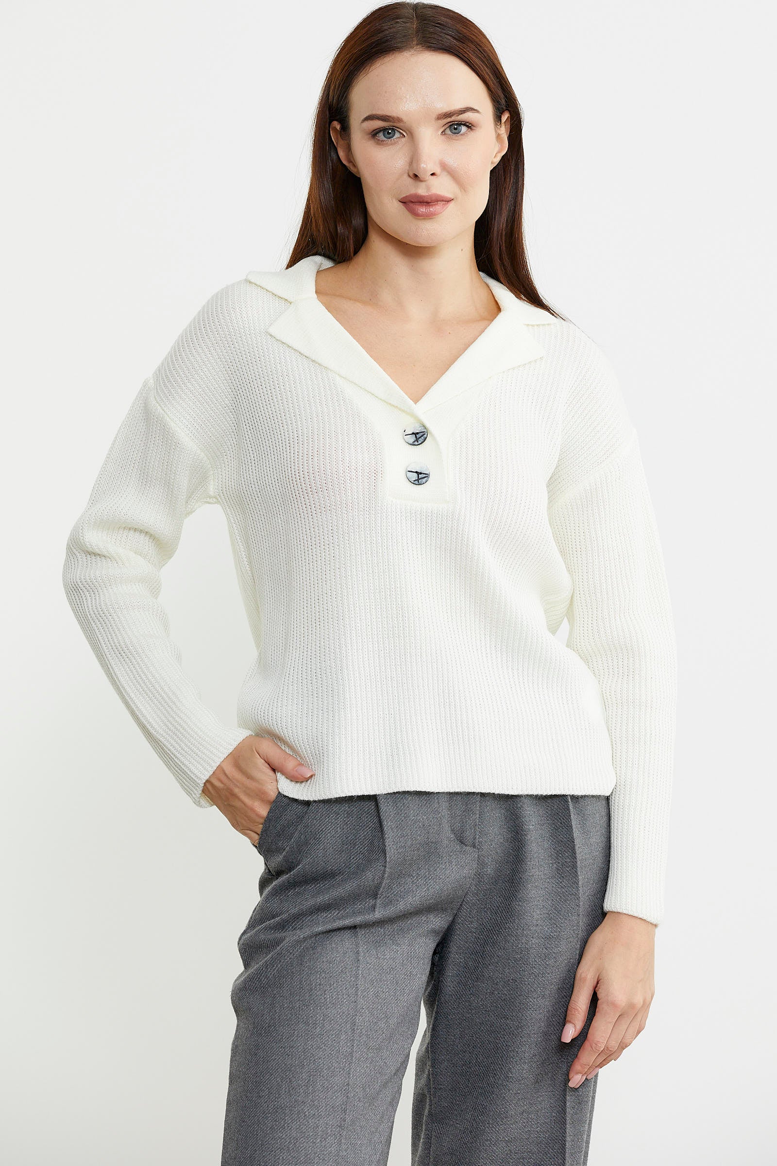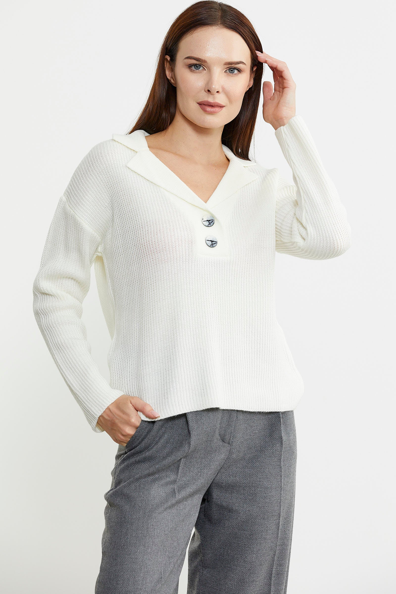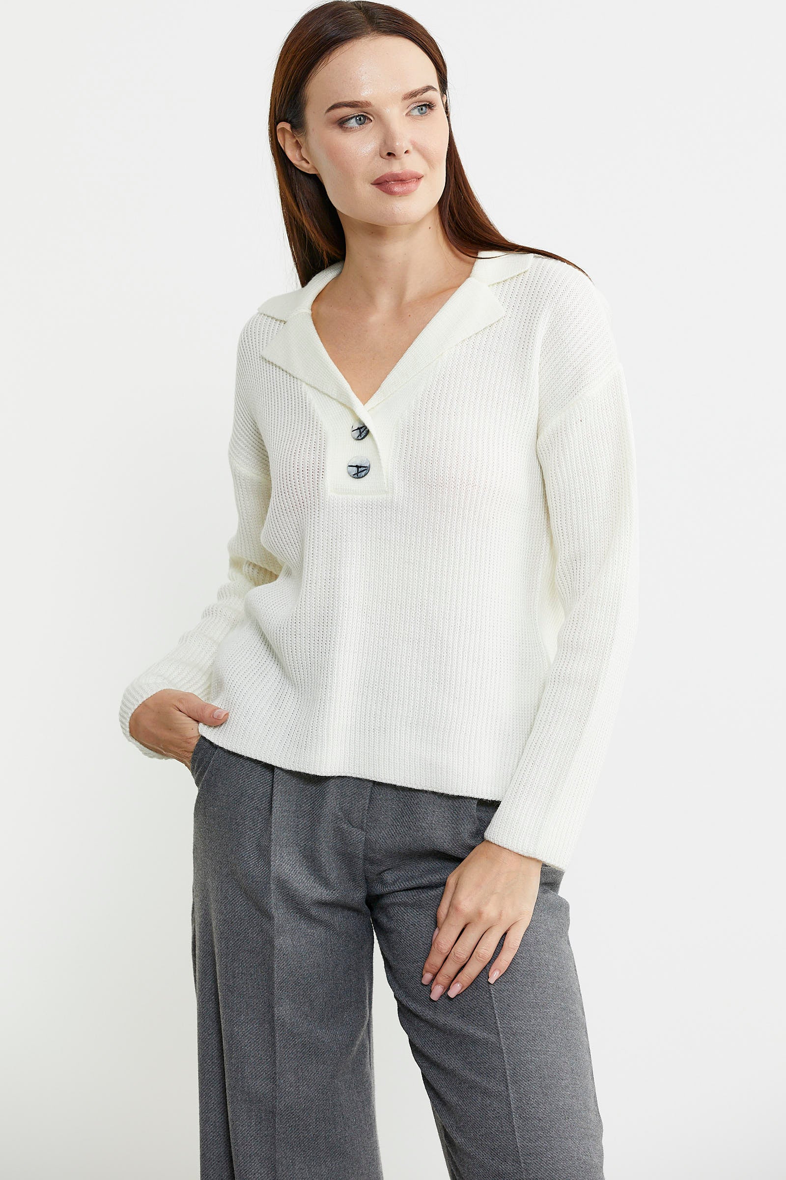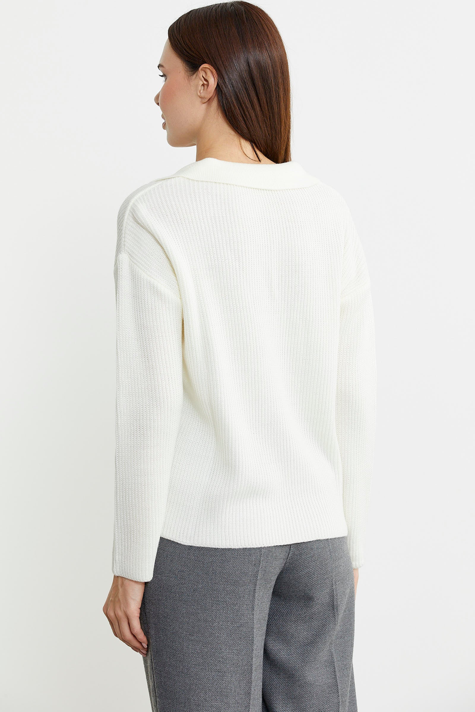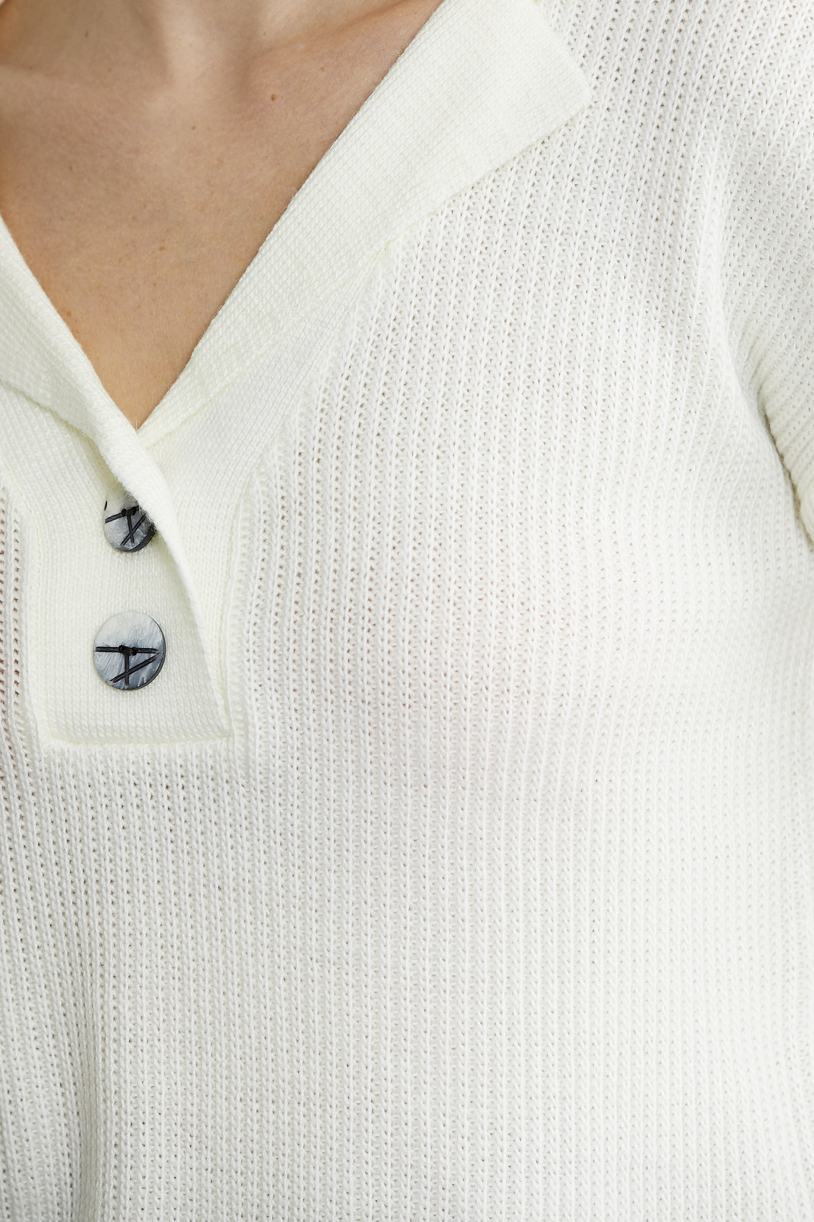 Gömlek Yaka Düğmeli Yünlü Triko Kazak - Kemik