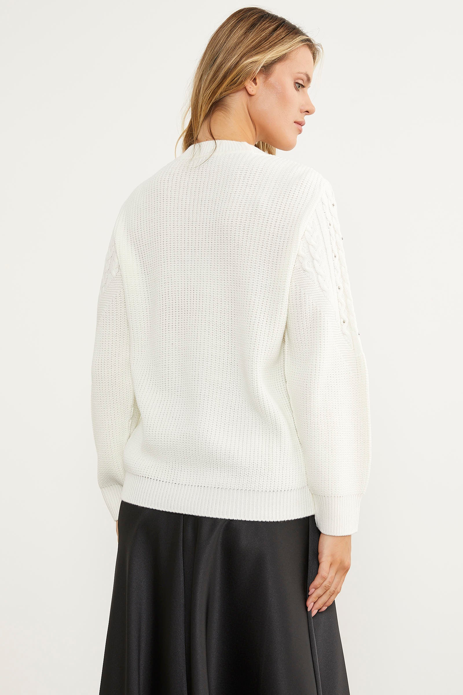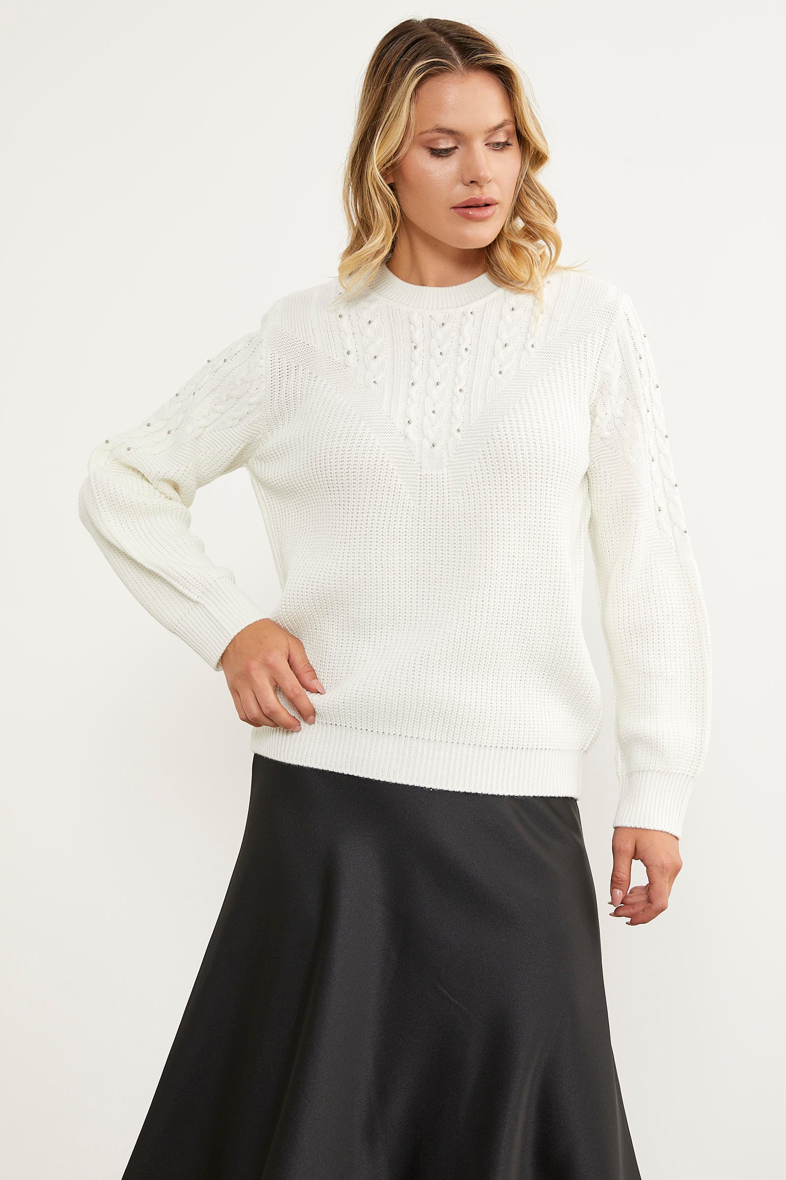 Ön ve kol kısmı örgü ve inci detaylı arkası düz olan triko kazak gönülleri fetheden tasarımıyla zarif ve şık bir görünüme ortaklık ediyor. Günlük sadeliğinizi korurken aynı anda da görkemli hissetmenizi sağlayan bu parça esnek dokusuyla konforu vadediyor.