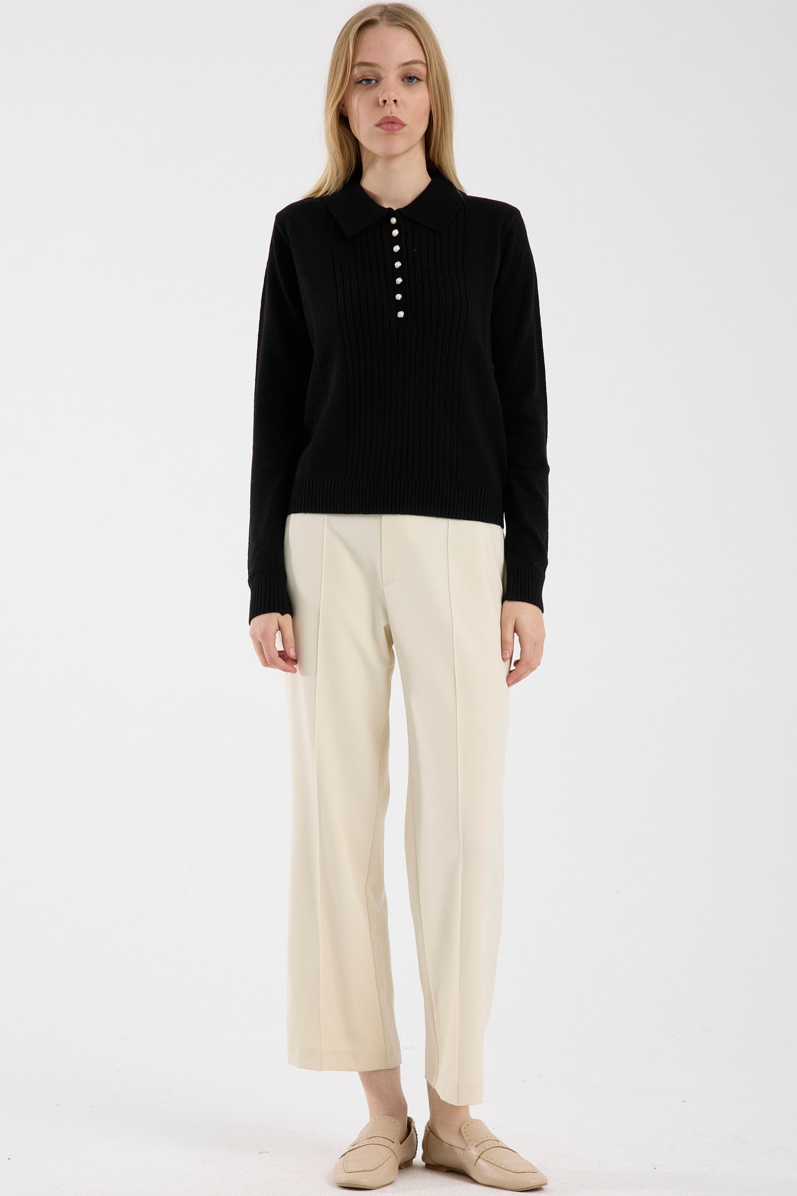 İnci Düğmeli Yakalı Triko Kazak - Siyah