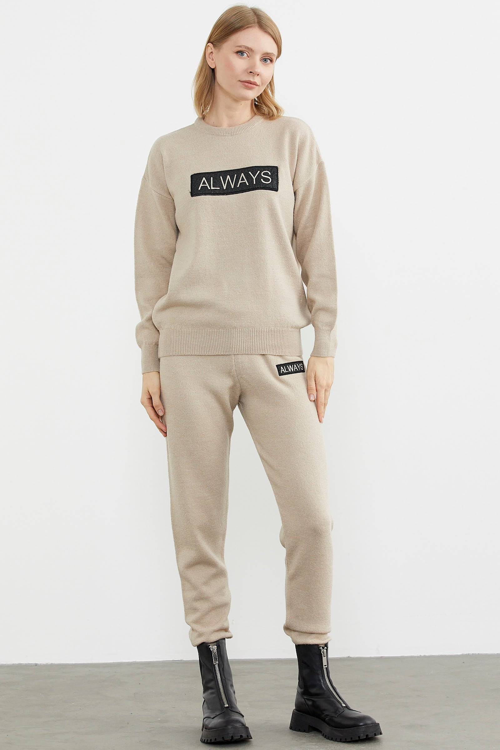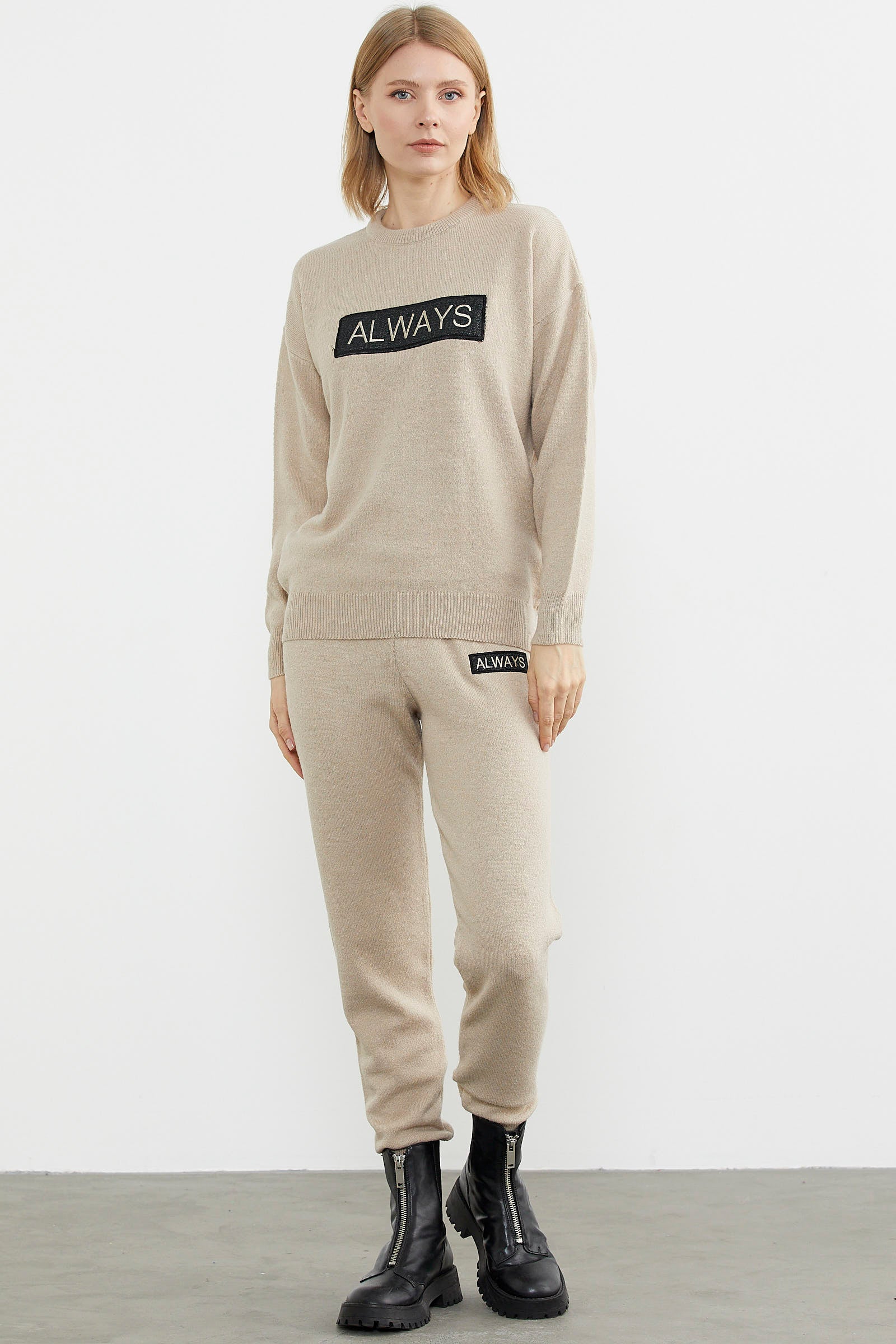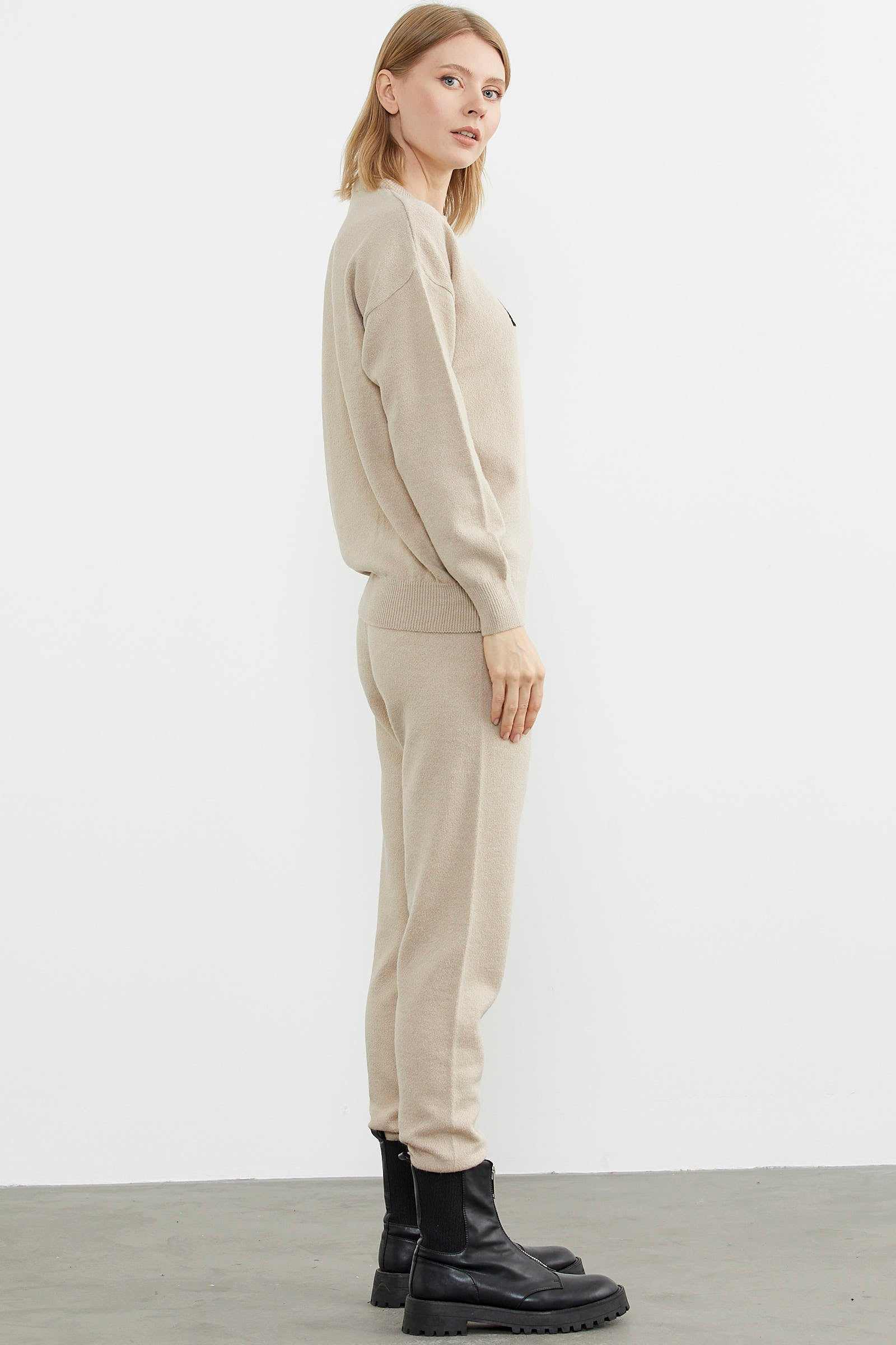 Jogger Pantolonlu Baskılı Triko Takım - Bej