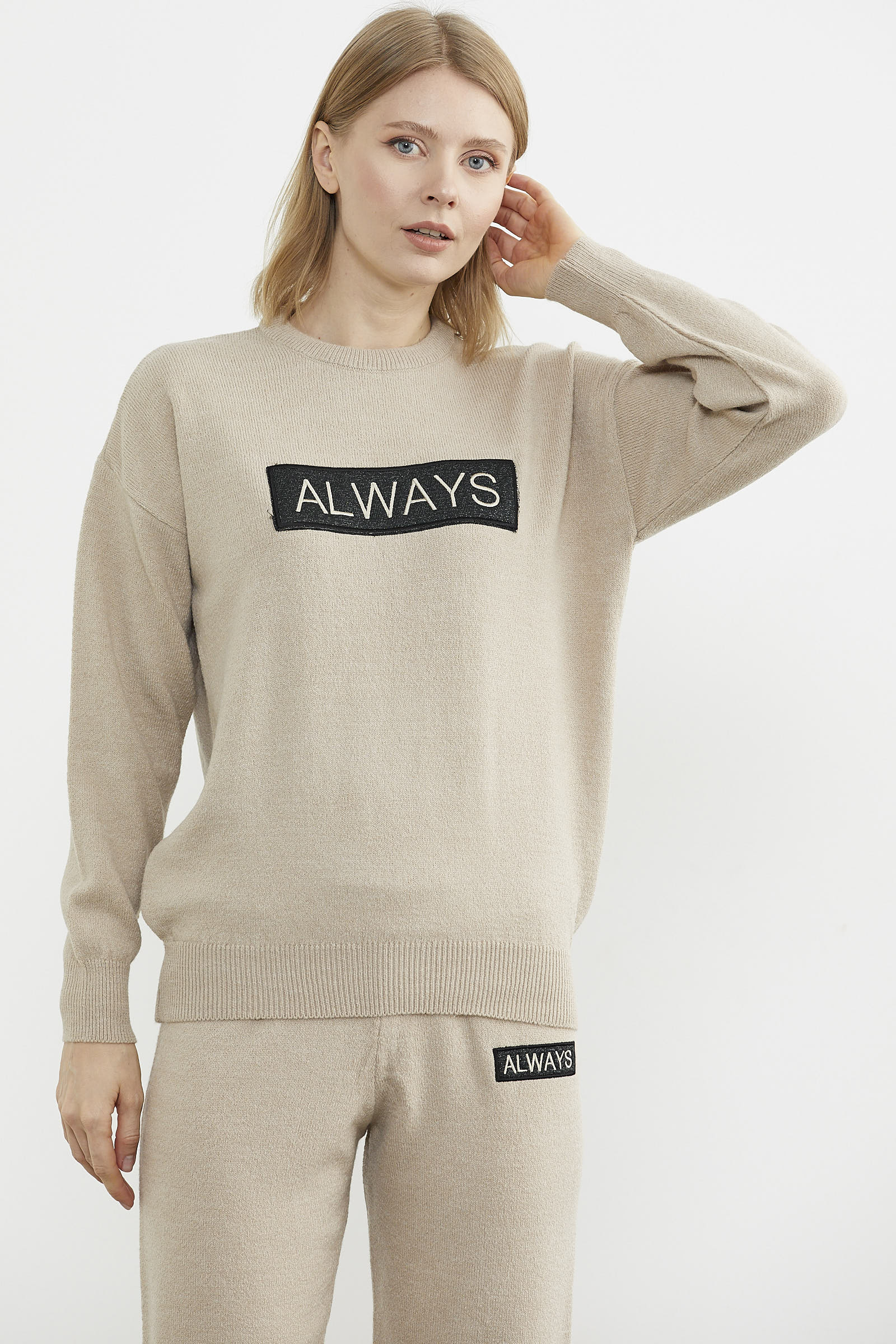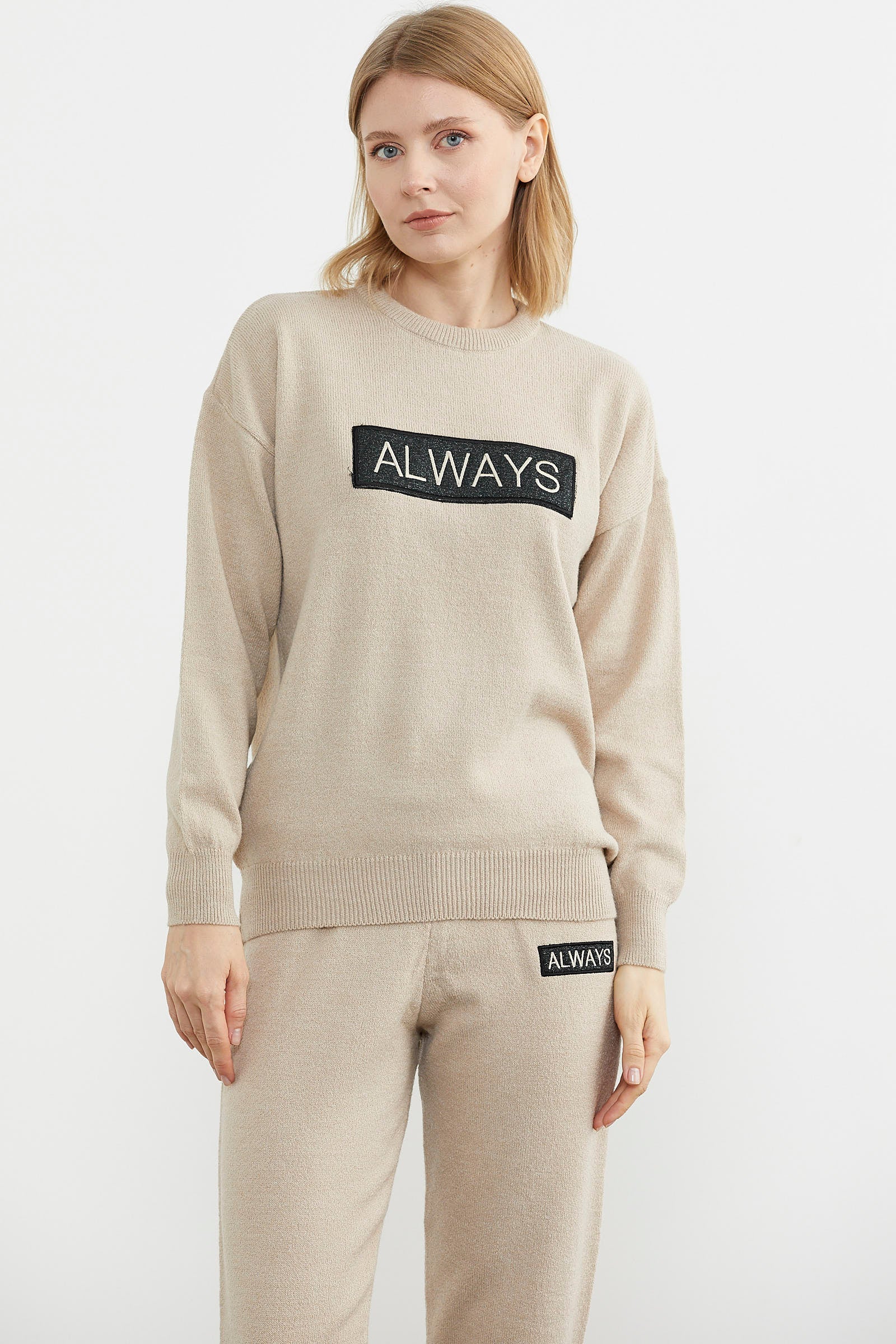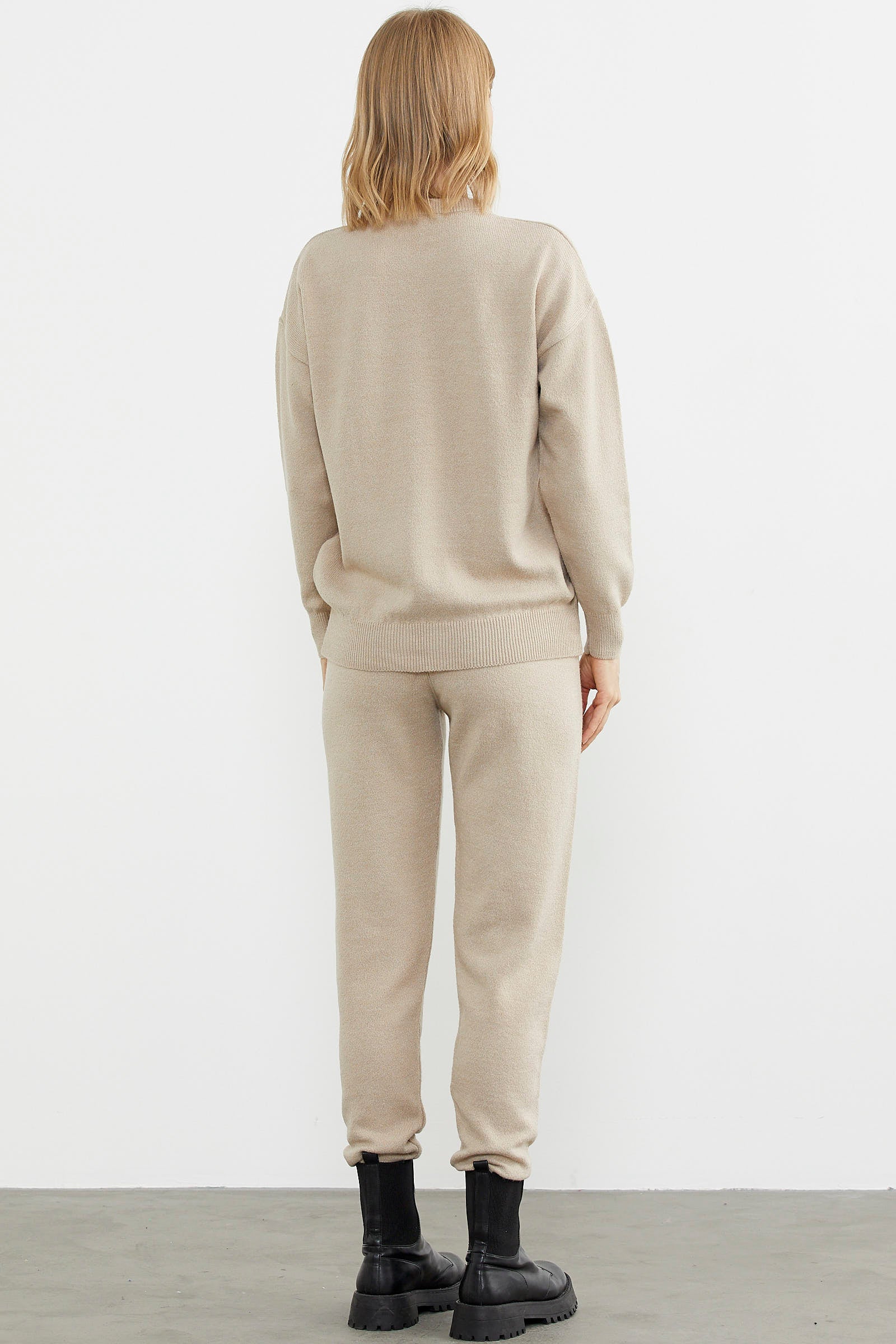 Jogger Pantolonlu Baskılı Triko Takım - Bej