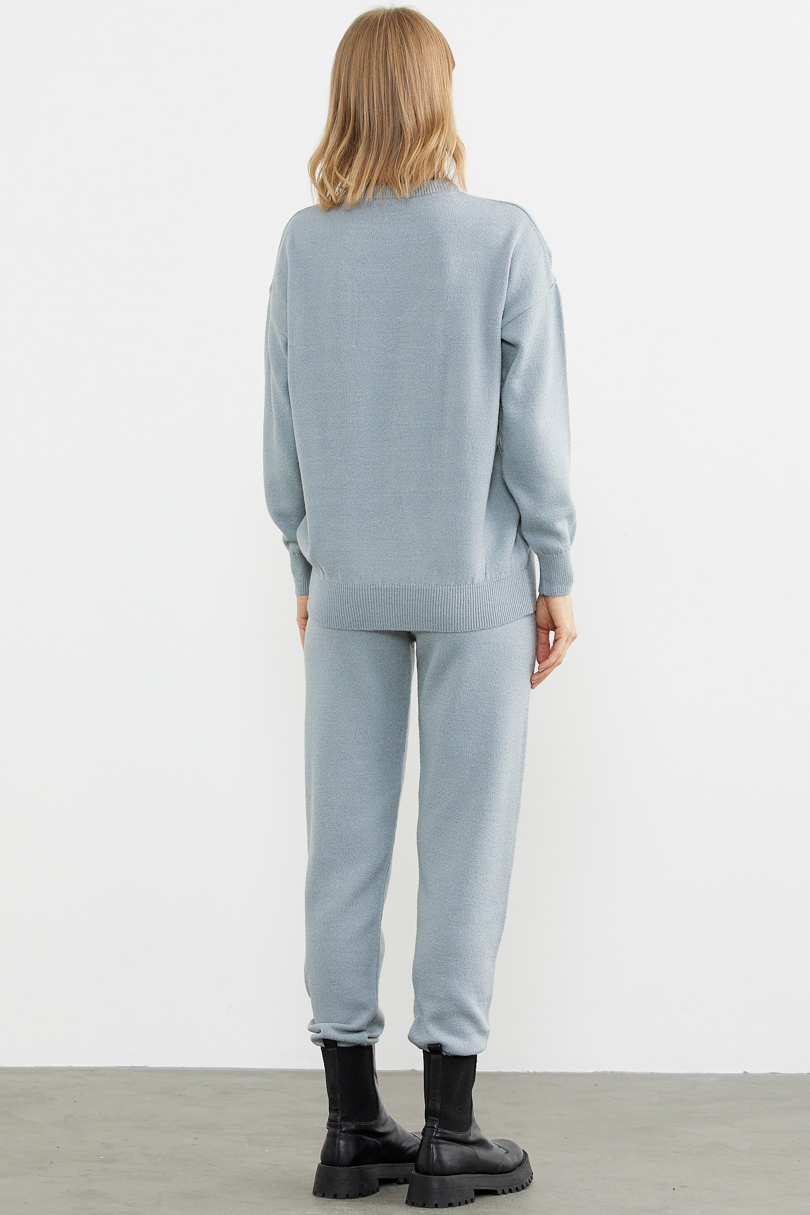 Yazı baskıya sahip düşük omuzlu sıfır yaka uzun mkollu üst ve lastikli bele sahip jogger paça alttan oluşan ikili triko takım size rahatlığı sunarken renkleri sayesinde canlı bir görünüm kazandırır. Kombin kolaylığı sağlayan bu parça kurtarıcınız olacaktır.