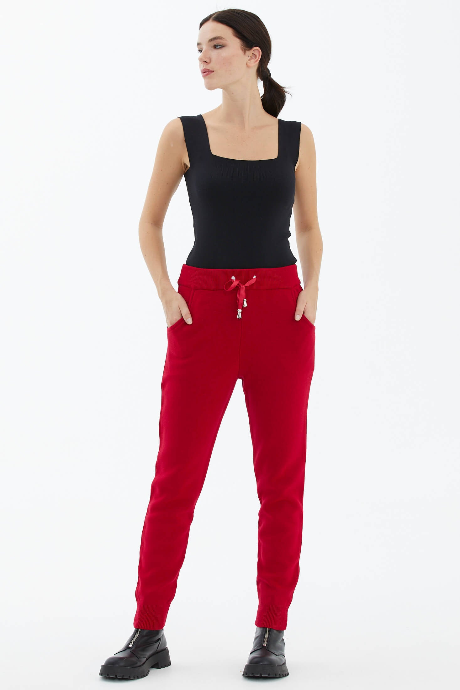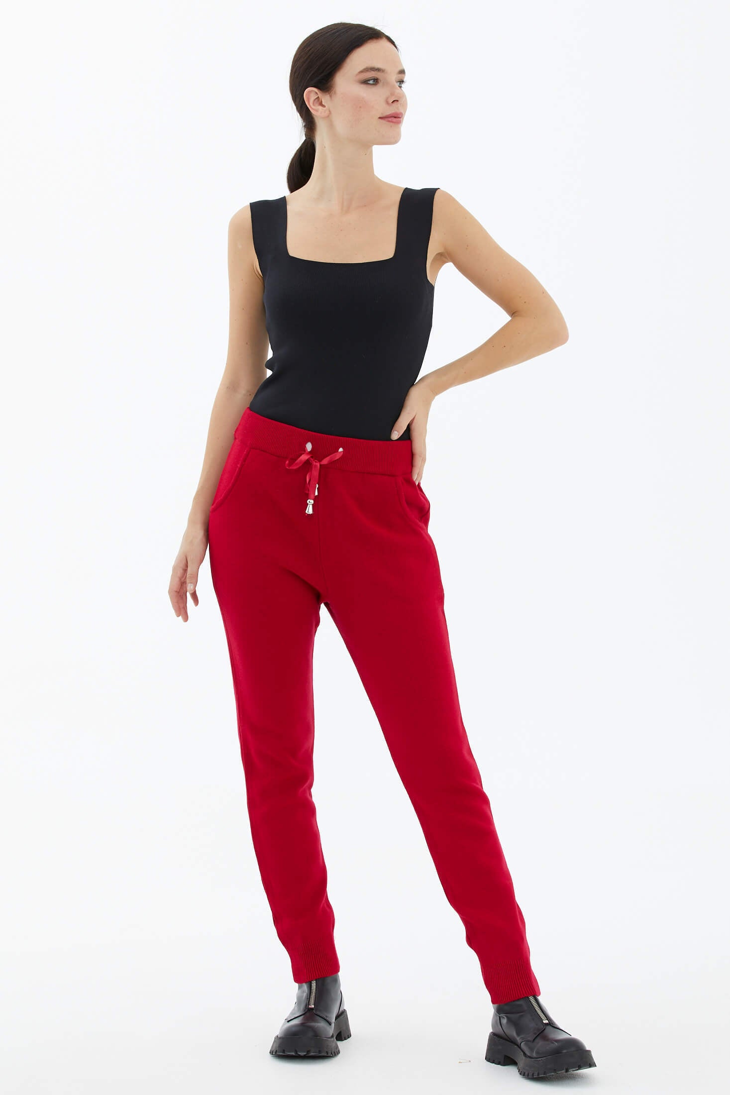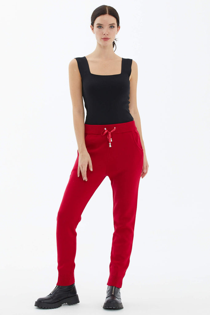 Beli lastik kaplı ve büzgü bağı bulunan, paça ağızları ve beli lastik örgülü jogger triko pantolon.