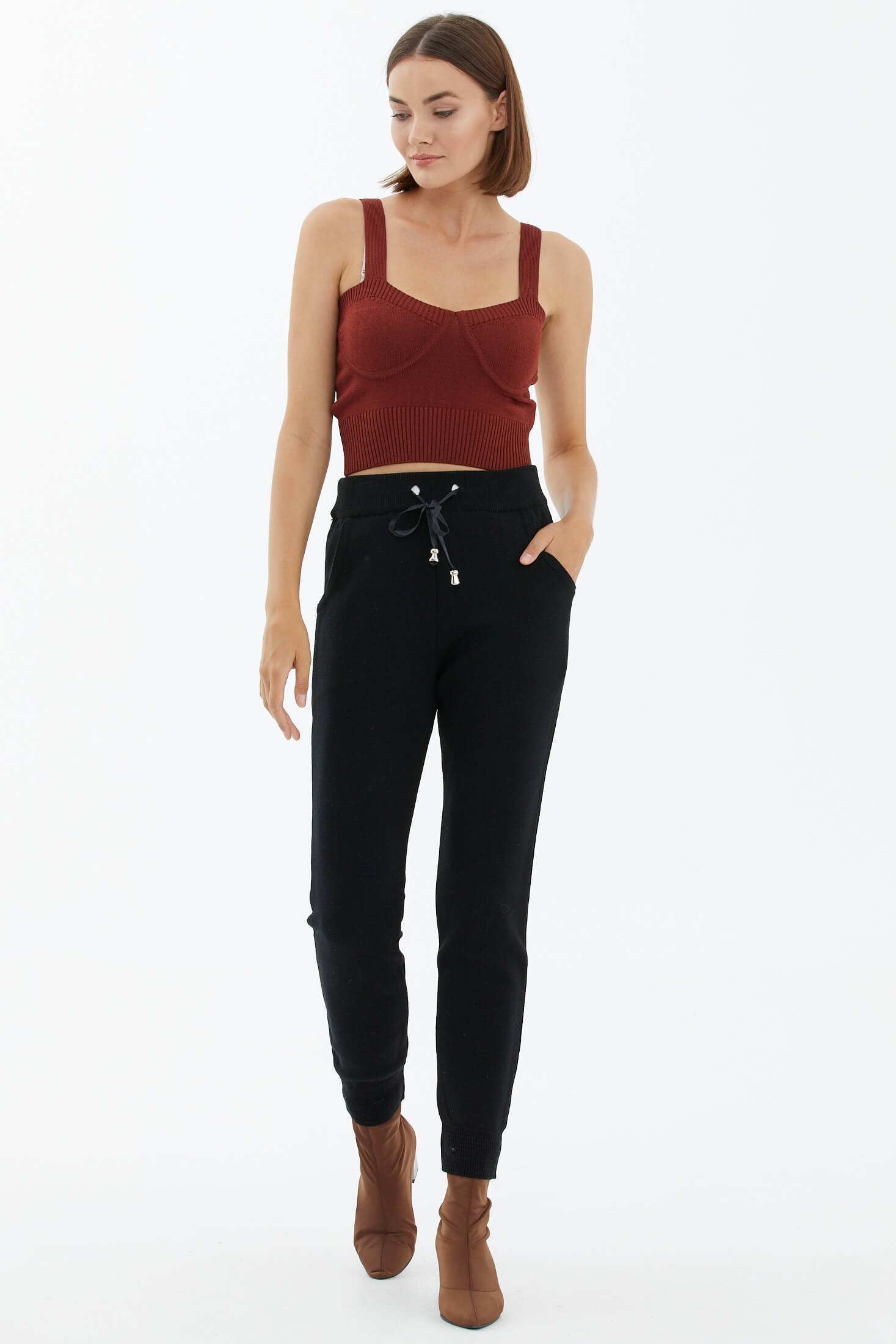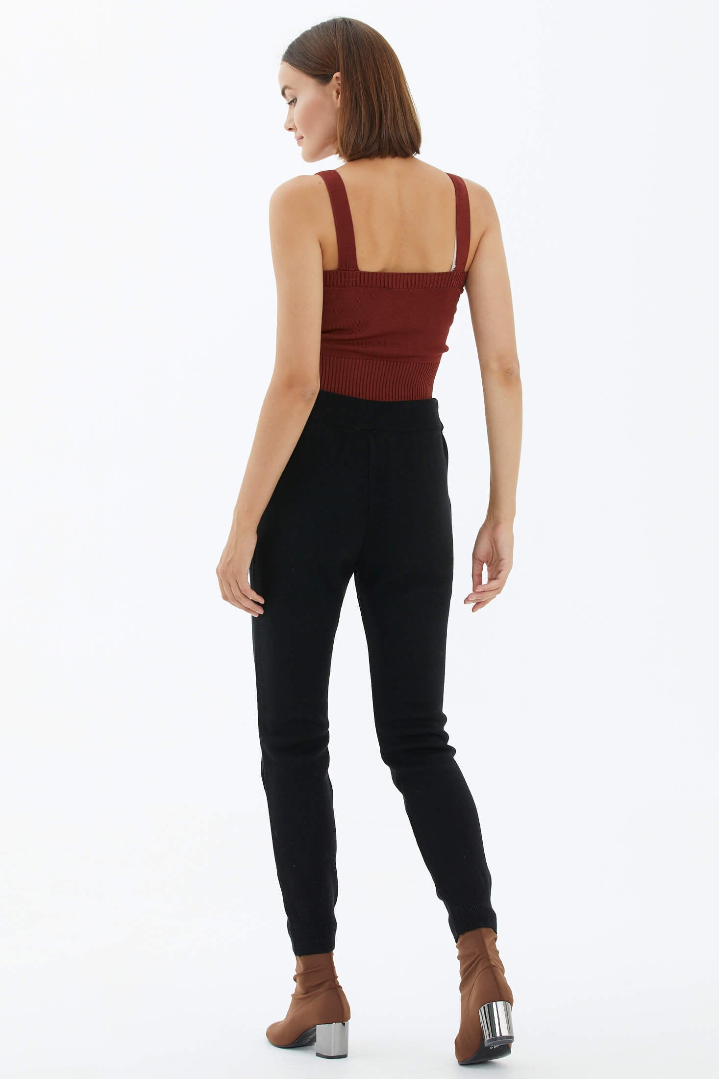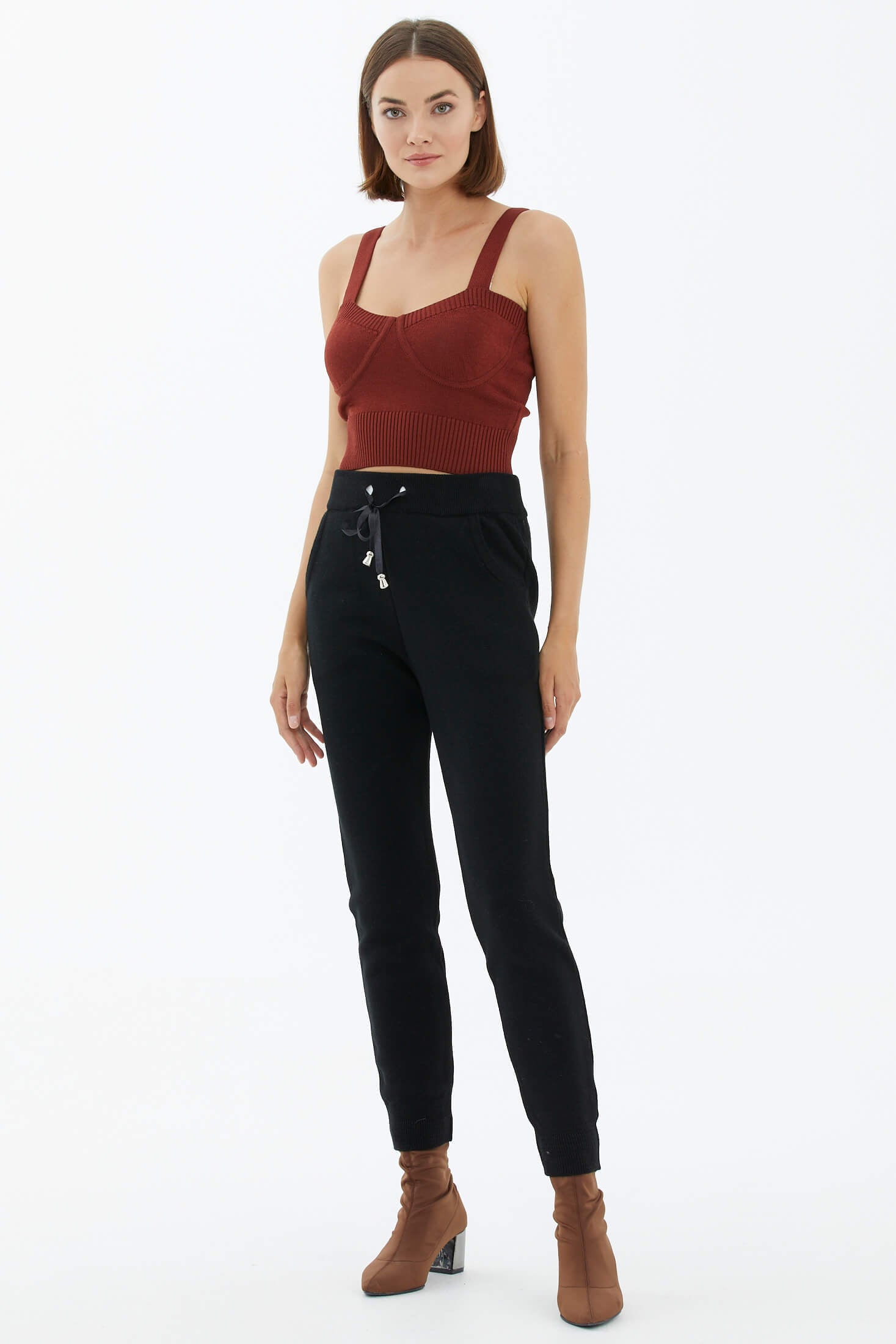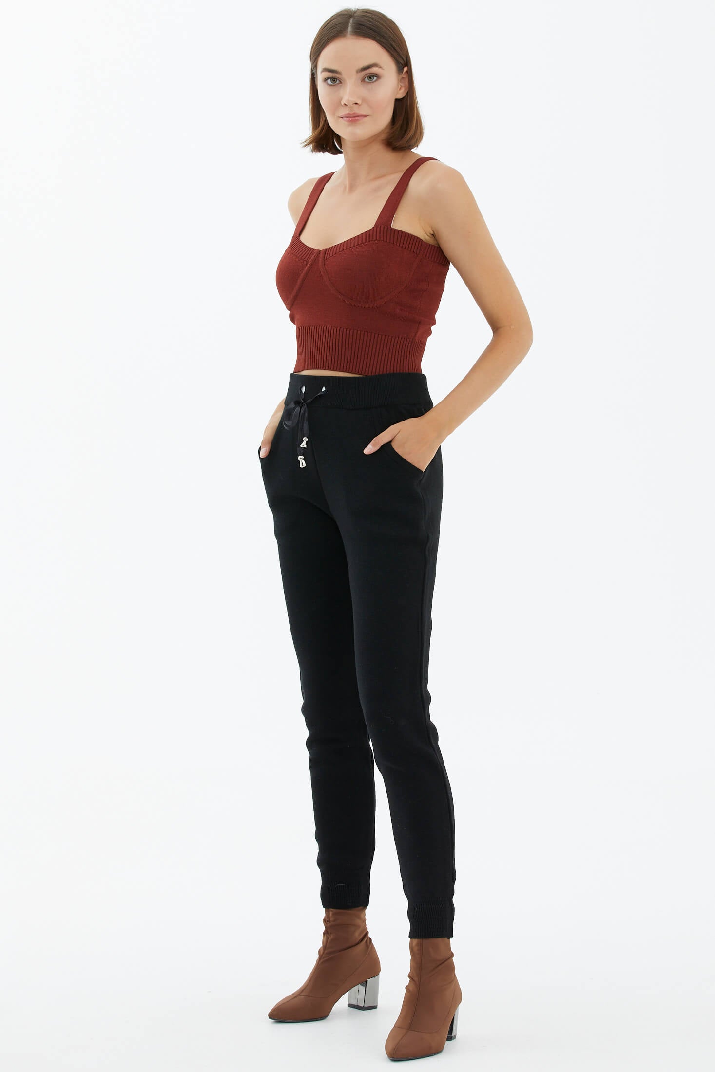 Beli lastik kaplı ve büzgü bağı bulunan, paça ağızları ve beli lastik örgülü jogger triko pantolon.