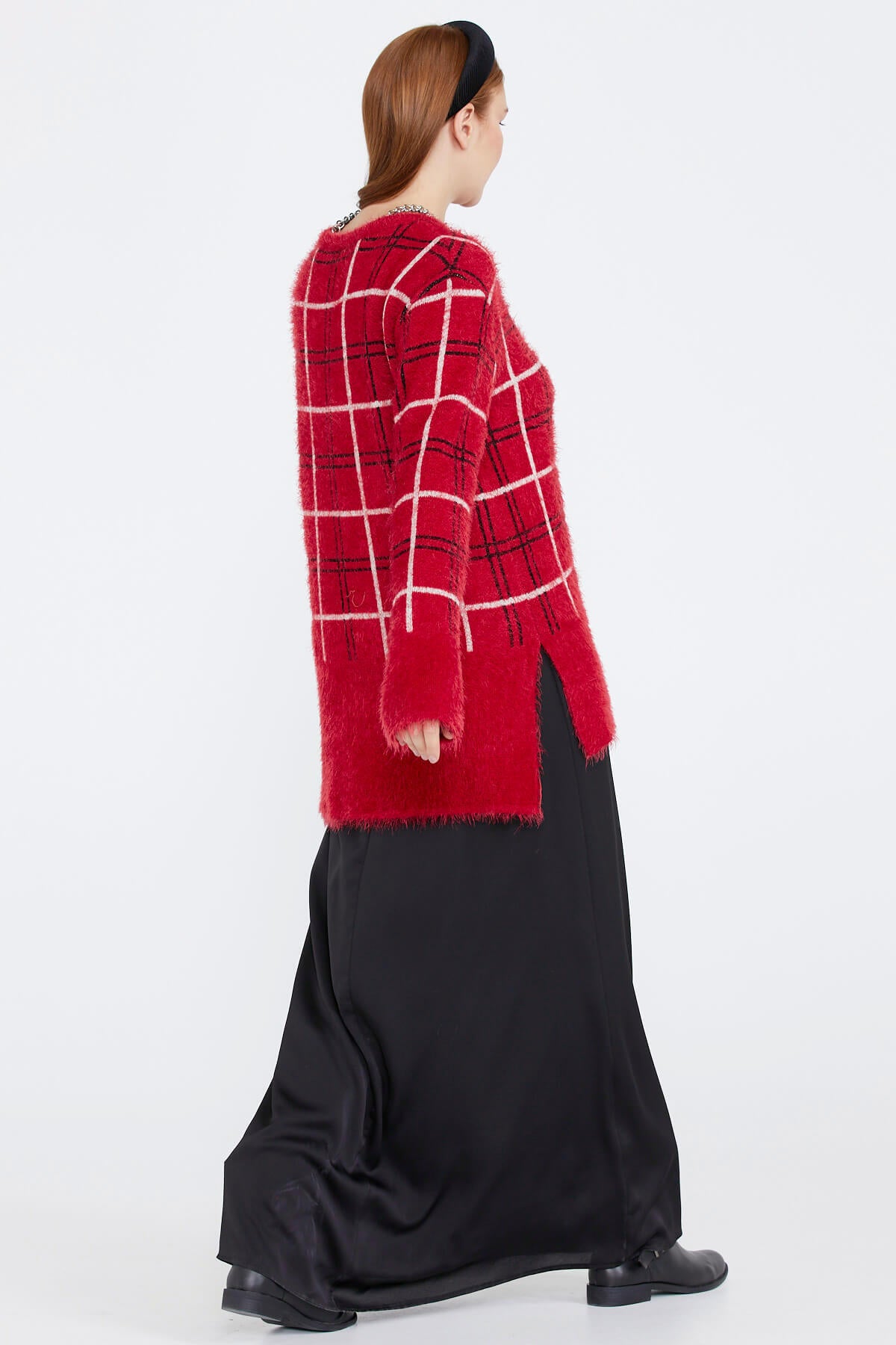 Stilinizde yer bulan triko kazak, yumuşacık dokusu ve desenli formu ile vazgeçilmeziniz arasında yerini alacak. Yuvarlak yaka ve uzun kollu model, yanlara konumlandırılan yırtmaç detayı ile farklı bir tarz yakalıyor.