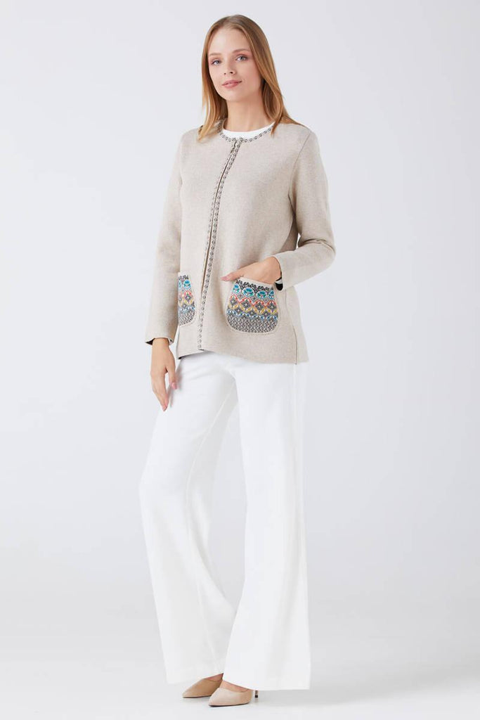 Kadın Fermuarlı Cepli Triko Ceket - Bej - Antrasit