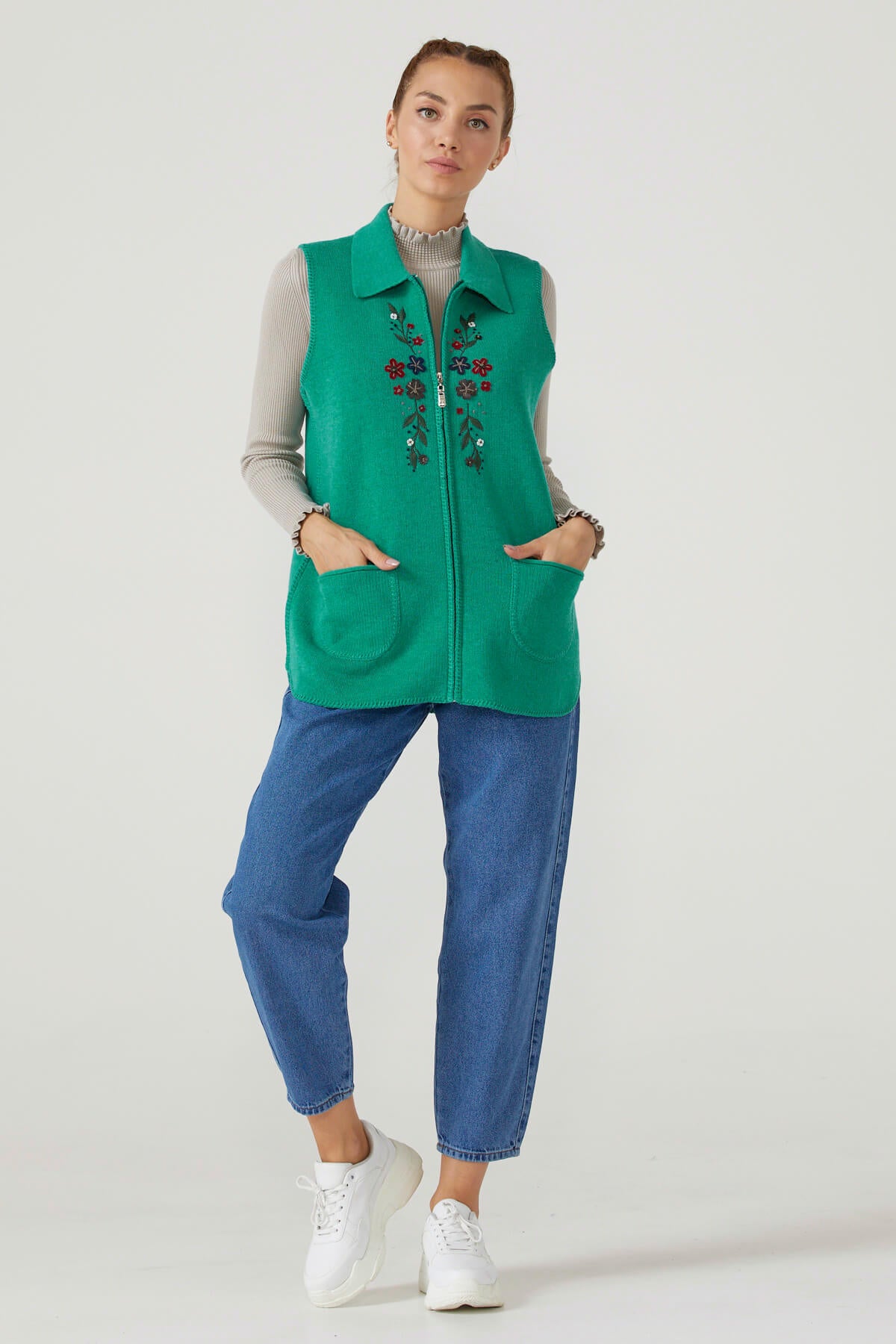 Sıfır kollu, nakış detaylı yelek modern tasarımı ile stilinize dikkat çekiyor. Yumuşaklığı ile gün boyu konforlu hissetmenizi sağlayacak bu polo yaka tasarım, fermuar kapaması ile pratik kullanım sağlıyor.