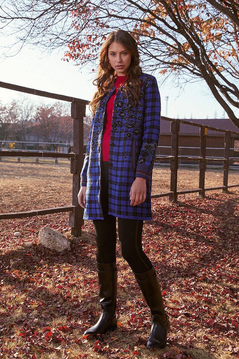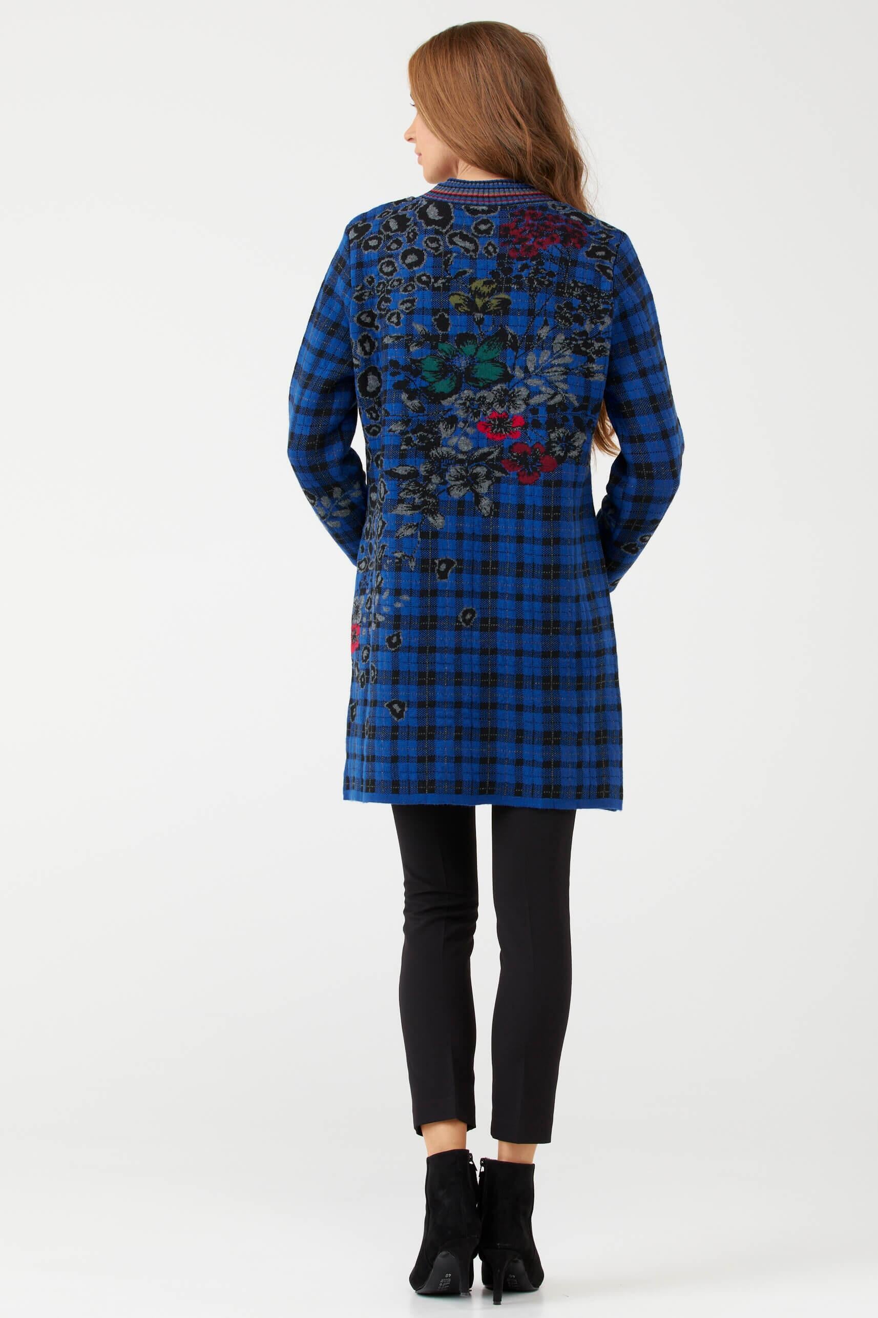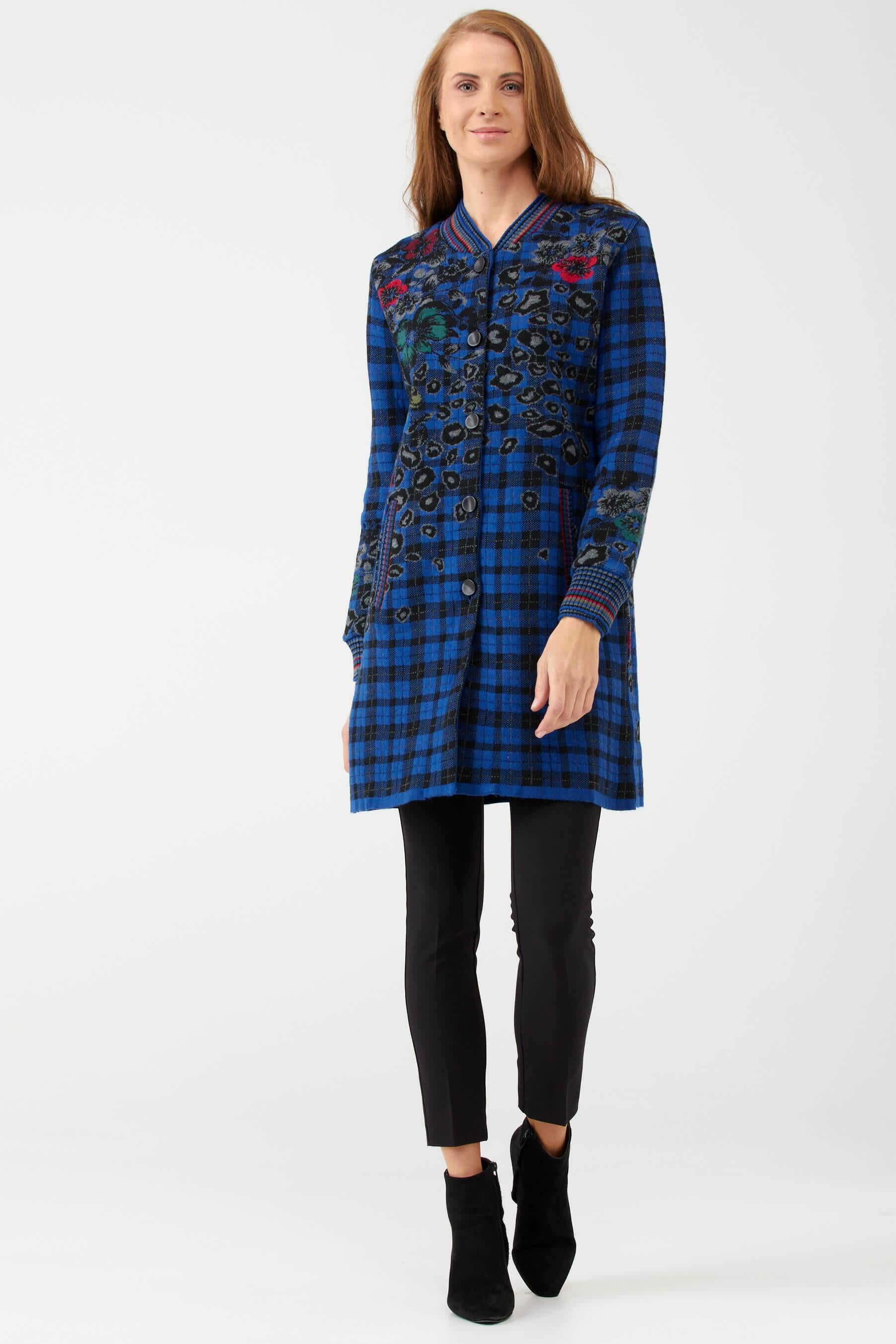 Hakim yaka, düğme kapaması ile kullanım kolaylığı sunan, desenli, uzun triko ceket.