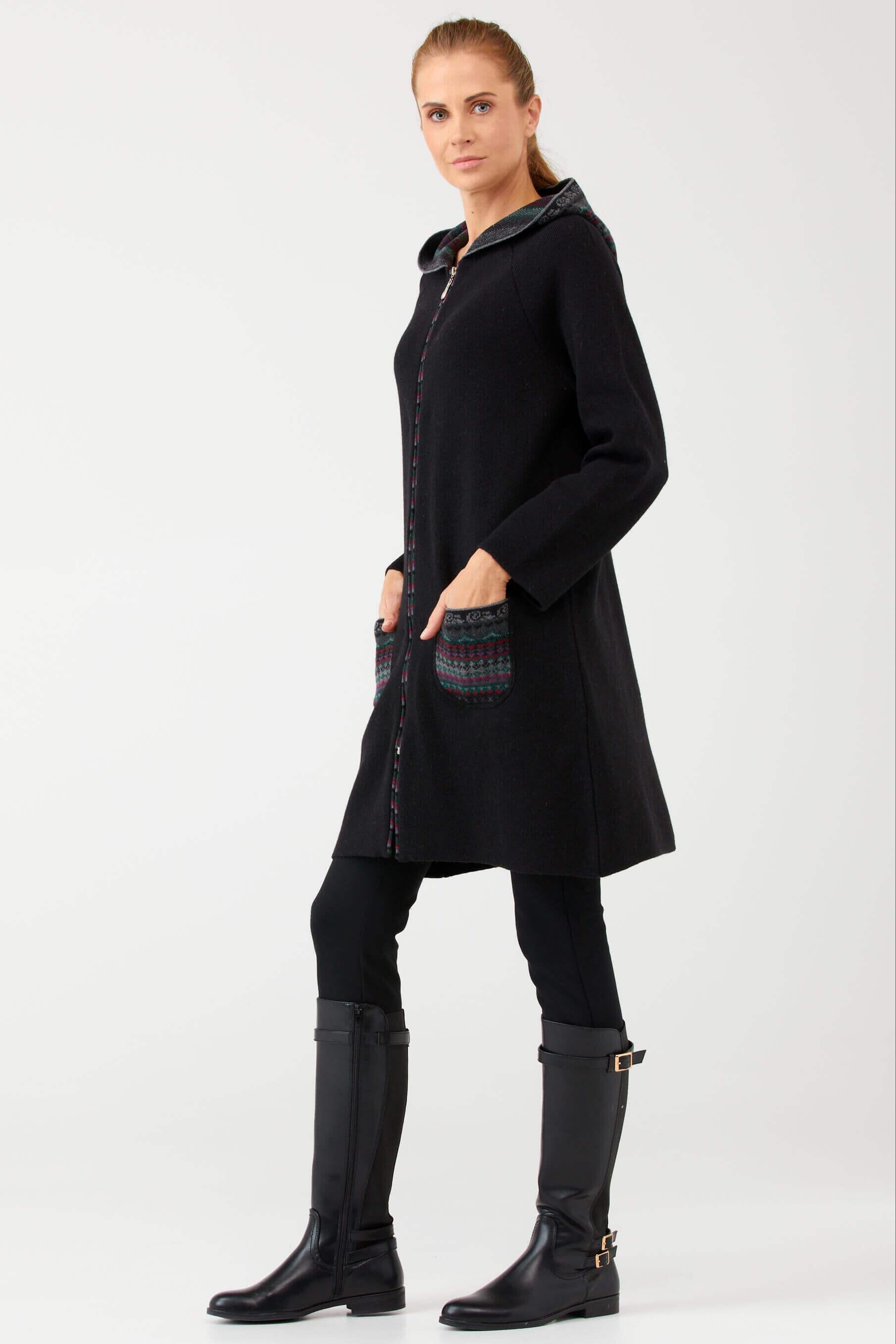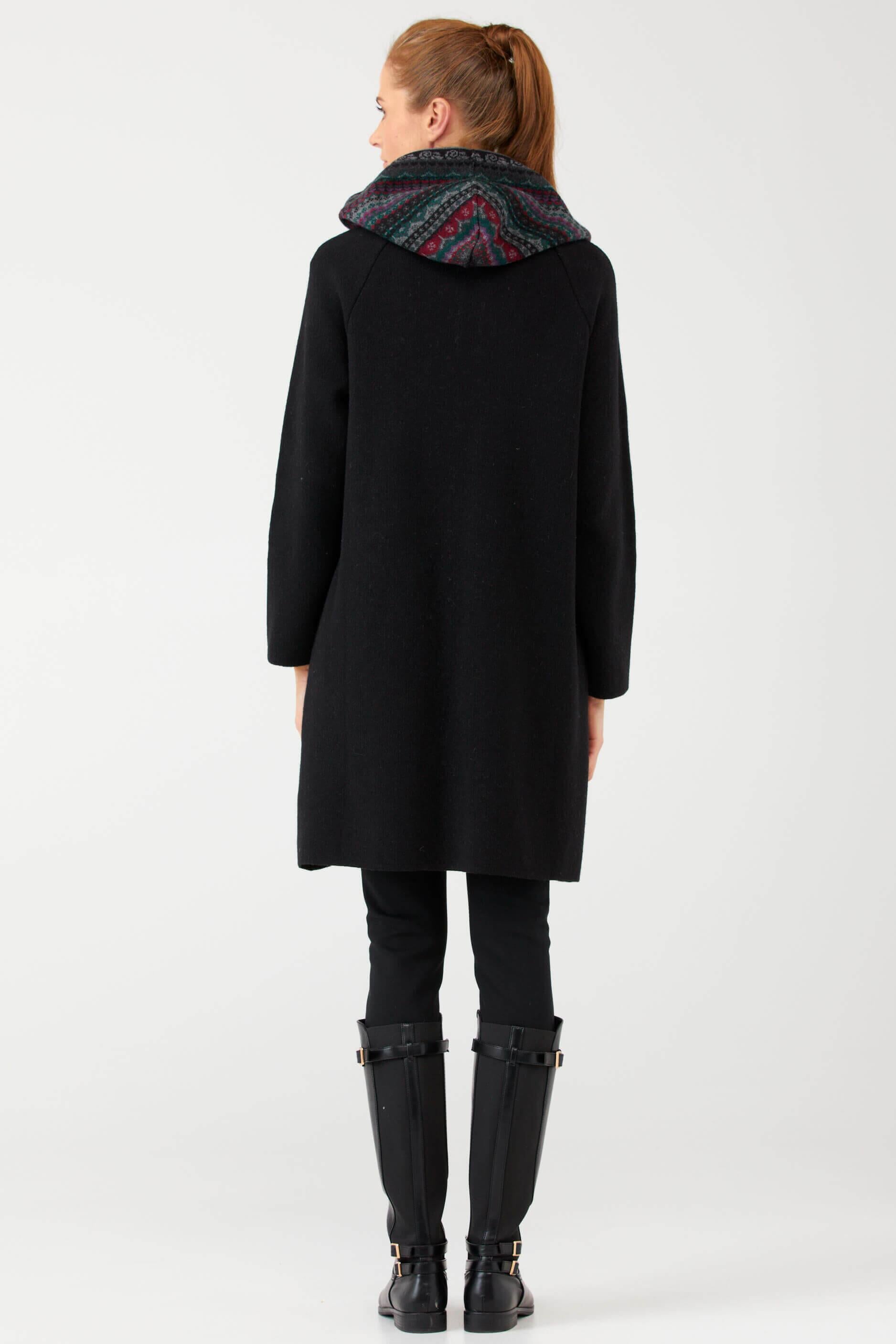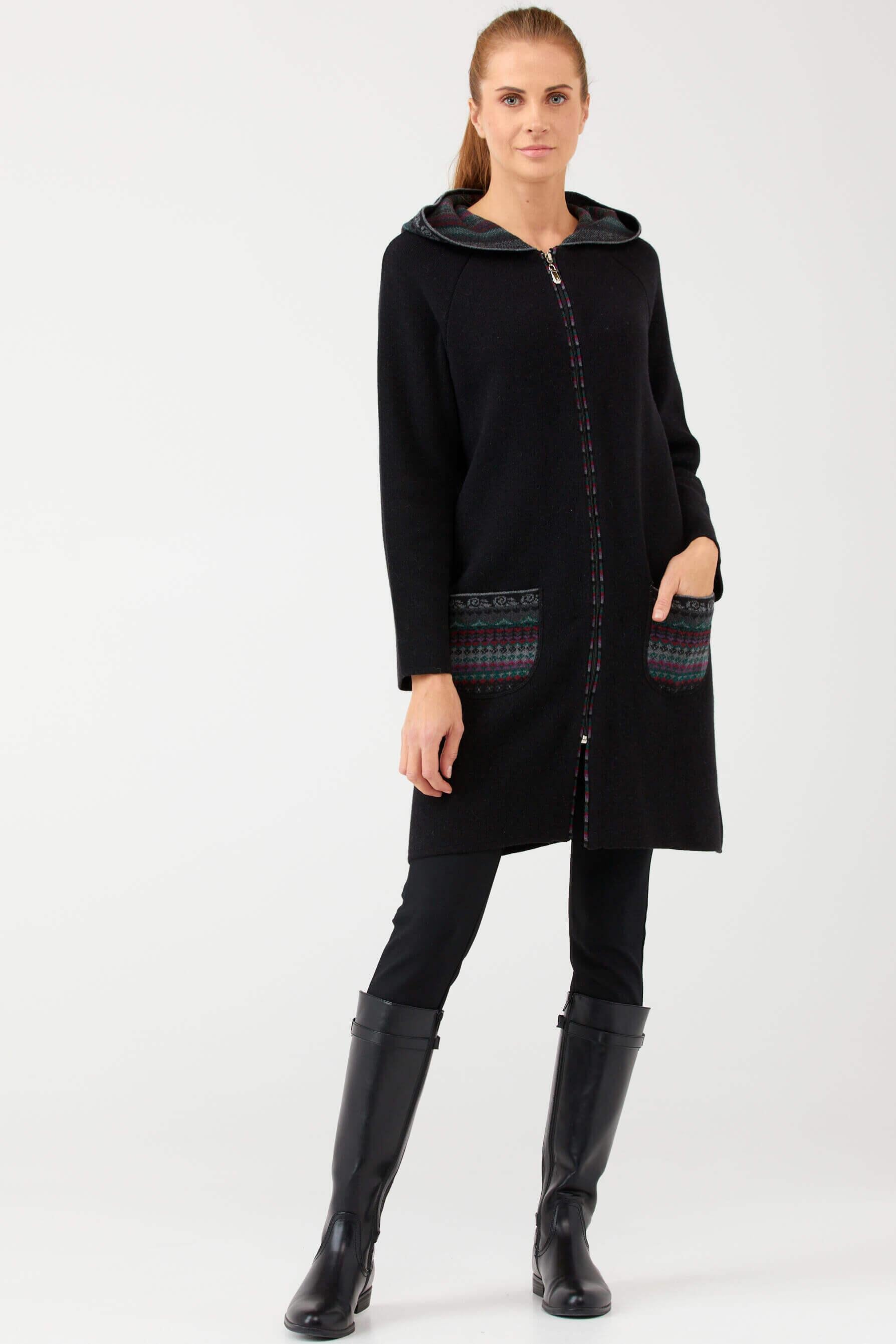 Kapüşonlu, uzun kol, fermuar kapaması ile kullanım kolaylığı sunan triko ceketin, kapüşonu ve ceplerinde etnik deseni bulunuyor.