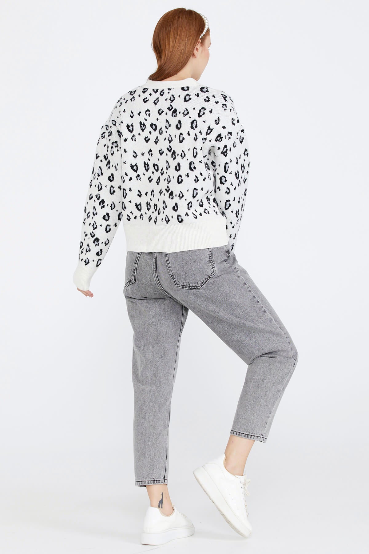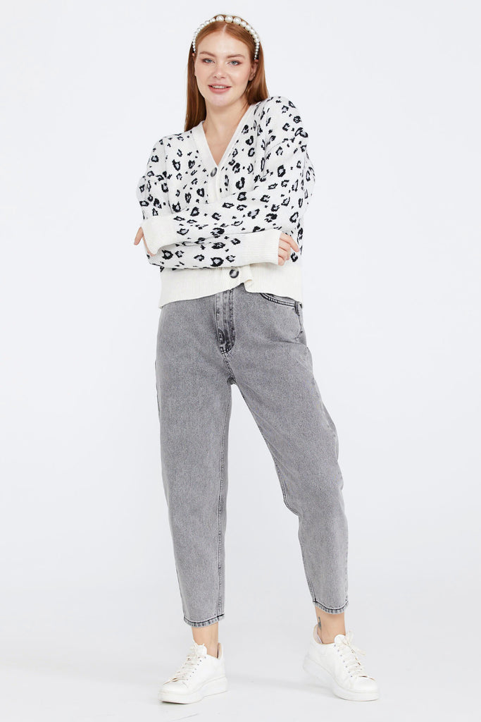 Kadın Leopar Desenli Triko Hırka - Kemik - Siyah