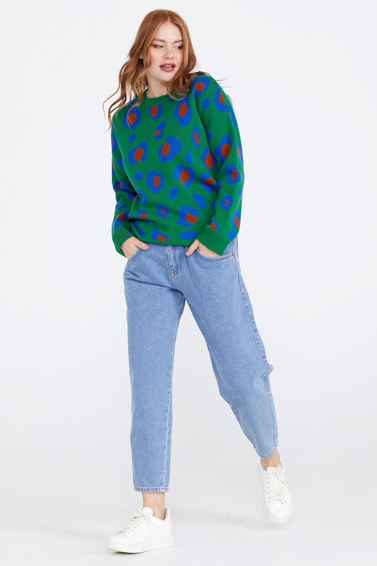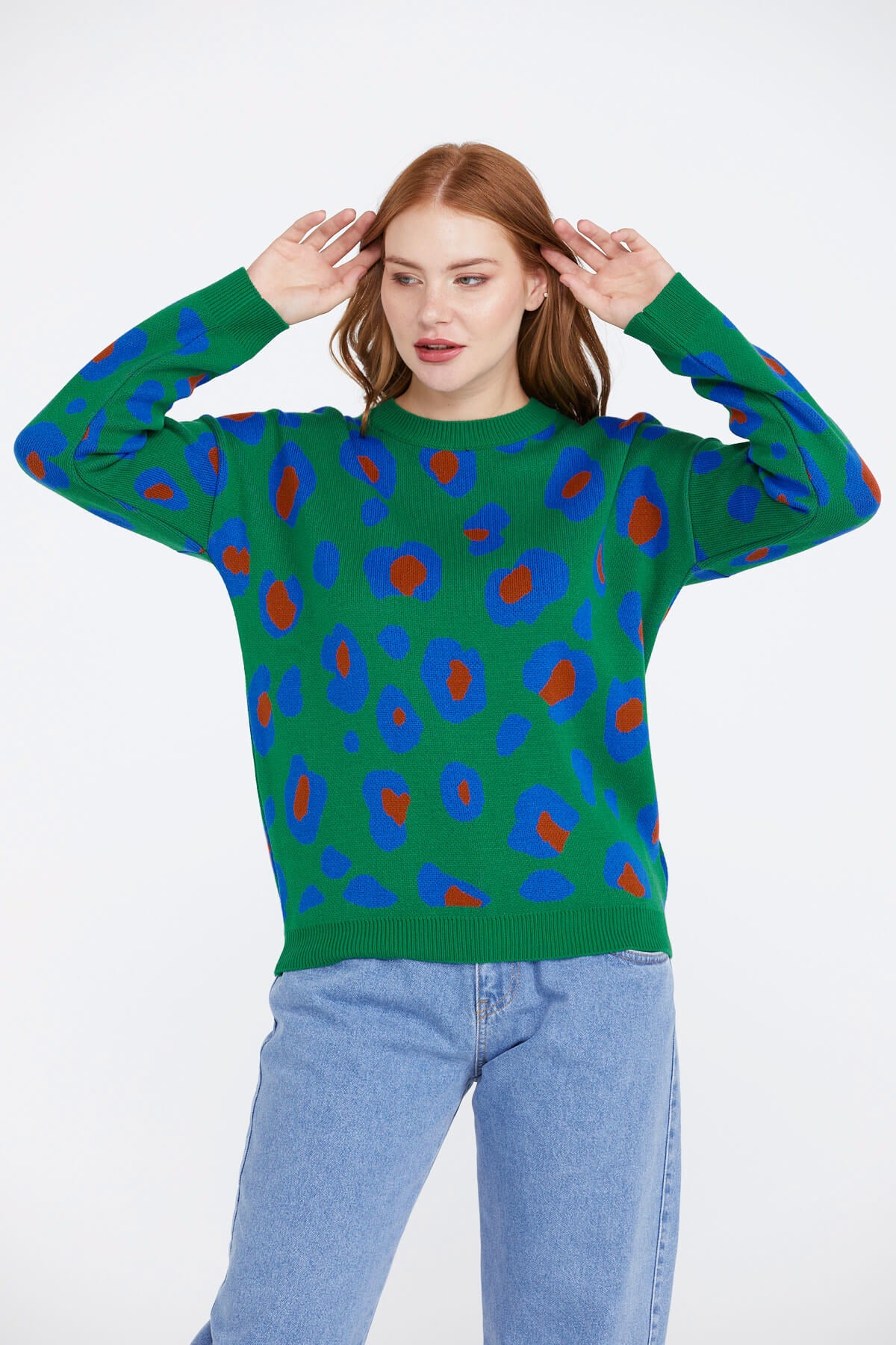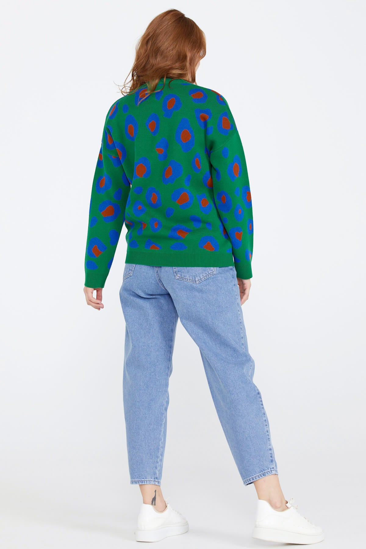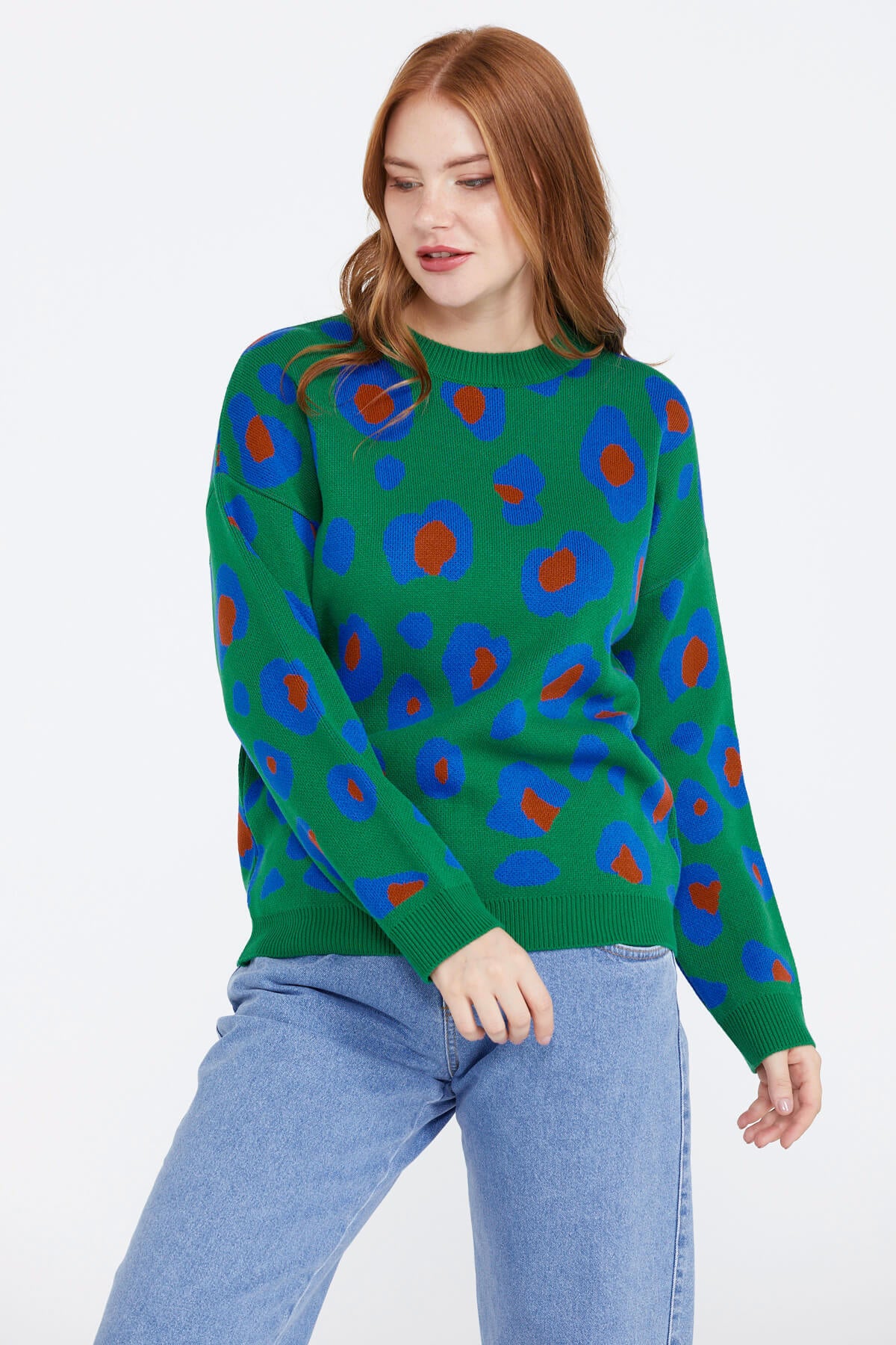 Kadın Leopar Desenli Triko Kazak - Yeşil