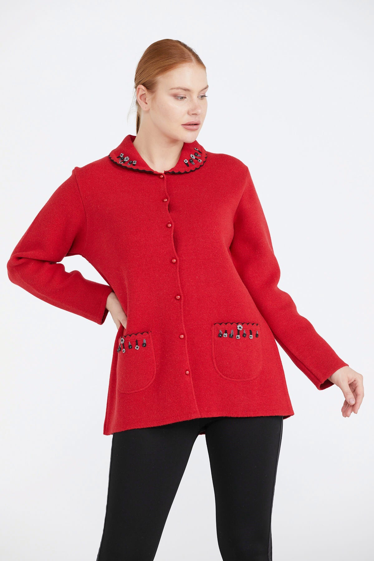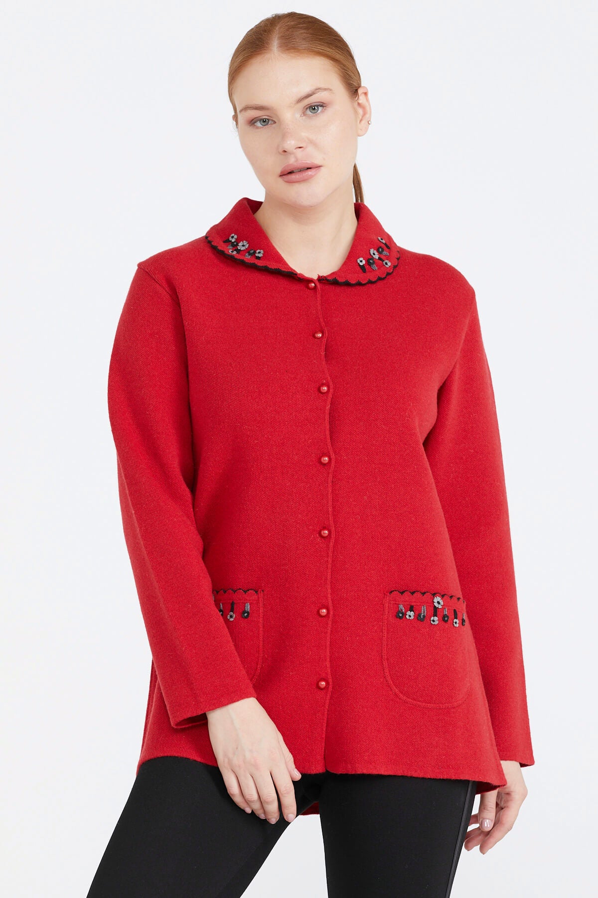 Kadın Polo Yaka Cepli Nakışlı Triko Ceket - Kırmızı