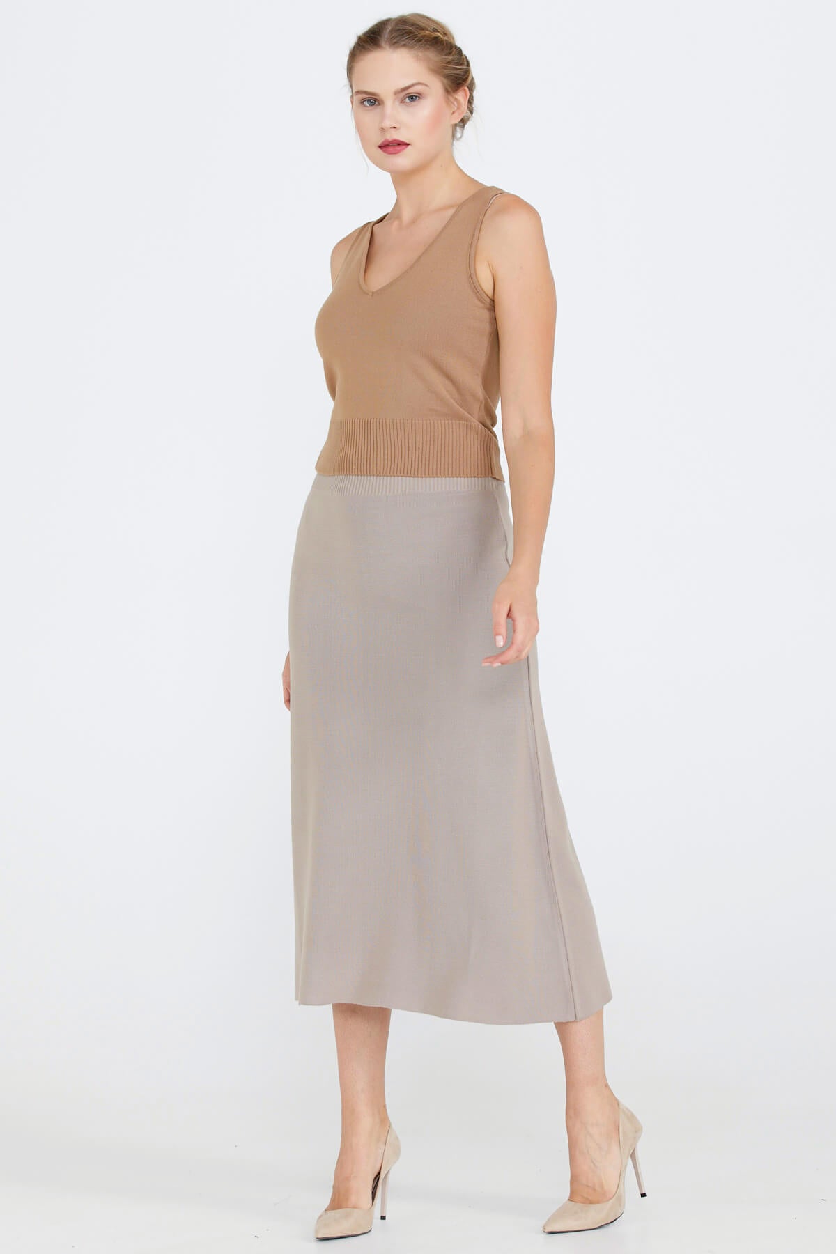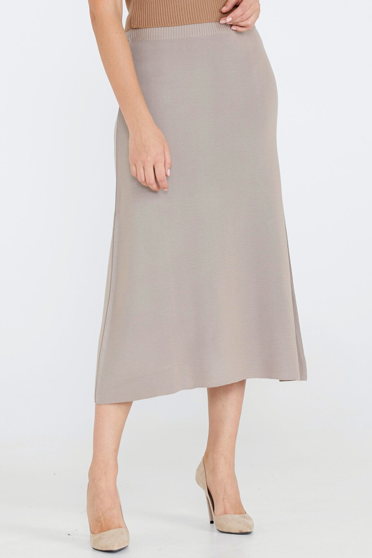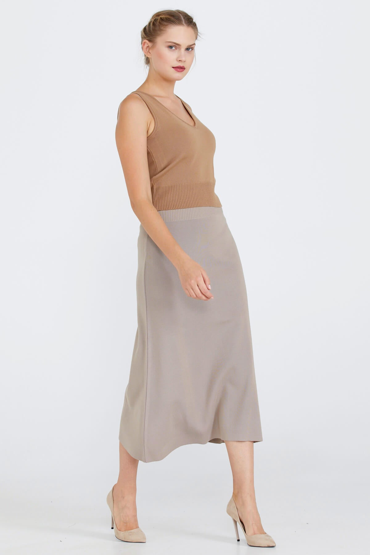 Sade formuyla ön plana çıkan, bel kısmı lastik örgülü triko etek.