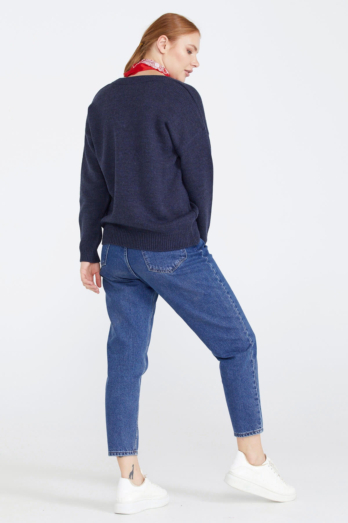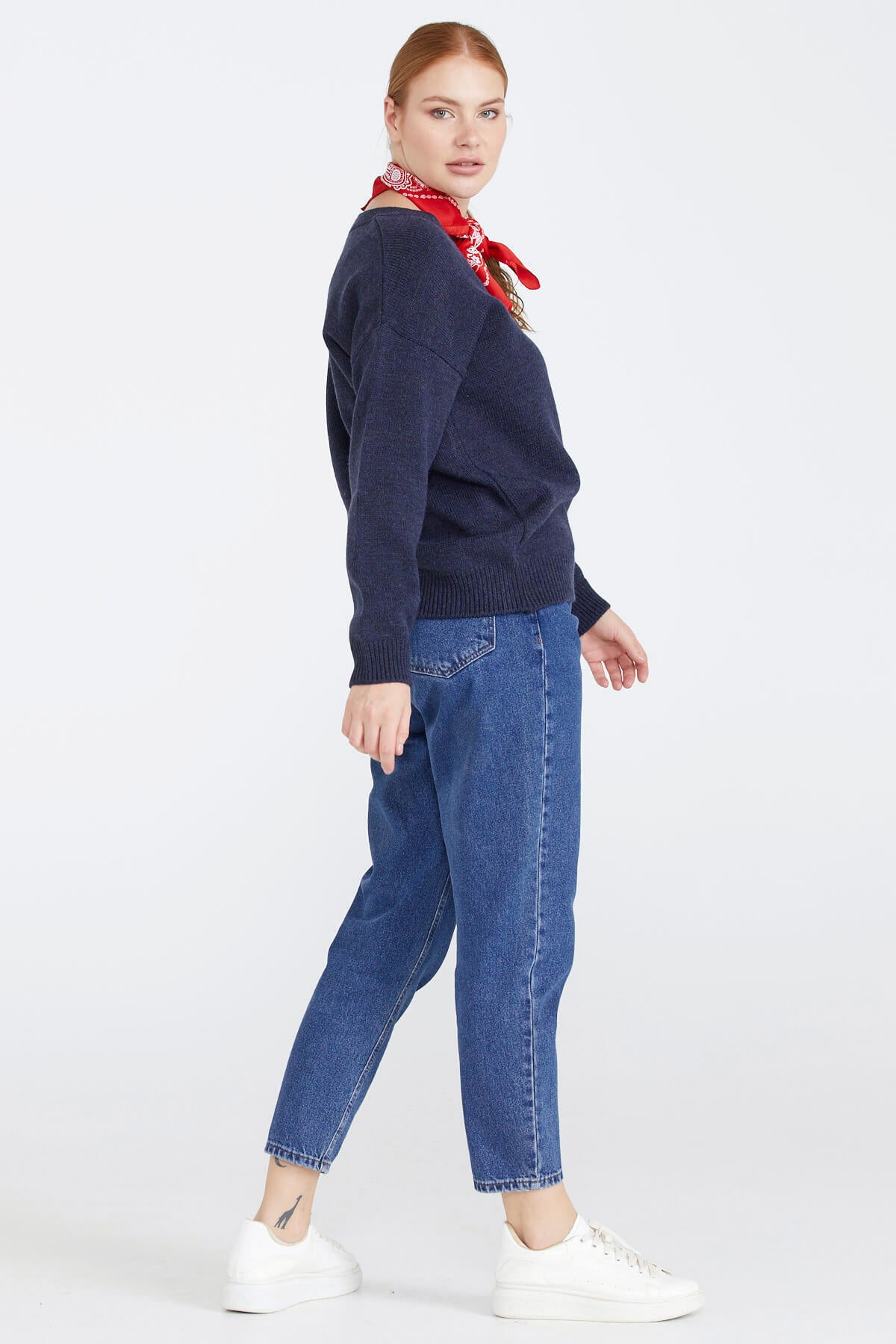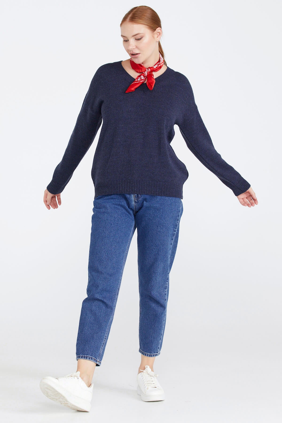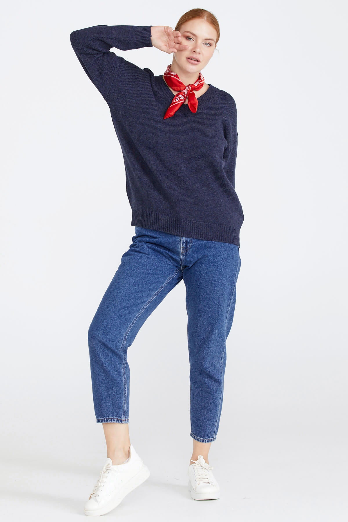 Triko kazak, v yaka ve uzun kol detayları ile buluşuyor. Basic kazak, yakası, manşetleri ve etek ucunda yer alan lastik örgü detayı ile sportif bir stile de vurgu yapıyor.